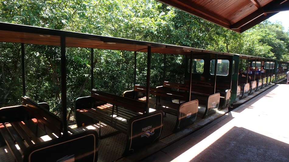 Nous arrivons à « ESTACION CATARATAS », point de départ du petit train. Diling … Diling ! La cloche retentis … Le petit train rentre en gare. Nous prenons place dans les wagons ouverts.