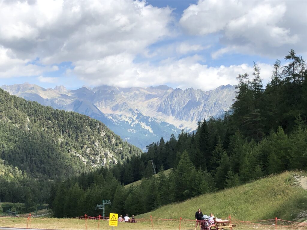 Nous nous garons dans un grand parking au pied du télésiège. A proximité, un espace pique nique est aménagé avec table et bancs en bois. Nous nous y installons pour déjeuner. Le décor est magnifique.