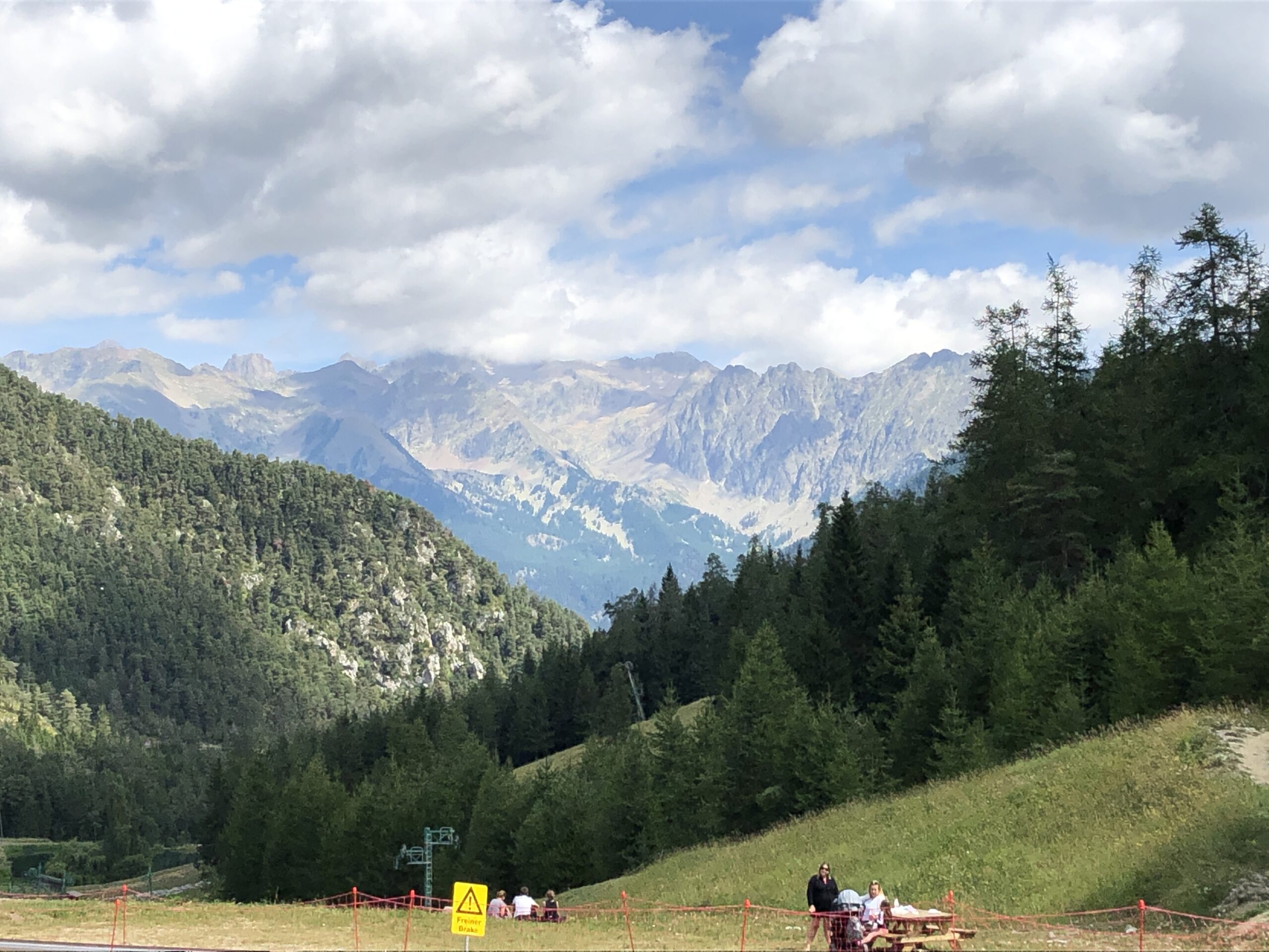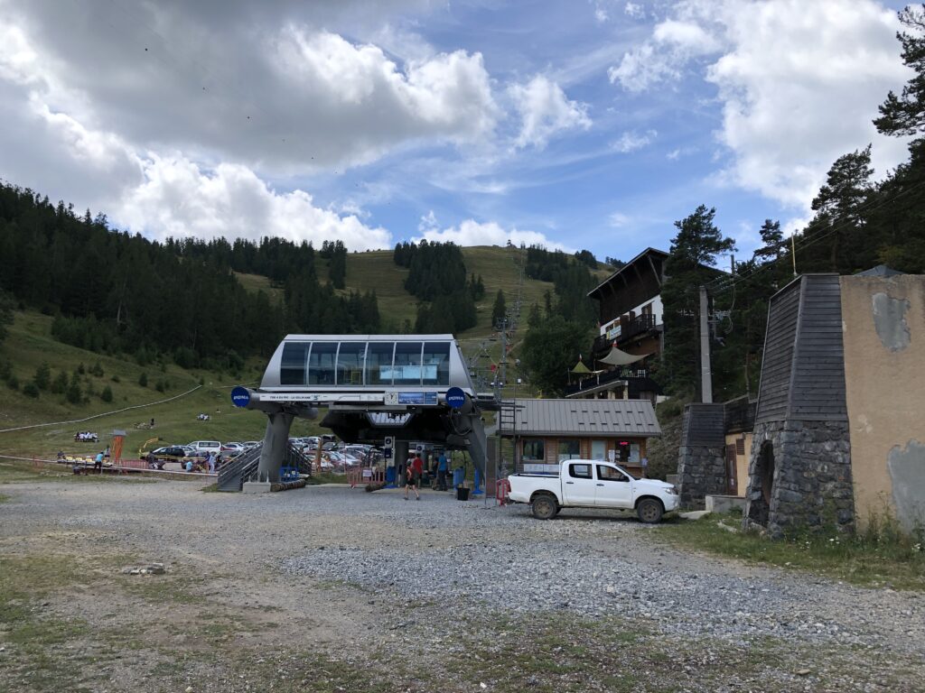 Nous arrivons à la Colmiane vers 11H30 en nous arrêtant sur la route pour acheter de quoi faire un pique nique. Le télésiège qui nous montera au départ de la tyrolienne est bien indiqué. On n’a qu’à suivre les pancartes.
