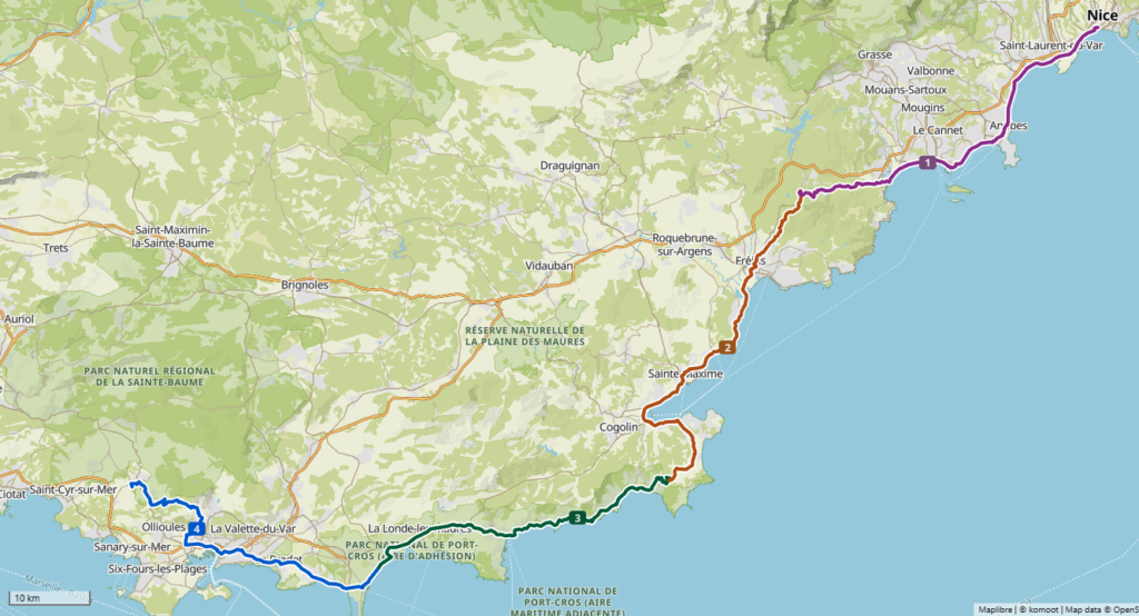 J’ai pris un aller simple TOULON – NICE en TER direct avec wagon vélo – Durée du voyage 1H54 – Prix: 30.30 Euros. Le parcours se déroulera en 4 étapes de Nice au Beausset. J’ai réservé une nuit d’hôtel pour chaque étape.