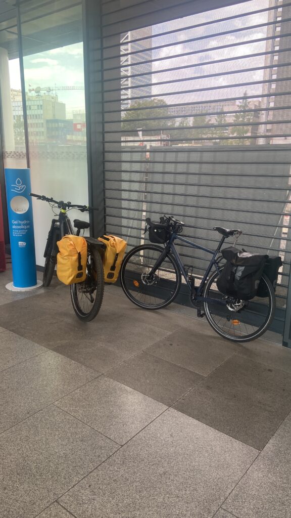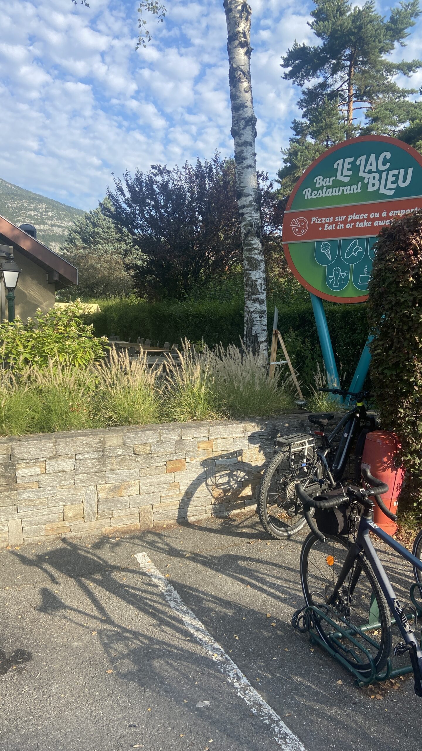 8:00 On se réveille … petit coup d’œil à la fenêtre … le ciel est bleu et les vélos sont toujours là ! On prend notre petit déjeuner dans un camping à 3 km de notre logement.