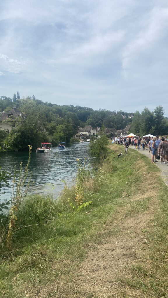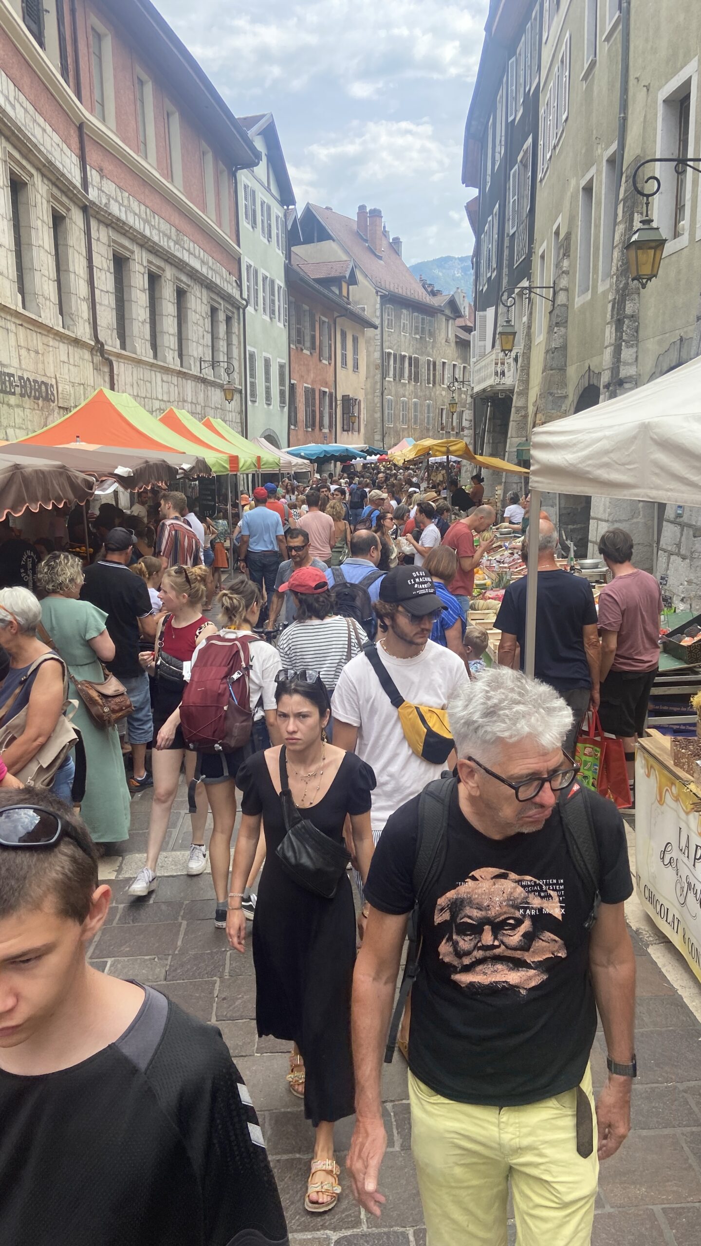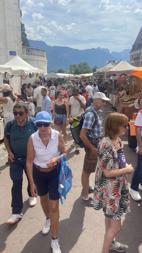 10:00 C’est Dimanche, jour de marché à Annecy. Nous parcourons les 19 km (quand on aime, on compte pas !) pour nous rendre encore une fois dans le vieux Annecy et le voir. On s’achète de quoi pique niquer : tomme de chèvre, tomme de gruyère , 4 petits saucissons et du raisin.