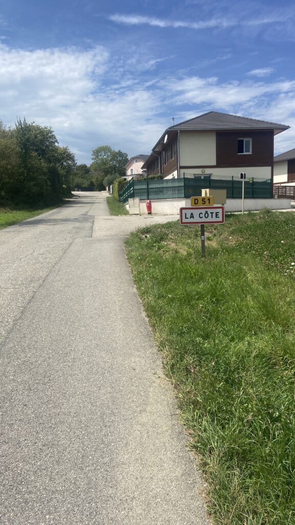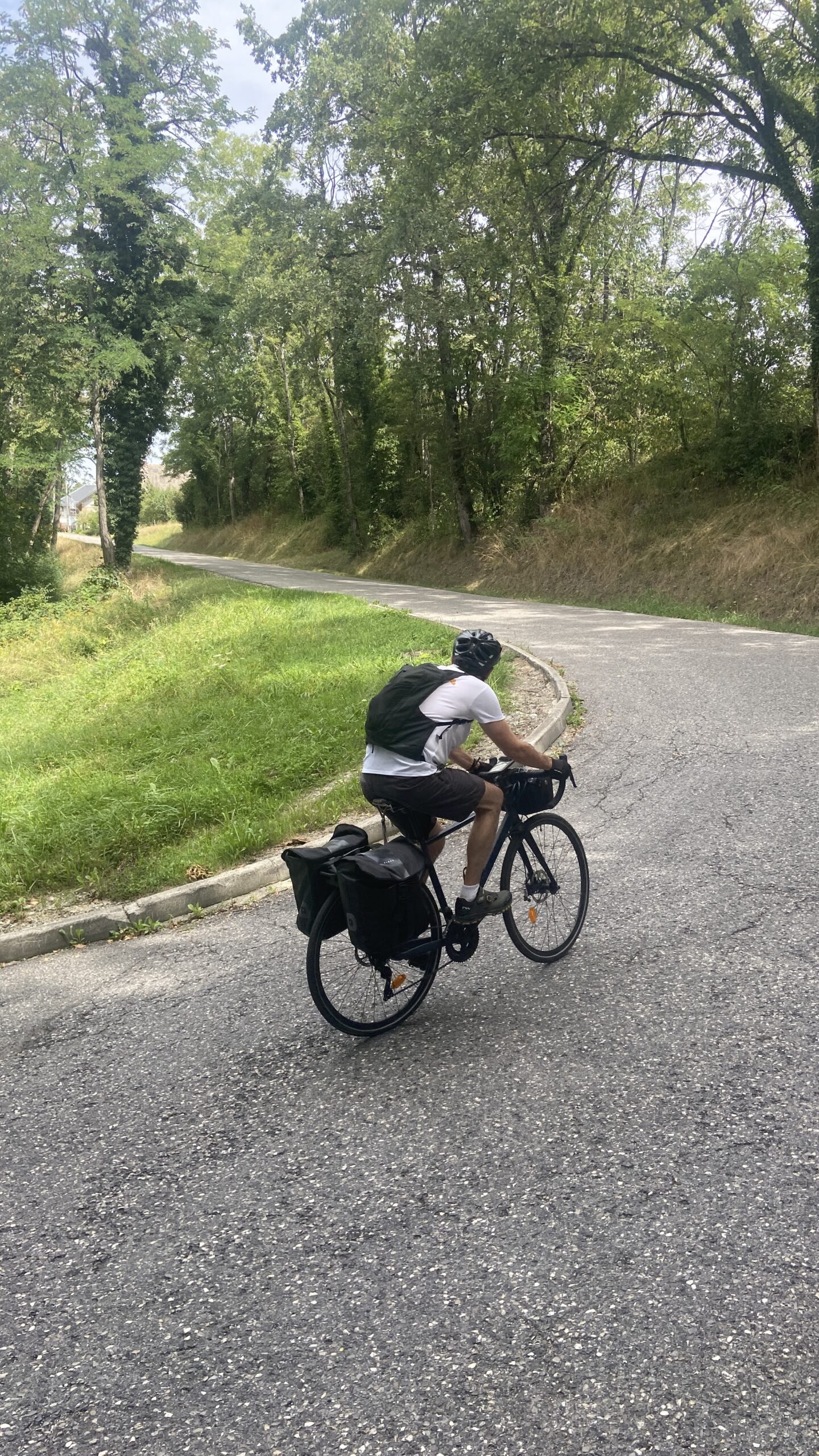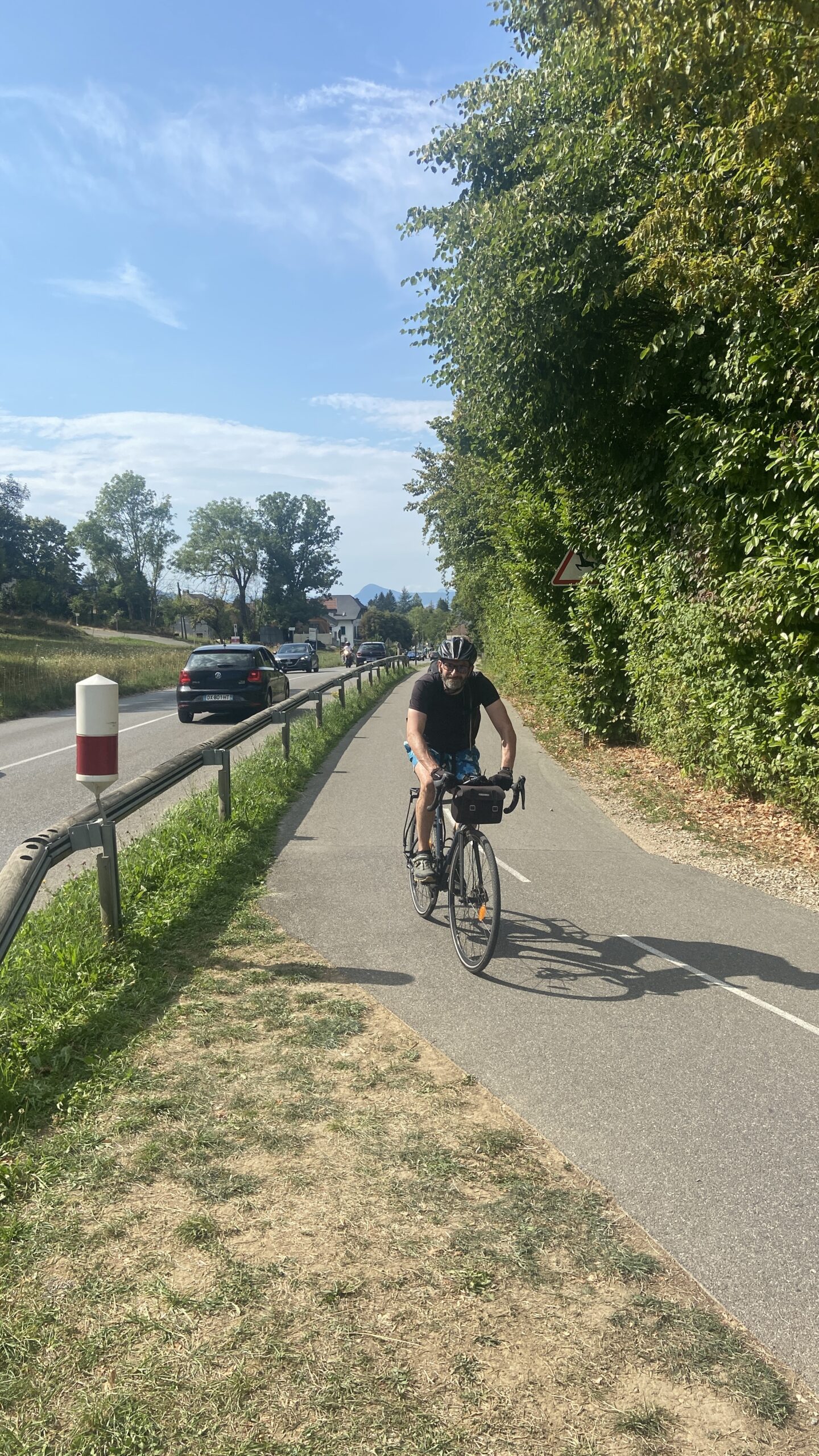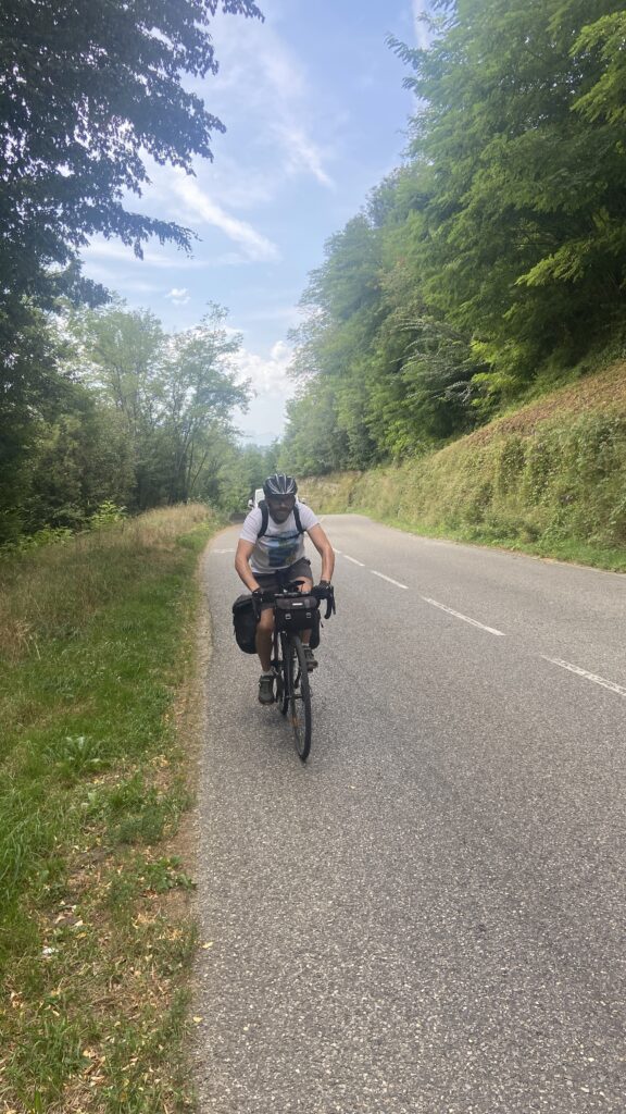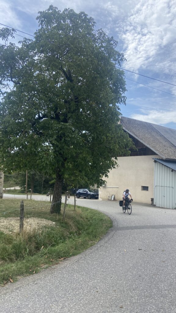 Mais à partir de la sortie d’Annecy les choses se corsent … ça grimpe ! Ca commence avec une pente à 2%. Galéjade pour moi avec mon assistance électrique mais une bonne mise en jambe pour Franck qui n’a pas d’assistance. Franck est un warrior et ce n’est pas ça qui l’arrête malgré ces 2 sacoches qui surchargent pas mal son vélo.