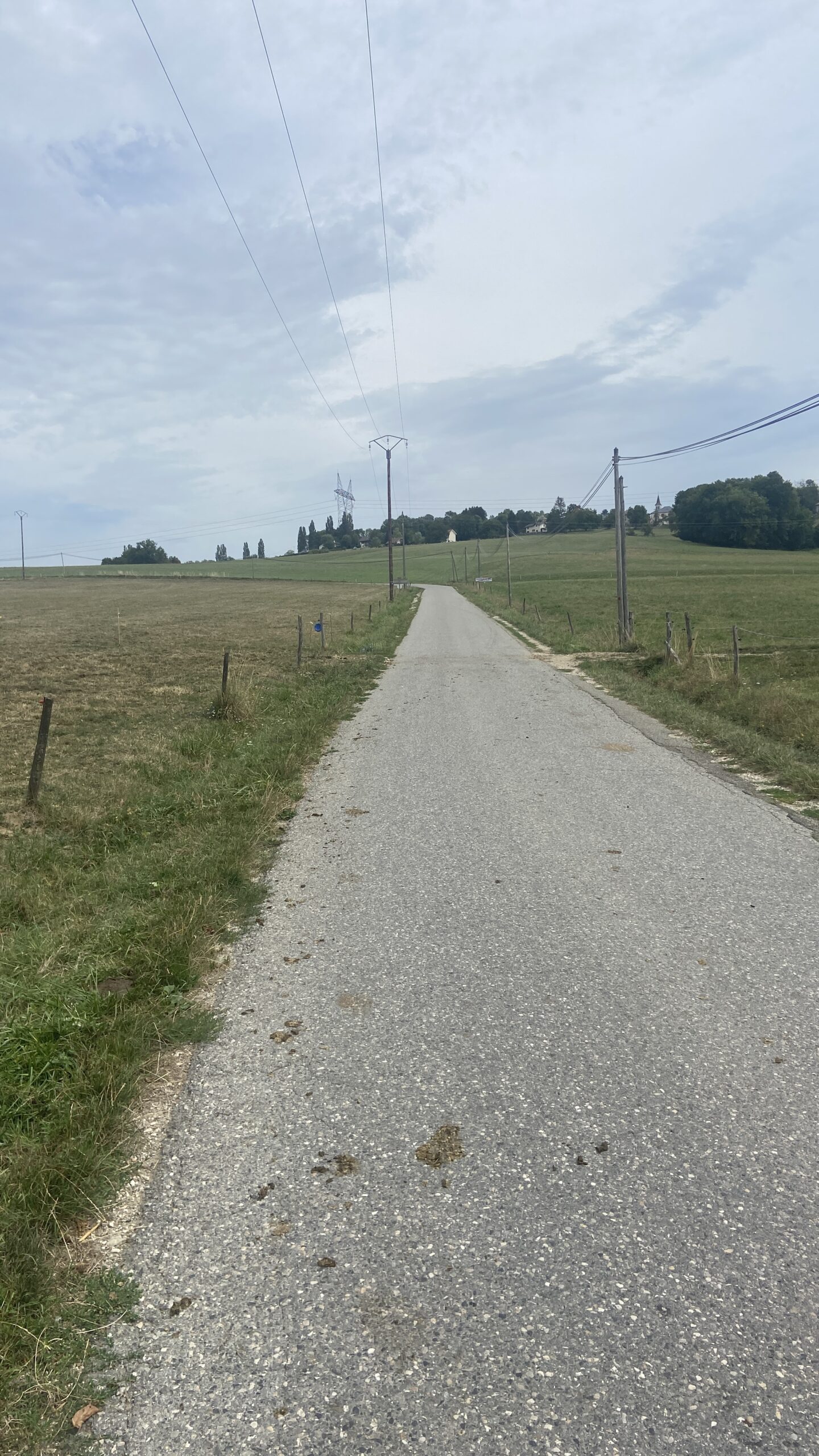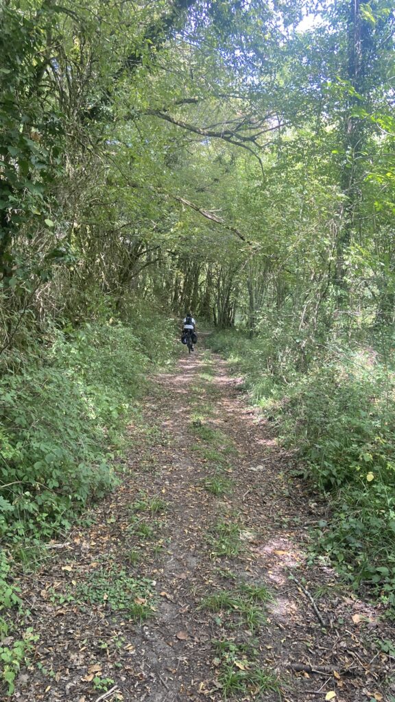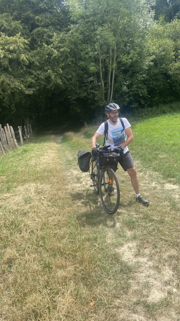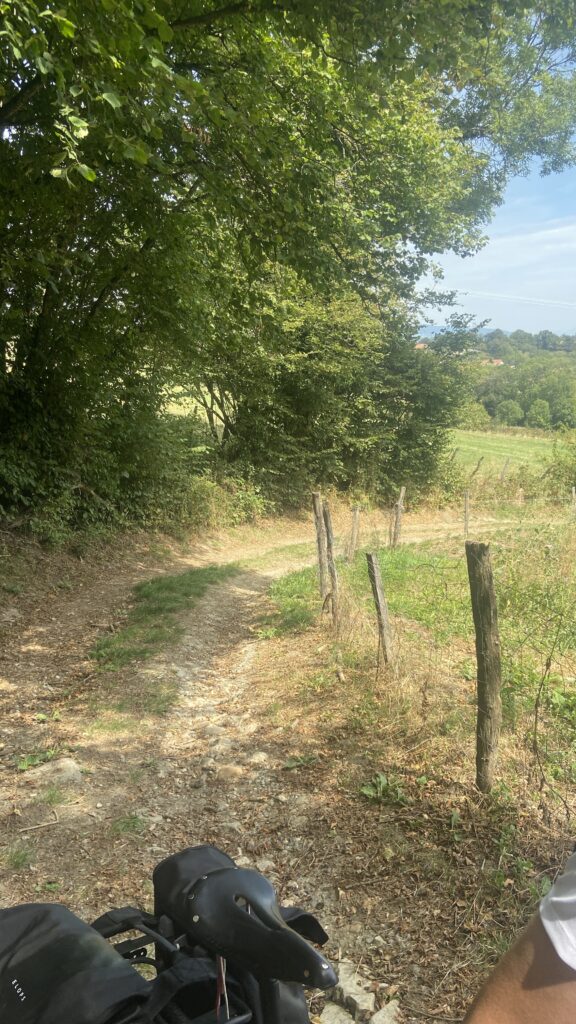 C’est seulement quand le GPS nous fait monter par un chemin de terre très cabossé que Franck finit par pousser le vélo, ne pouvant pas faire autrement.