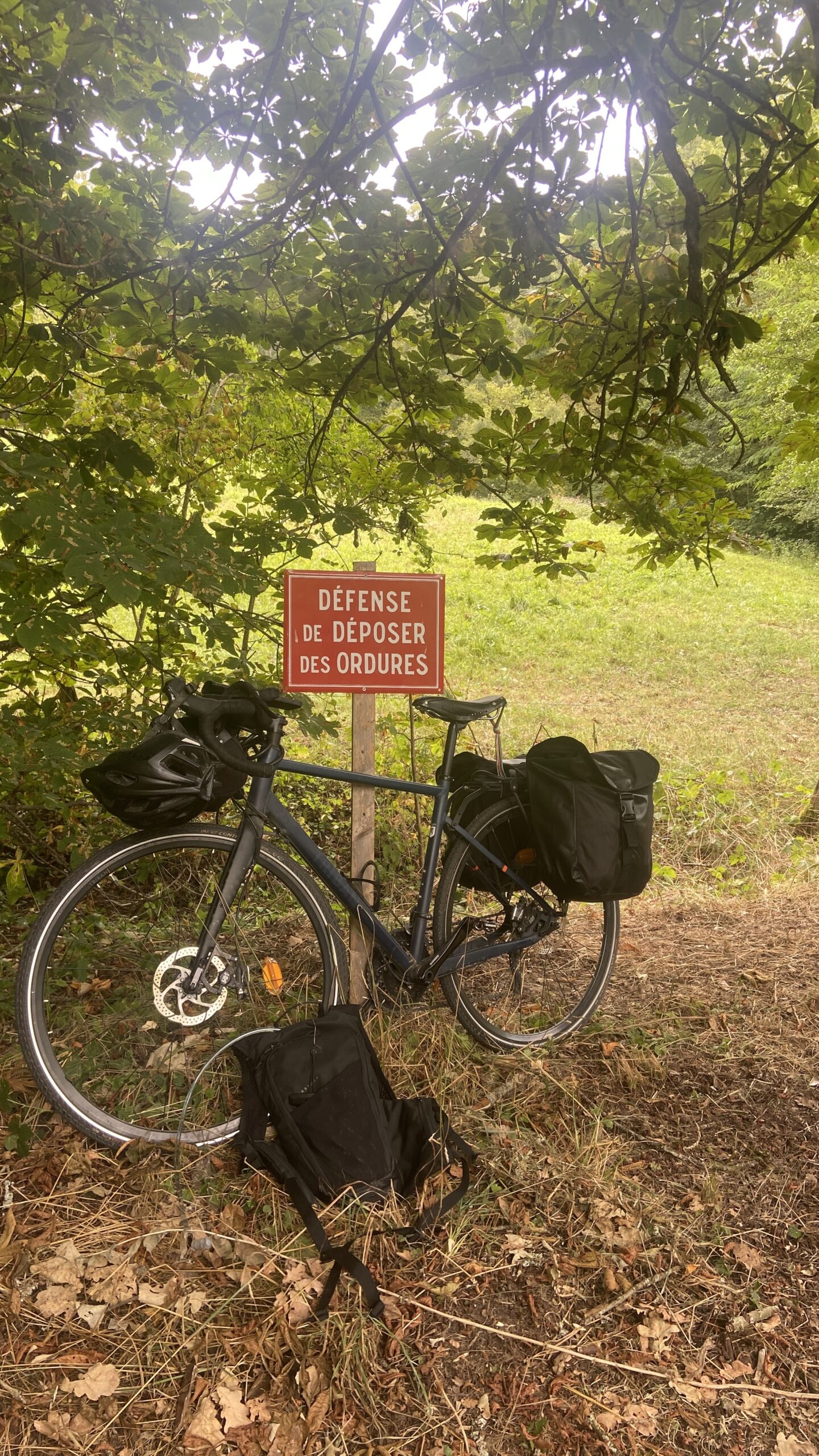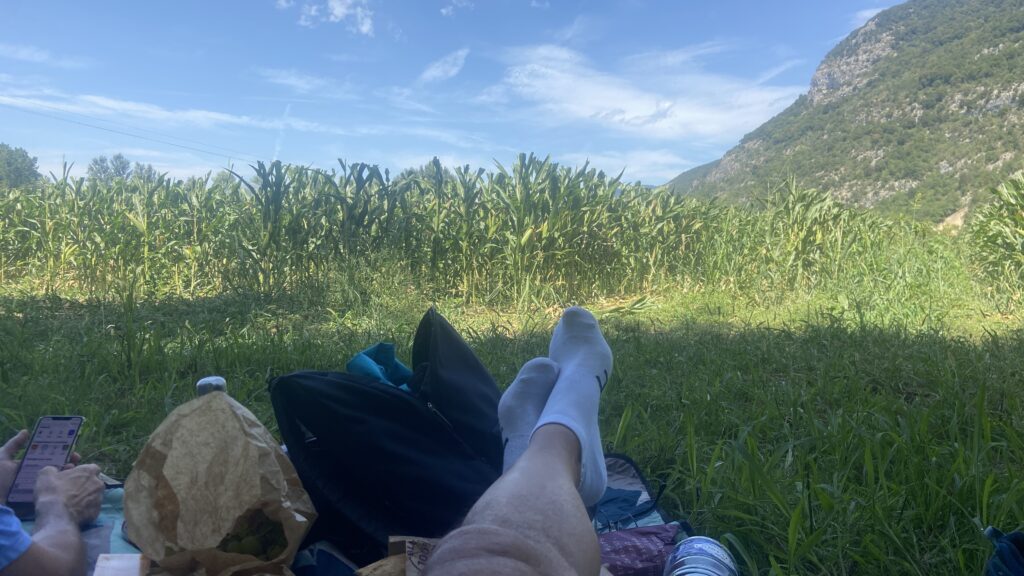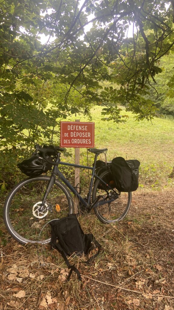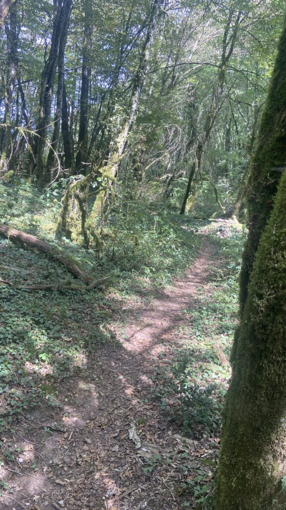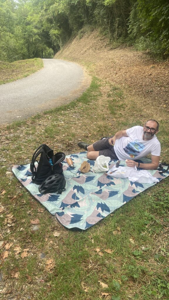 Nous nous arrêtons vers 13H00 dans un sous bois pour déjeuner. On déroule notre plaid dans un petit carré d’herbe au bord d’un cours d’eau et on s’installe pour déguster les fromages et saucissons qu’ils nous restent de la veille. Le cadre est magnifique. Les oiseaux jouent dans les arbres. Un moment de détente dans les bras de dame nature.