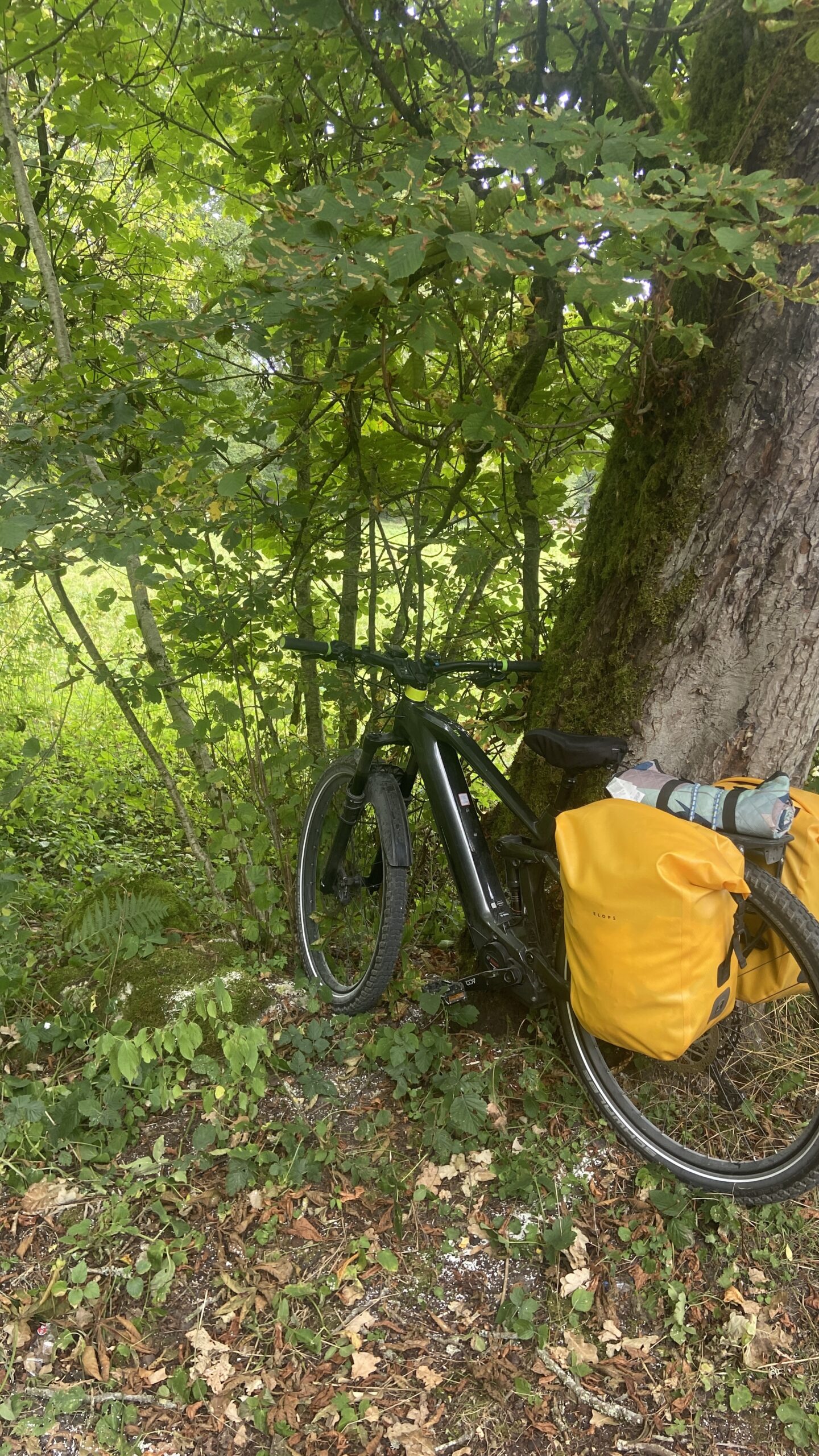 Pour retourner au gite, la belle descente devient une belle montée ! C’est la montée de trop ! Heureusement nous avions une sangle. La batterie de mon vélo est à 50%. Opération tractage ! En mode TURBO, nous remontons les 3.5 km, sans problème !