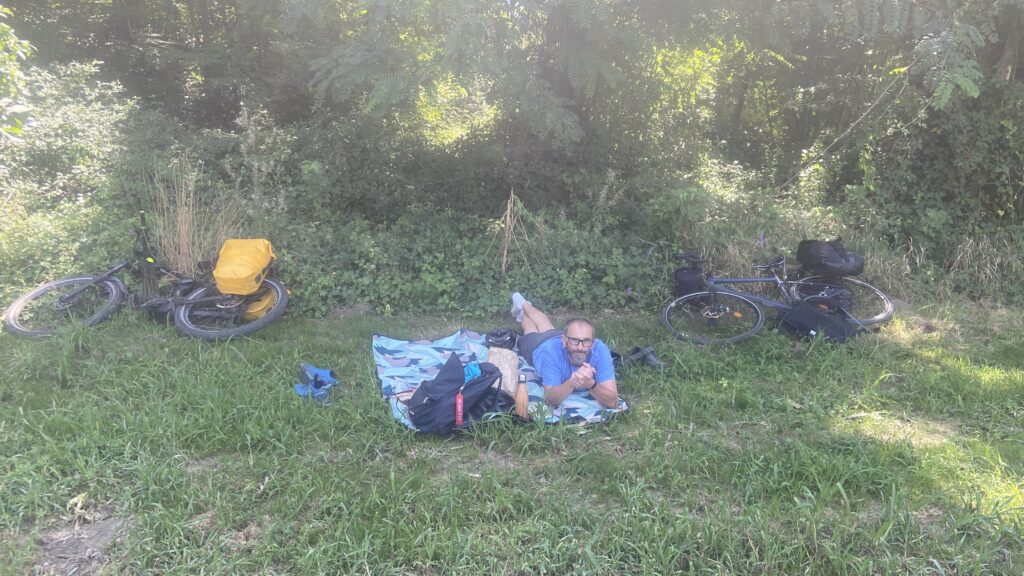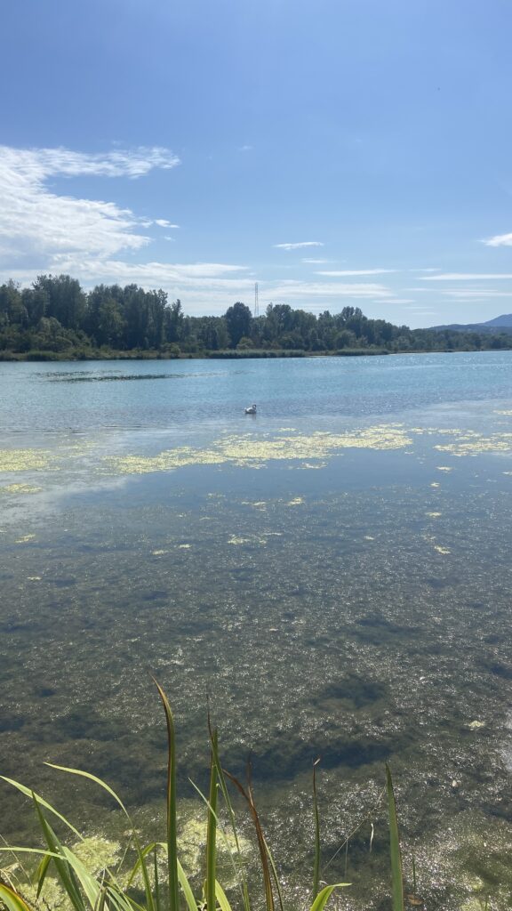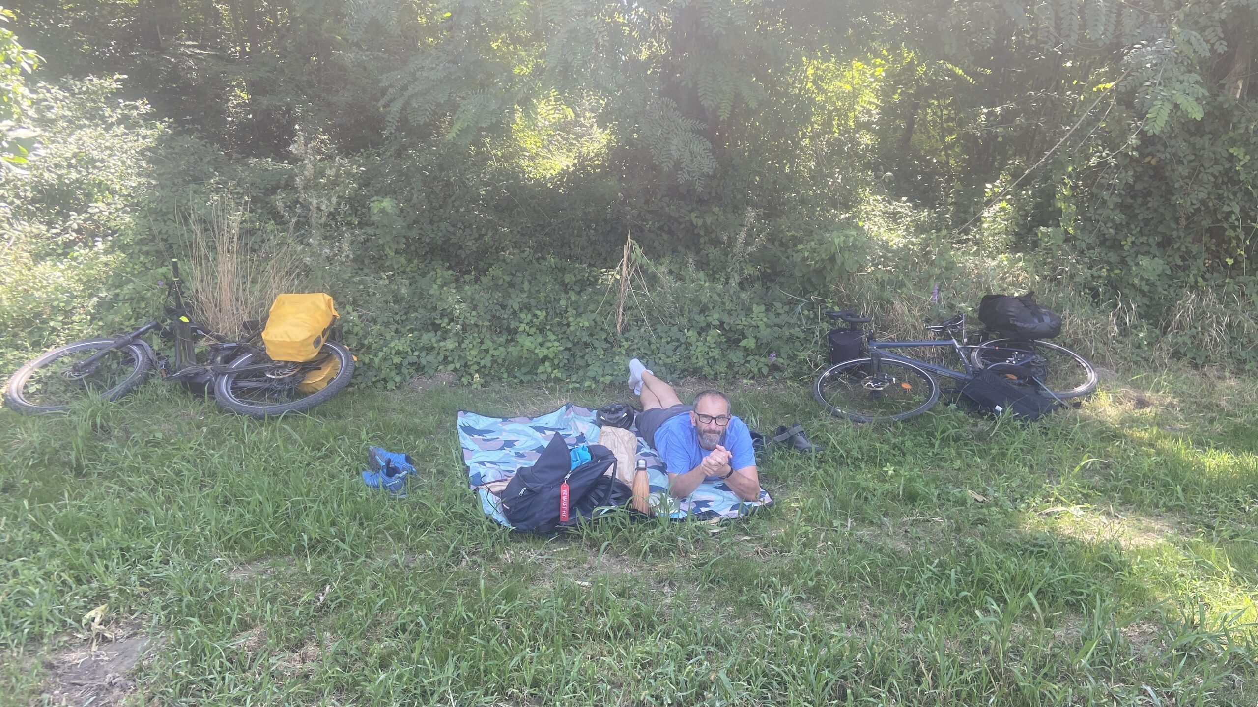 14:30 Le soleil est revenu. nous voilà parti pour un tour de lac. Quelques kilomètres après le départ, on installe notre plaid au bord de l’eau sur un carré de gazon, à l’ombre d’un arbre. Un petit plongeon avant de nous installer confortablement pour déjeuner. Le cadre est idyllique, fromages et saucissons sont excellents … elle n’est pas belle la vie !
