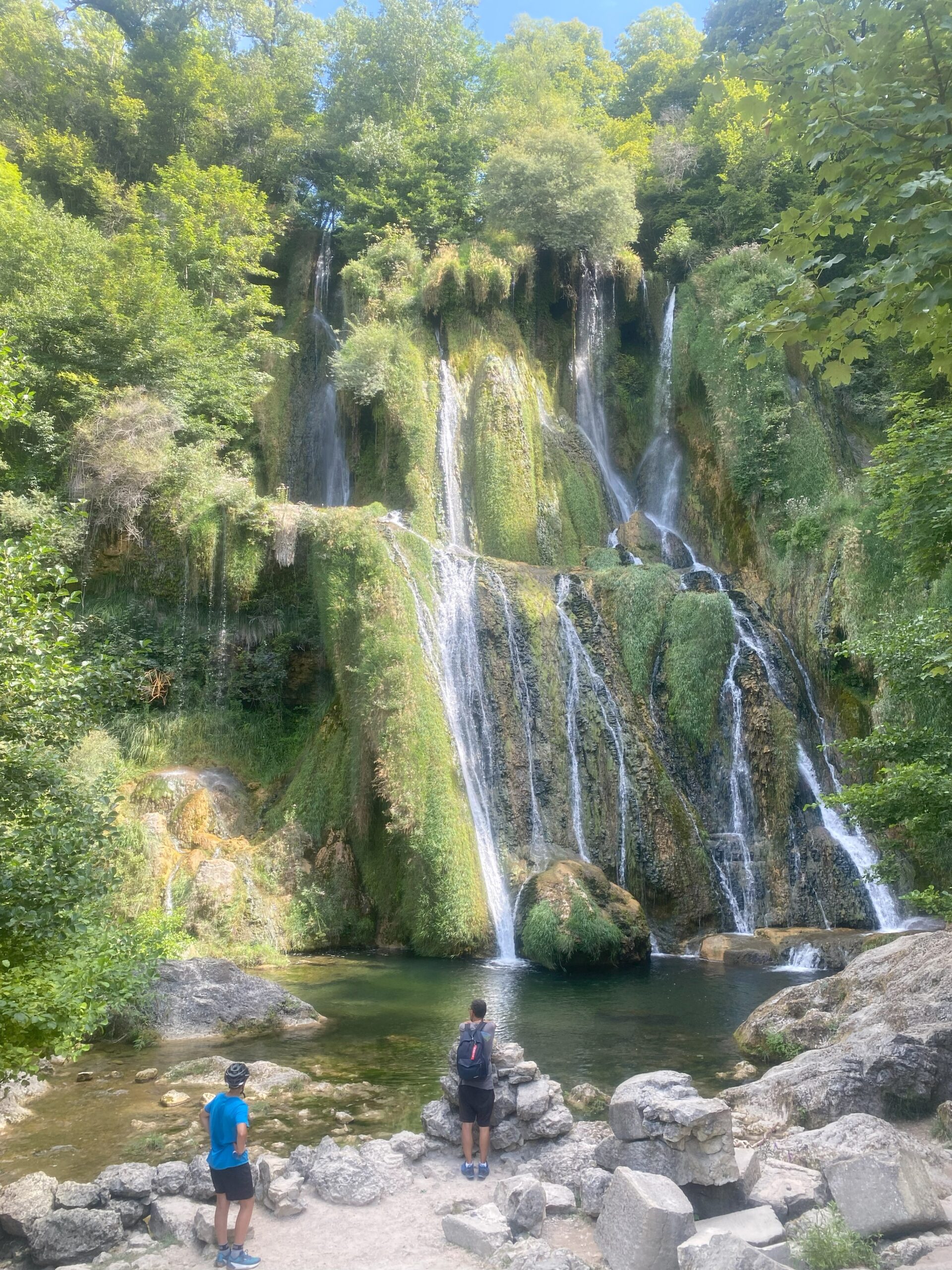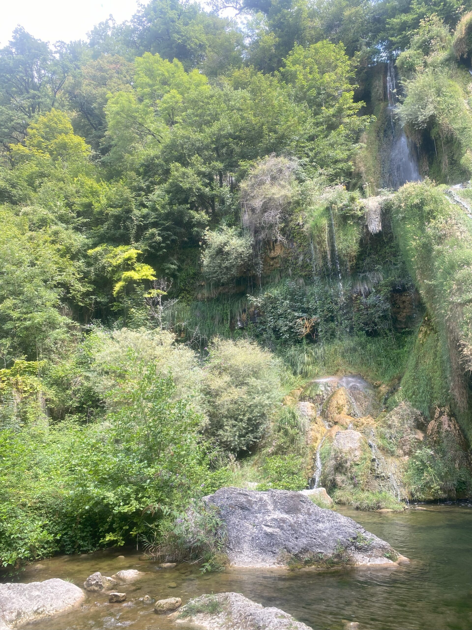 Pour préserver la cascade , la baignade, le pique-nique et les chiens y sont interdits. Nous ne pouvons donc pas nous installer à ses pieds comme prévu. Nous trouvons, un peu plus loin, un petit coin de nature pour étendre notre plaid et nous octroyer un moment de détente pour une pause déjeuner.