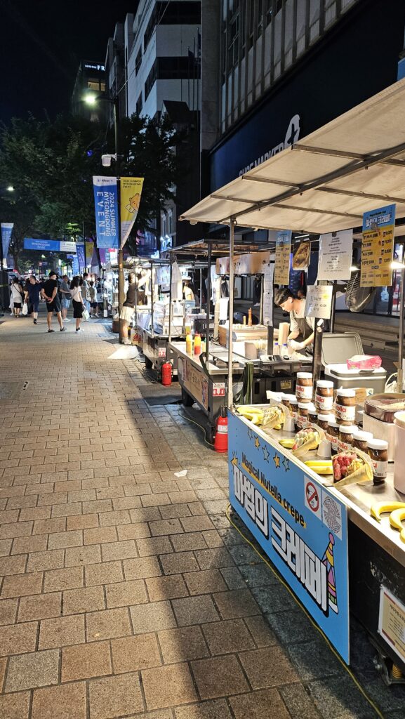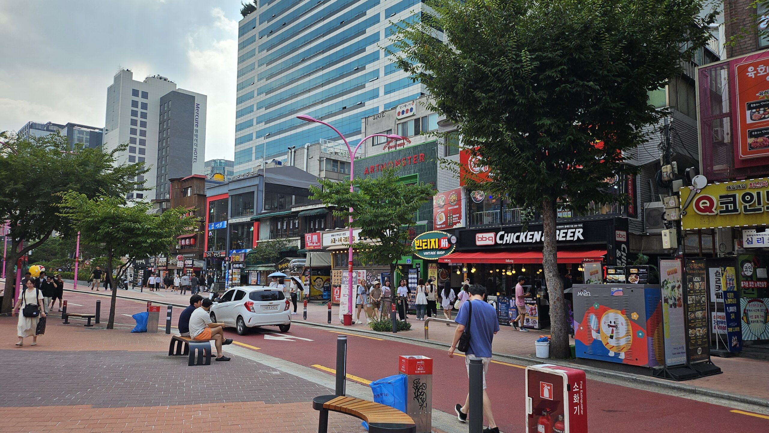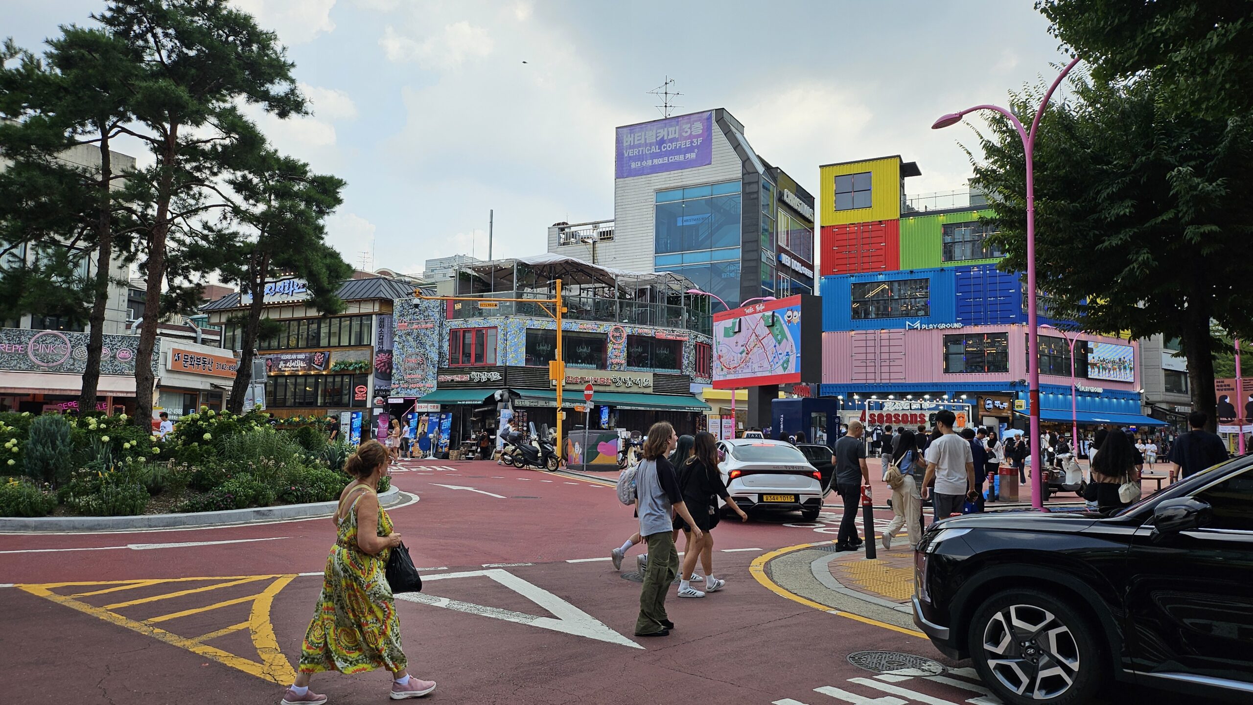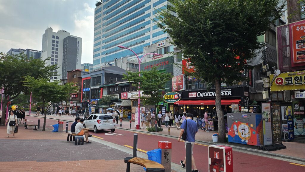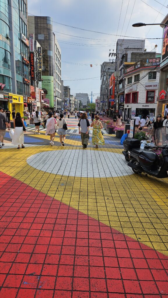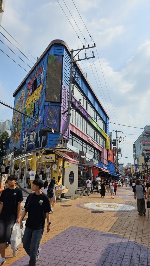 Après le déjeuner et un excellent café expresso, Mathias nous propose de visiter le quartier HONGDAE. Il entoure l’Université de Hongik et il est connu pour ses arts de rue et sa musique indépendante.