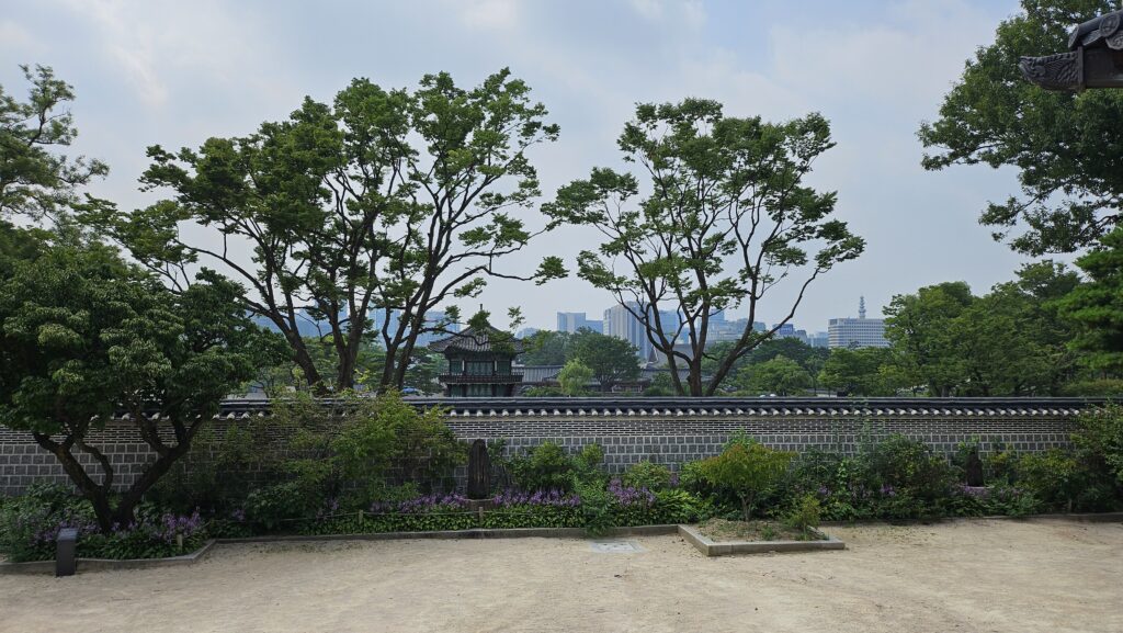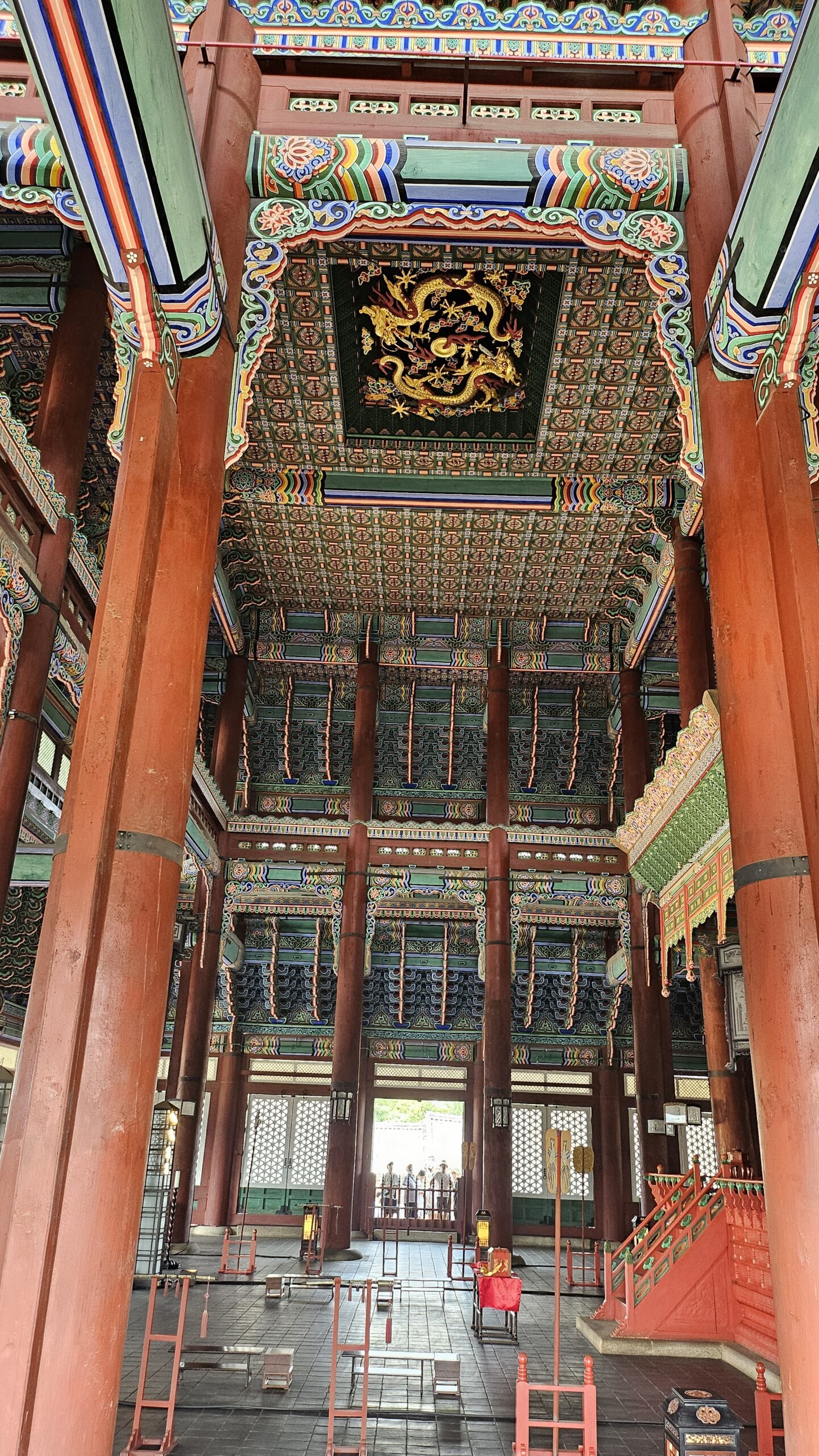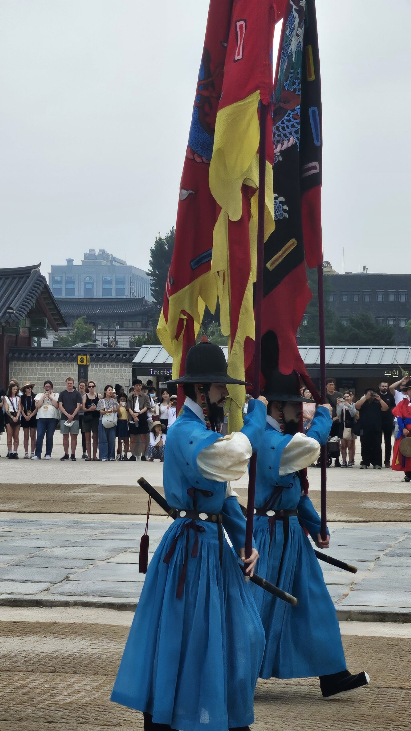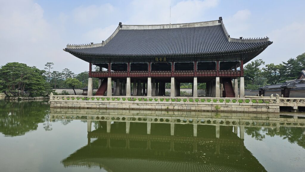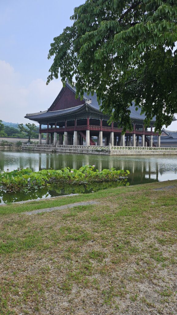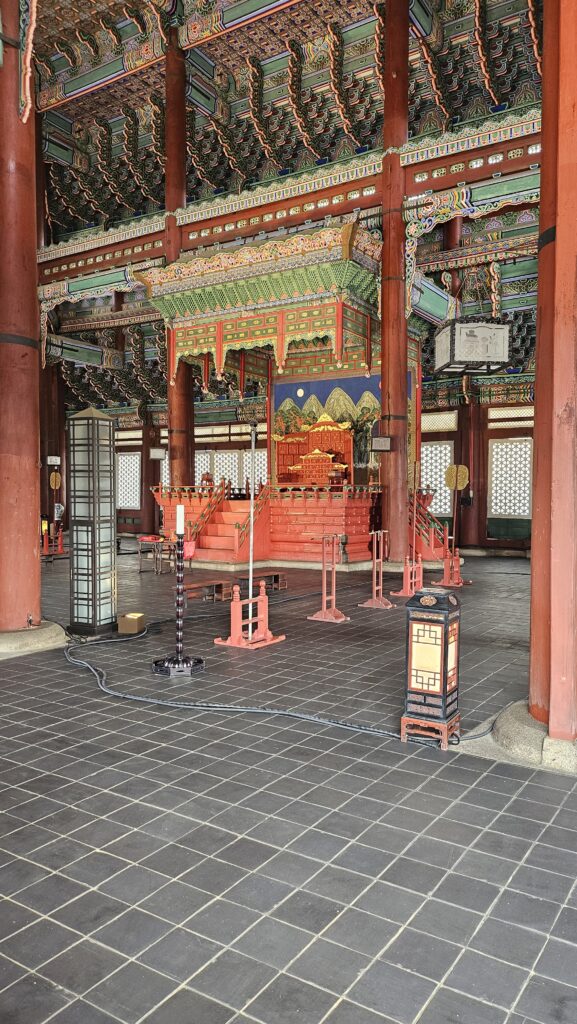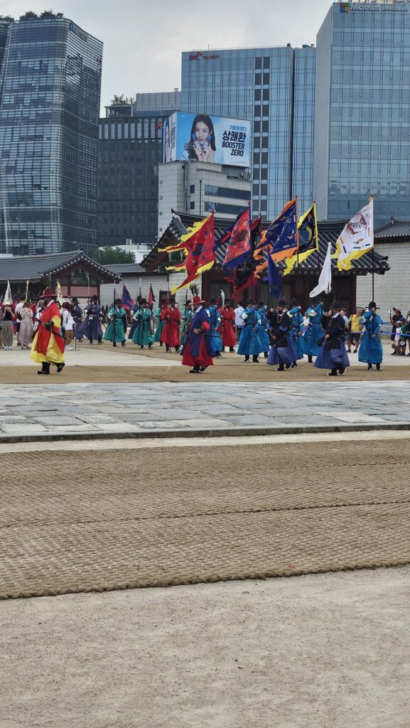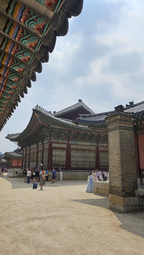 Après un petit déjeuner dans un salon de thé local, nous décidons de commencer notre visite par le palais de GYEONGBOKGUNG (BONHEUR RADIEUX). Il fut construit par le roi Taejo en 1394 lorsqu’il installa sa capitale à Séoul. Il choisit un emplacement géomantique spécial, juste en dessous des monts Bugak, face au sud vers Namsan et le fleuve, pour bénéficier du gi (énergie) qui emprunte ce passage. Le complexe, comprenant près de 500 bâtiments, était le siège du pouvoir et la résidence royale.