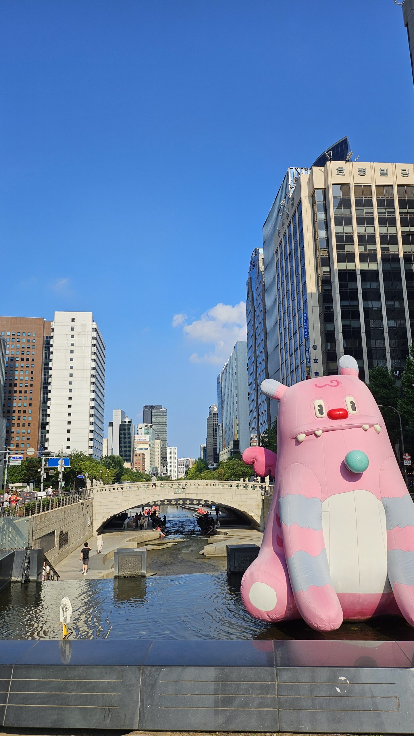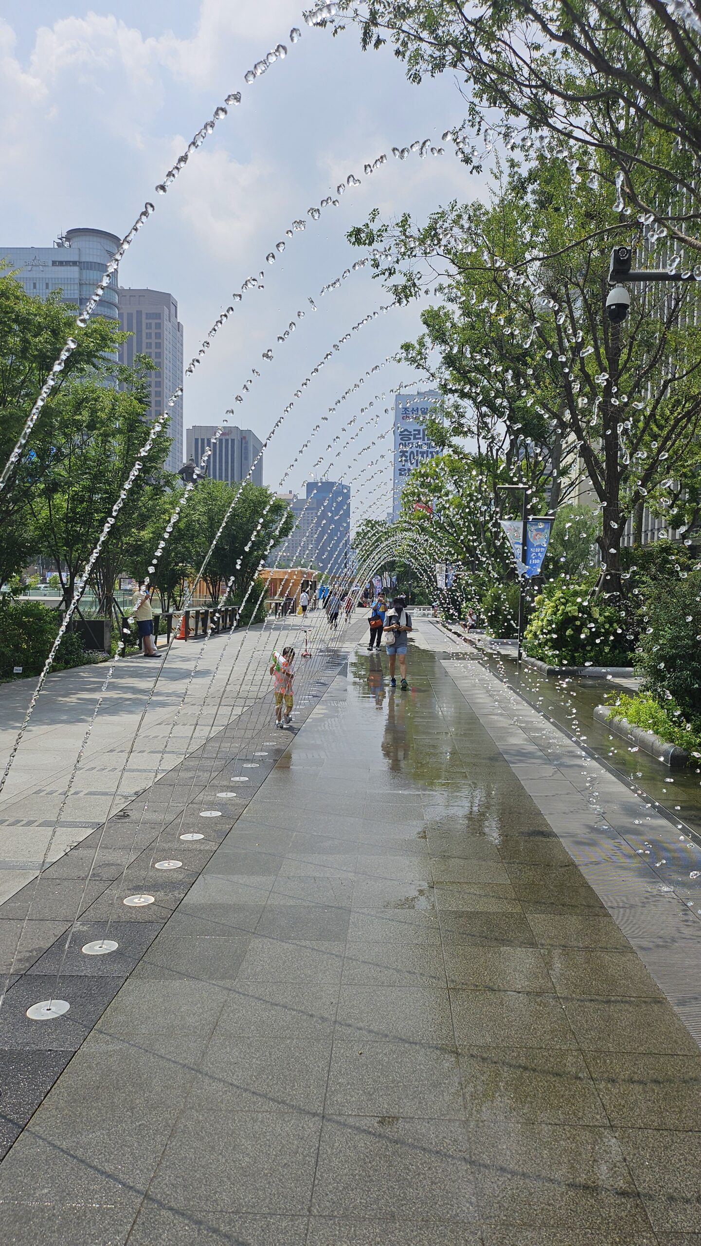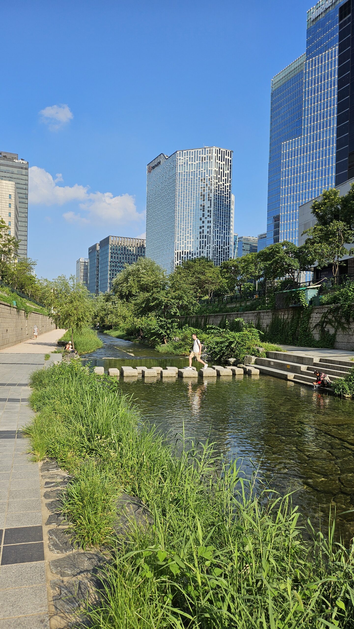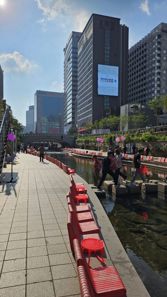 Toujours dans le même quartier de Jong, à quelques stations de métro, nous choisissons ensuite de nous promener sur le lit de la rivière CHEONGGYECHEON. Jusqu’alors entièrement bétonné, il a été restauré et réhabilité. Les berges ont été pavées et de charmants petits gués surplombent désormais l’eau. Malgré quelques contestations, l’ensemble est devenu un lieu de promenade apprécié des habitants de Séoul.