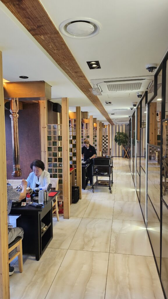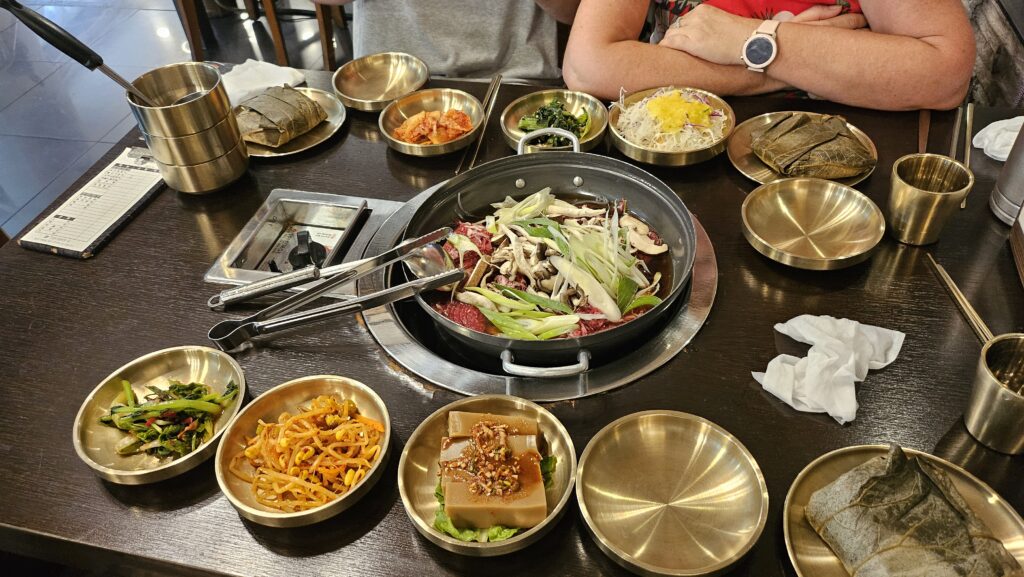 Nous nous y arrêtons pour déjeuner un Bulgogi un plat traditionnel coréen de viande de bœuf marinée puis grillée accompagnée de plusieurs légumes et riz servis séparément.
