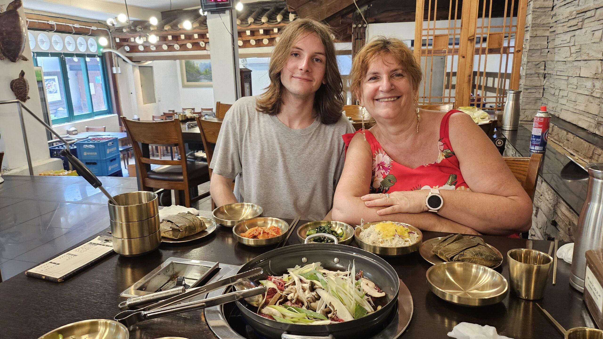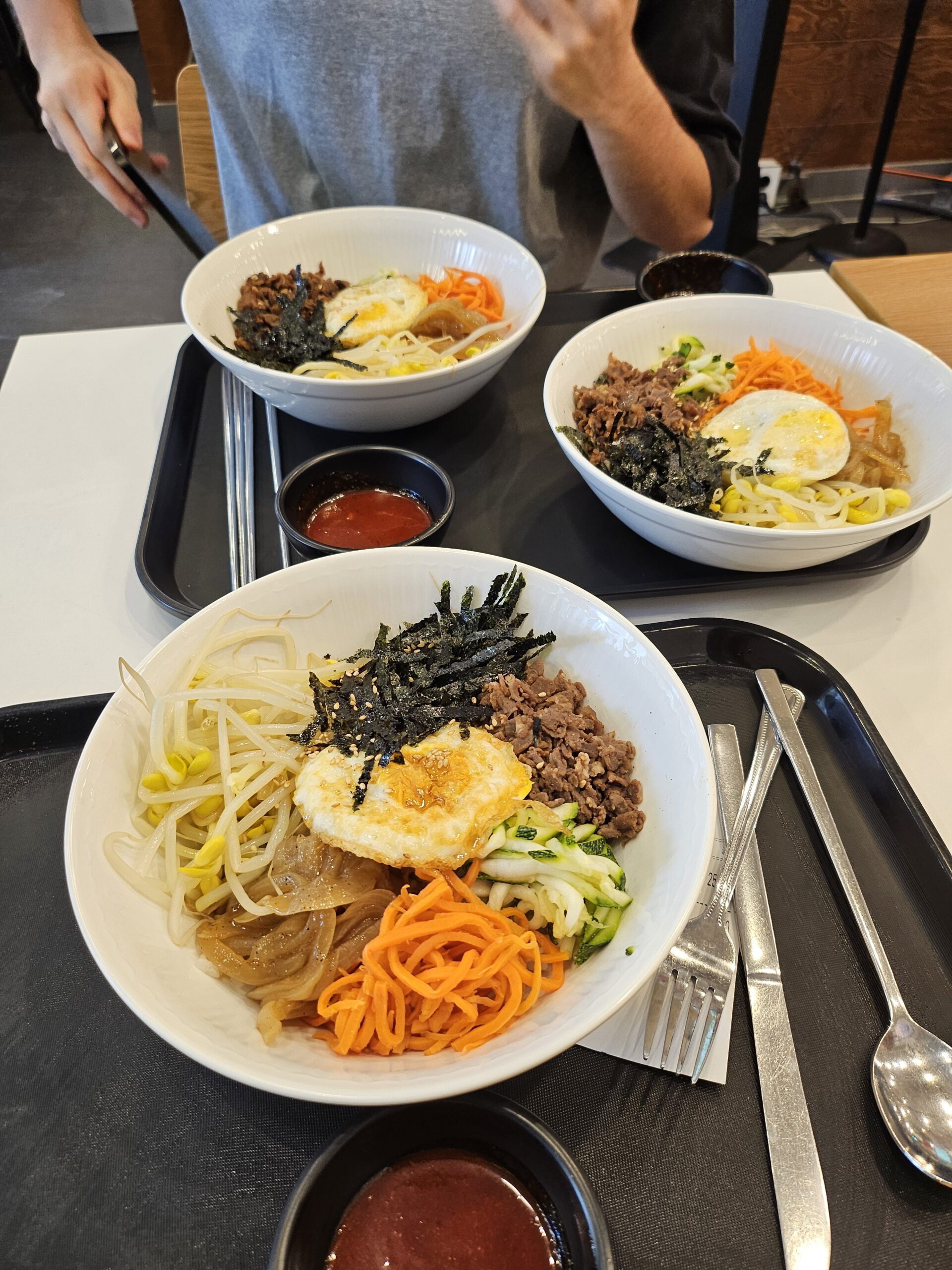 Pour déjeuner, Mathias nous amène manger un plat très populaire en Corée, le bibimbap. Il s’agit d’un mélange de riz, de viande de bœuf, de légumes sautés ou blanchis, ensuite assaisonnés, et d’un œuf sur le plat, le tout relevé par de la pâte de piment coréenne fermentée. C’est bon !