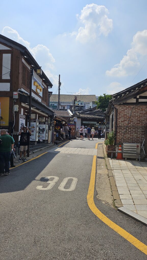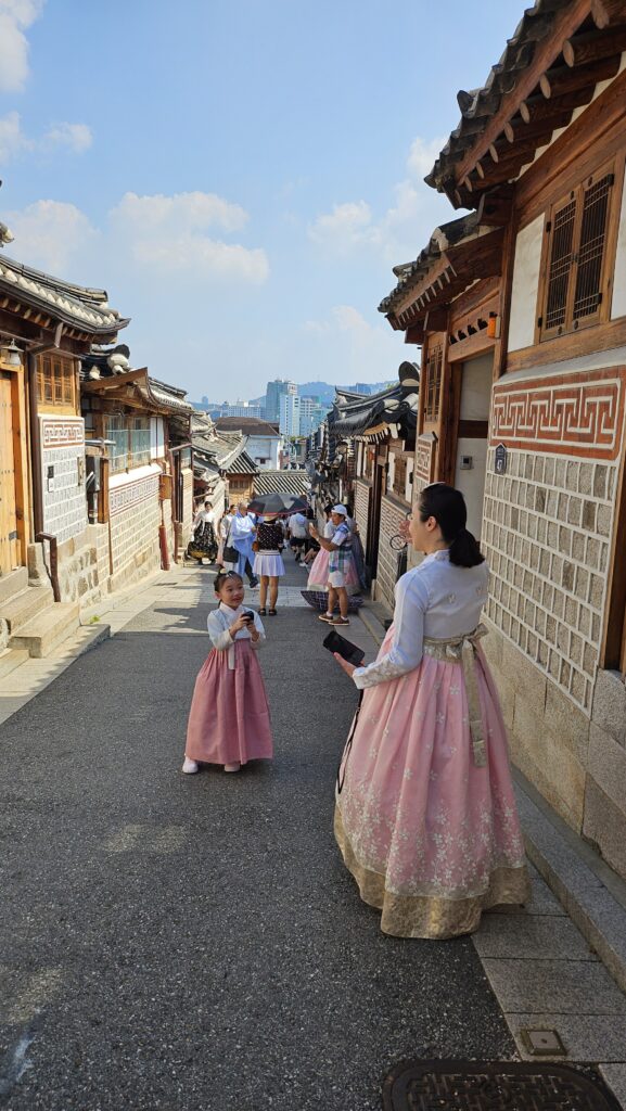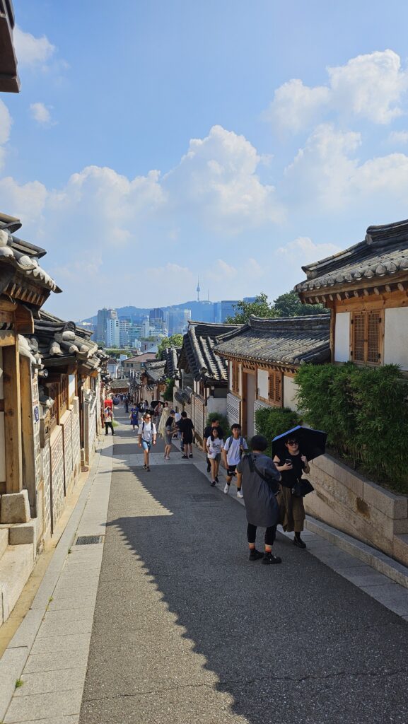 Après ce délicieux déjeuner et un café à 4.50 euros (c’est du luxe en Corée le café !), nous visitons, pas très loin de la rue Insadong, le BUKCHON HANOK VILLAGE. Bukchon était autrefois un village dans lequel résidaient les aristocrates au cours de la dynastie Joseon. Certaines des maisons aux toits de tuiles appelées « giwas » ont été préservées jusqu’à nos jours.