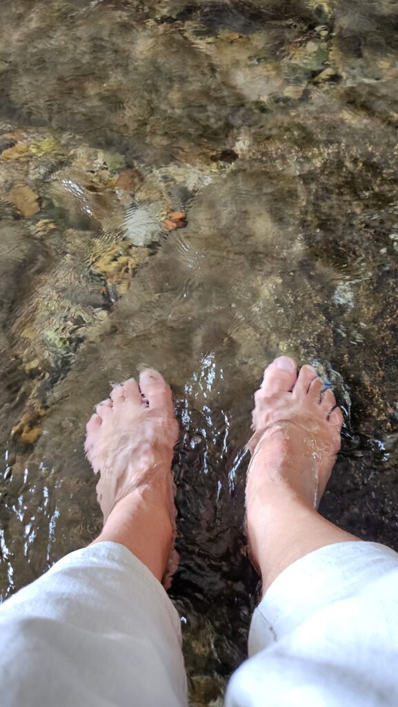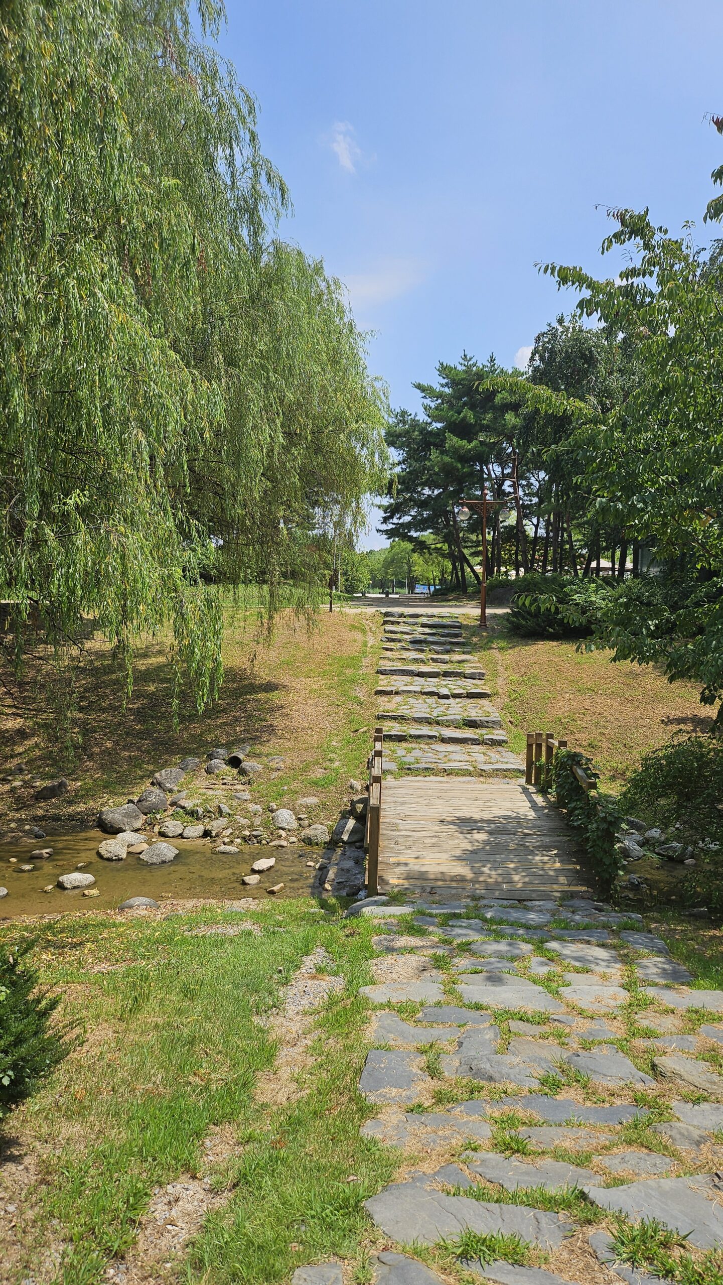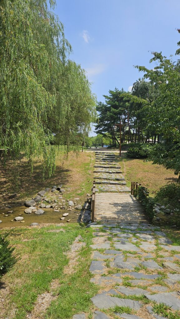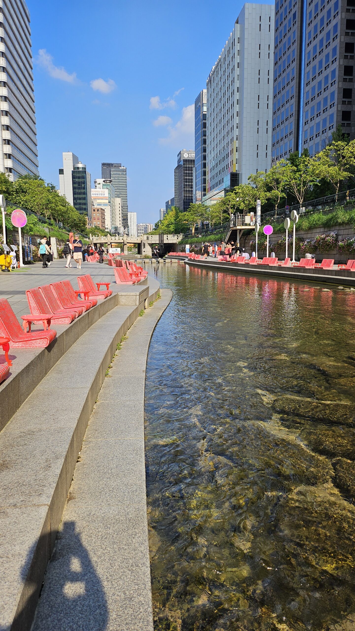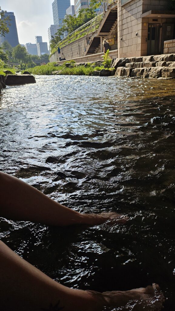 Comme beaucoup de Coréen, nous nous arrêtons pour nous reposer, dans ce cadre paisible, en pleine ville et nous en profitons pour tremper nos pieds dans l’eau claire et fraîche de la rivière. Que du bonheur.