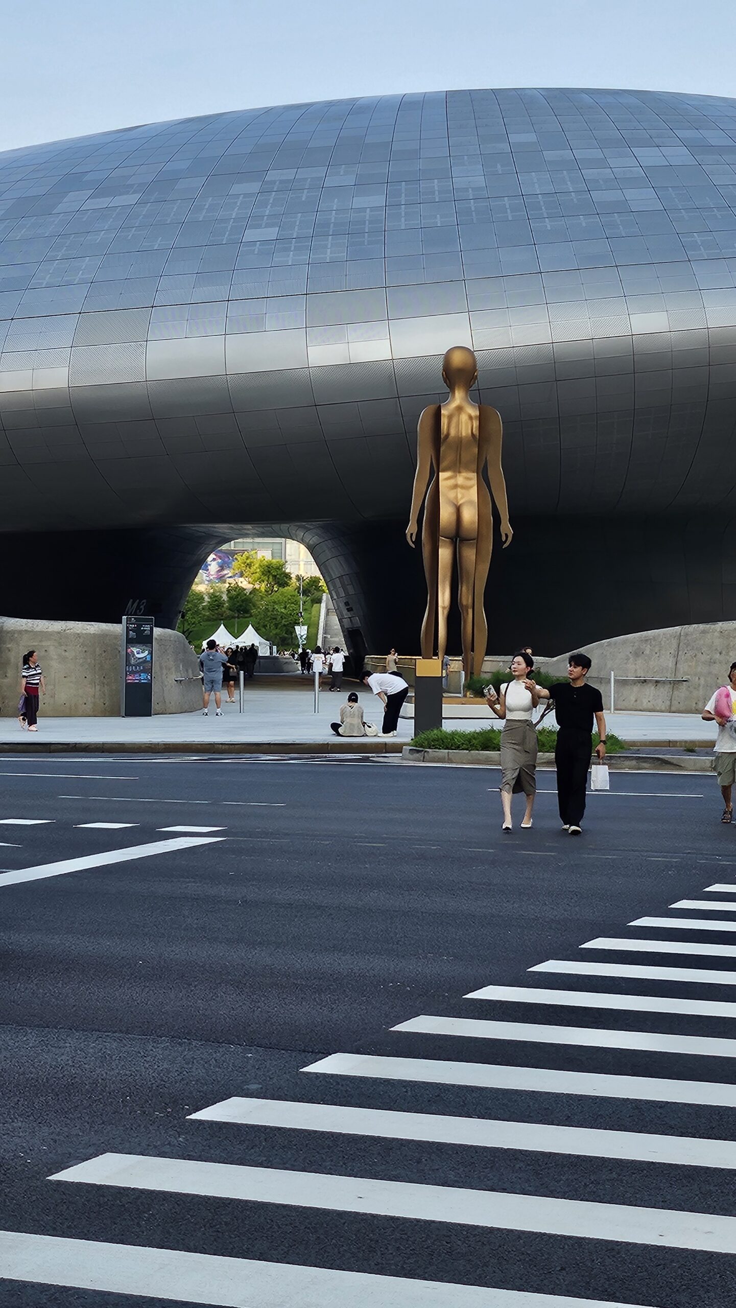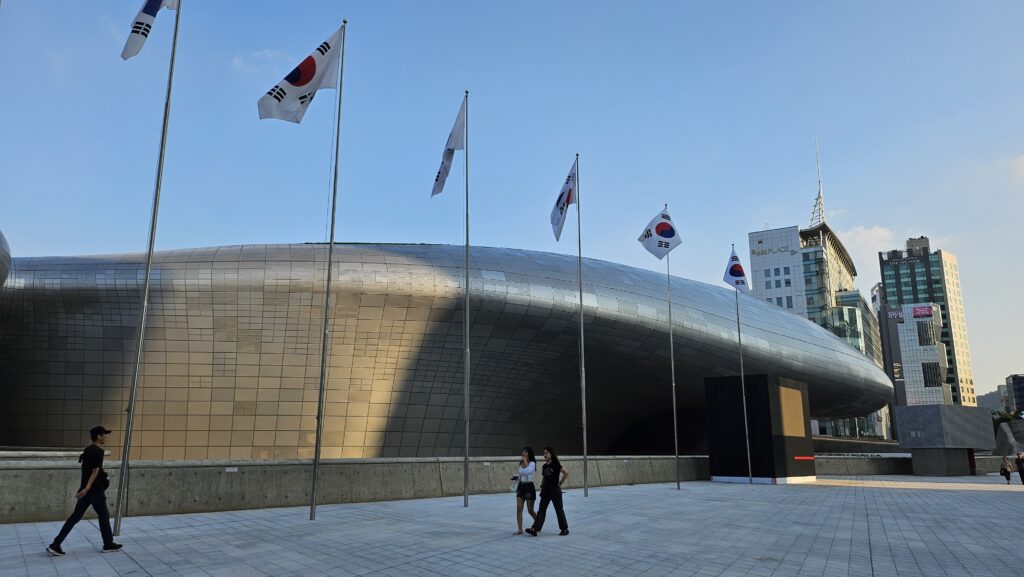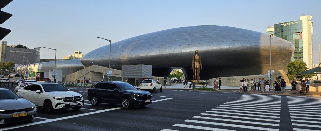 Le bâtiment ressemble à un immense vaisseau spatial posé dans Séoul.