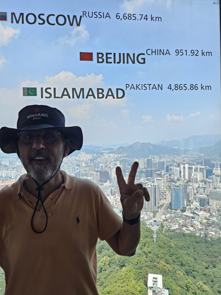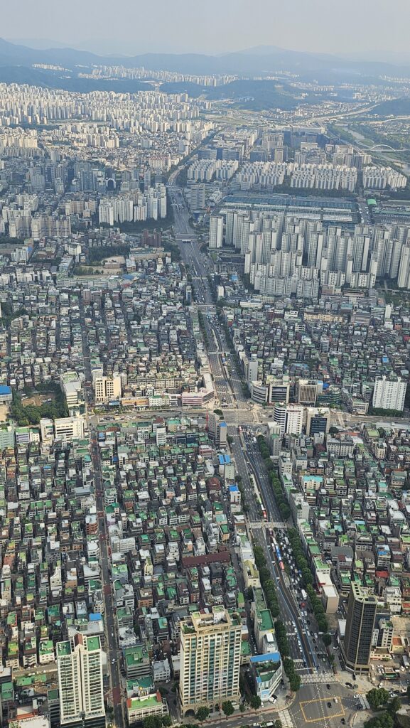 Nous contournons, tant bien que mal, la foule en délire pour accéder à l’entrée du sky Séoul et prendre nos tickets. Un ascenseur nous amène au 121ème étage en 20s. Là, le spectacle est grandiose …. la vue imprenable. Impressionnant !
