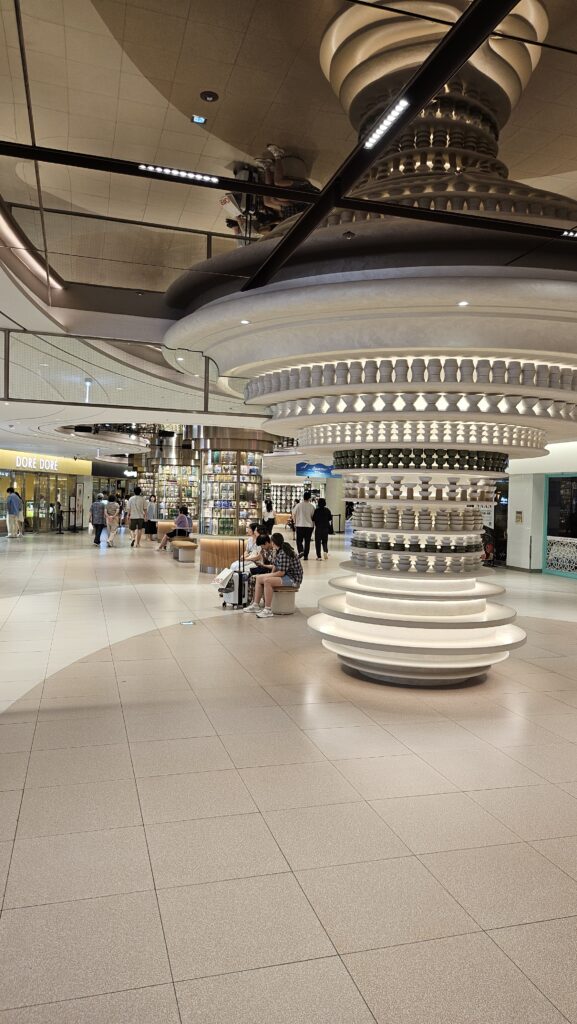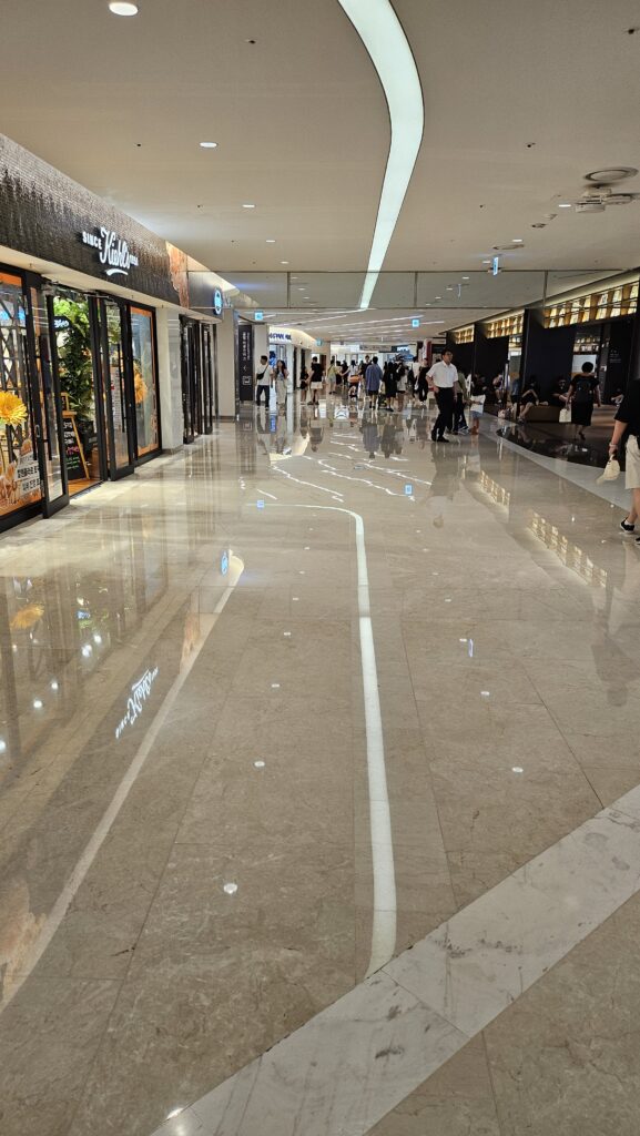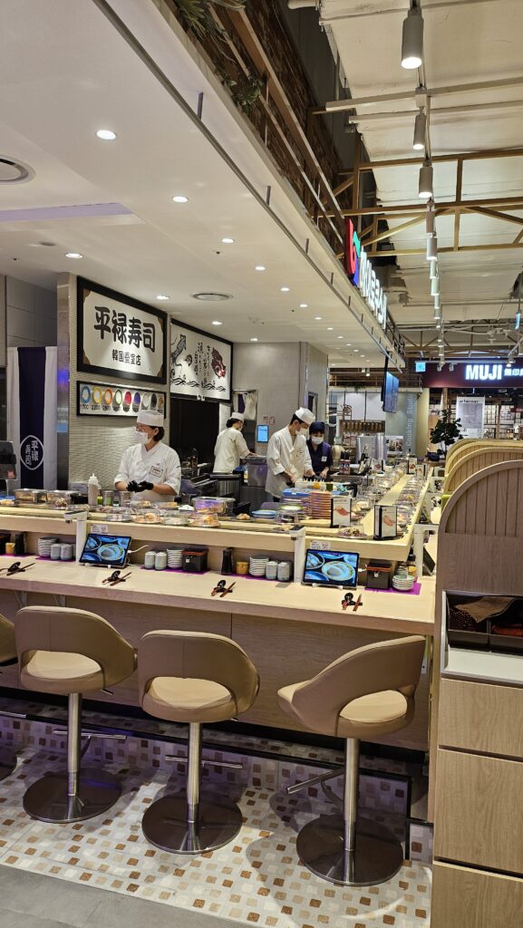 Une autre galerie marchande, plus adaptée au commun des mortels celle ci, occupe une autre partie de la tour. Nous déambulons dans ses allées magnifiques quelques instants sans aucune intention d’acheter, juste pour voir. Nous passons devant un restaurant de sushis original: