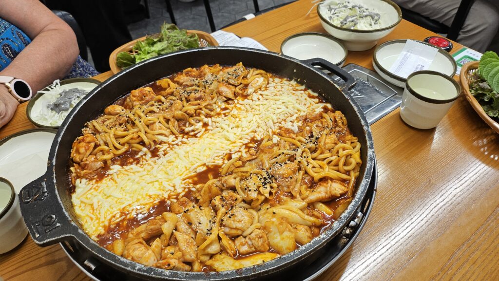 Nous déjeunons pas très loin de notre logement , dans notre fabuleux quartier animé Myeong Dong. Mathias nous propose de manger un Dakgalbi. Le Dakgalbi est un plat coréen convivial que l’on mange à plusieurs. Le poulet est cuit avec plusieurs légumes dans une sauce épicée. Pour plus de gourmandise, on peut rajouter du fromage fondu. La spécialité du restaurant que Mathias a choisi est un Premium Cheese Dakgalbi, un Dakgalbi avec fromage fondu.