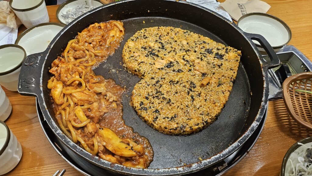 C’est assez épicé mais très bon. C’est très copieux, surtout qu’une fois le plat quasiment terminé, le serveur revient avec un plat de riz préparé qu’il mélange à la sauce restante et le laisse griller pour le rendre croustillant. Heureusement que nous avons pris le plat 2 portions pour 3 !