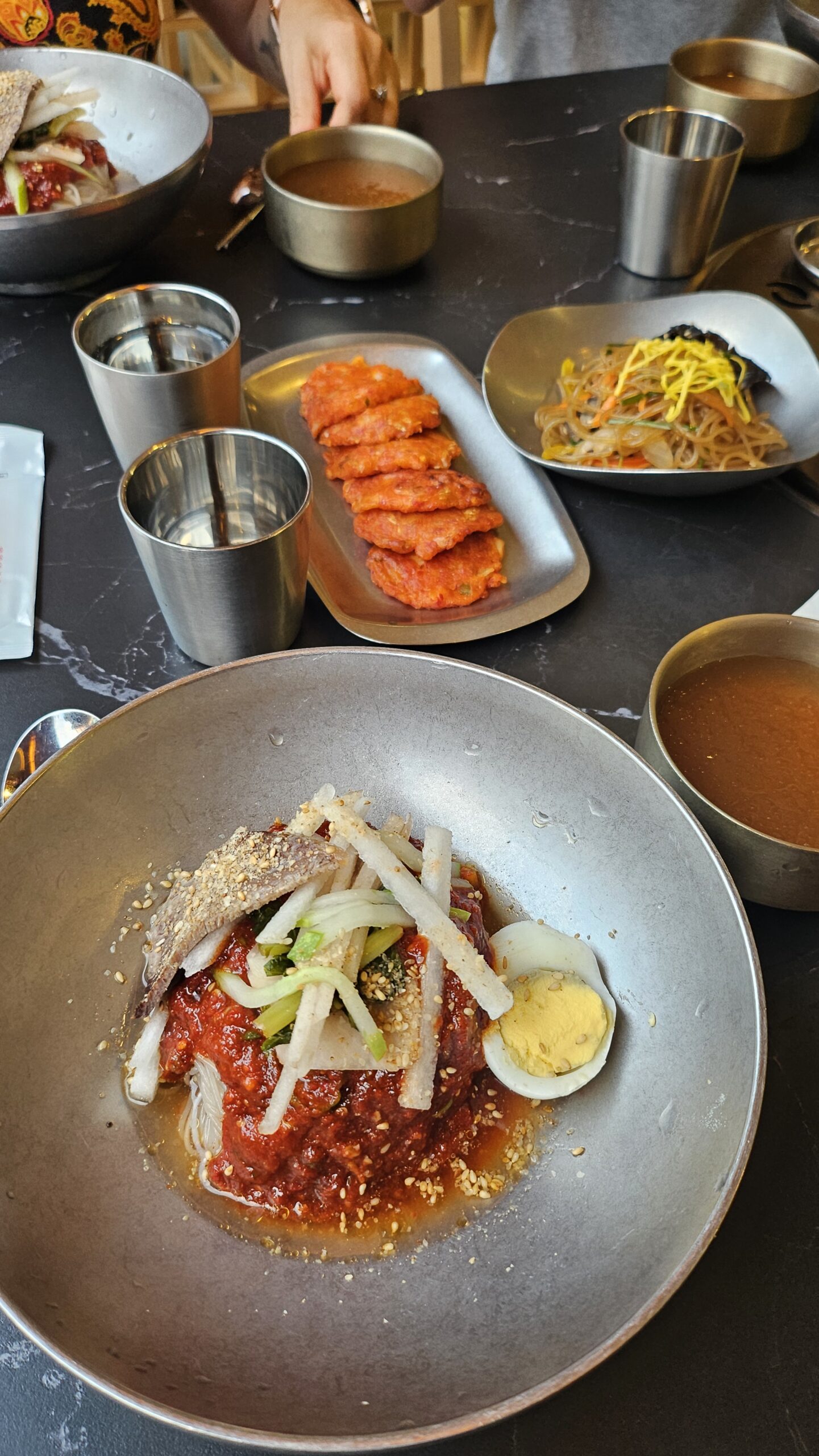 Le naengmyeon est une soupe traditionnelle froide nord-coréenne à base de nouilles faites de farine de sarrasin, de pomme de terre et de patate douce. Ici les nouilles et le bouillon sont servis séparément. Les nouilles sont à couper avec des ciseaux et à arroser avec le bouillon. Plusieurs accompagnements viennent agrémenter le plat. Très bon, même si on a compris un peu tard comment le manger !