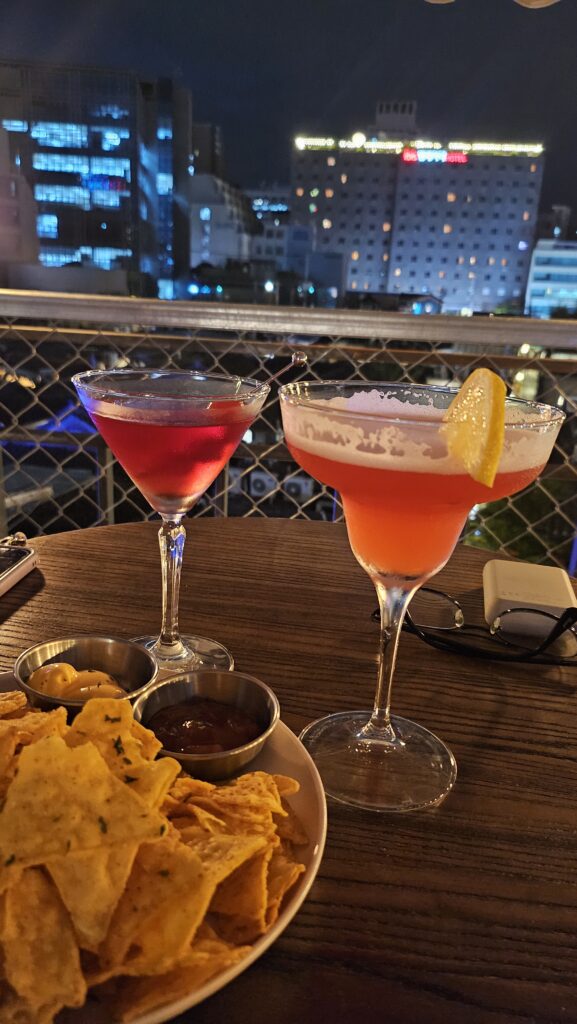 En soirée, nous allons boire un cocktail sur un rooftop dans un bar bien noté sur Google, le SAESEOUL. Un endroit très agréable, dans un quartier constitué de ruelles étroites animées et des boutiques artisanales. Je conseille l’endroit atypique et le bar qui propose d’excellents cocktails.
