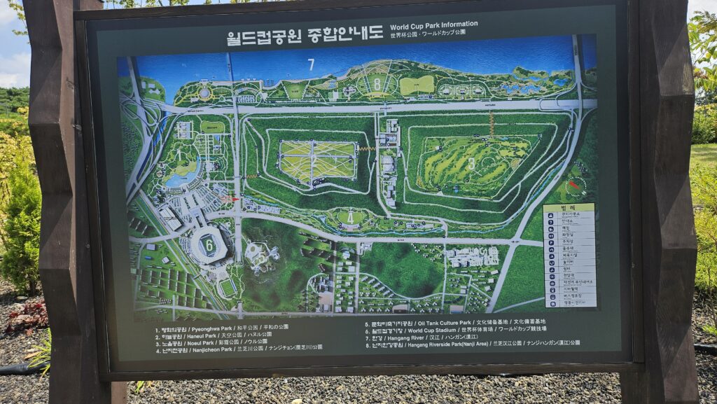 L’orage matinal est passé. Le soleil est de retour. J’en profite pour une ballade dans les parcs du WORLD CUP STADIUM à une heure en métro de la galerie HYUNDAI. Le WORLD CUP STADIUM est situé dans le quartier de Sang-am-dong. Il a été Inauguré en novembre 2001, puis a servi pour la 17eme coupe du monde de football en 2002 en Corée du Sud/ japon. Depuis 2004, c’est désormais l’enceinte du FC Séoul qui évolue en K-League, la première division sud-coréenne.