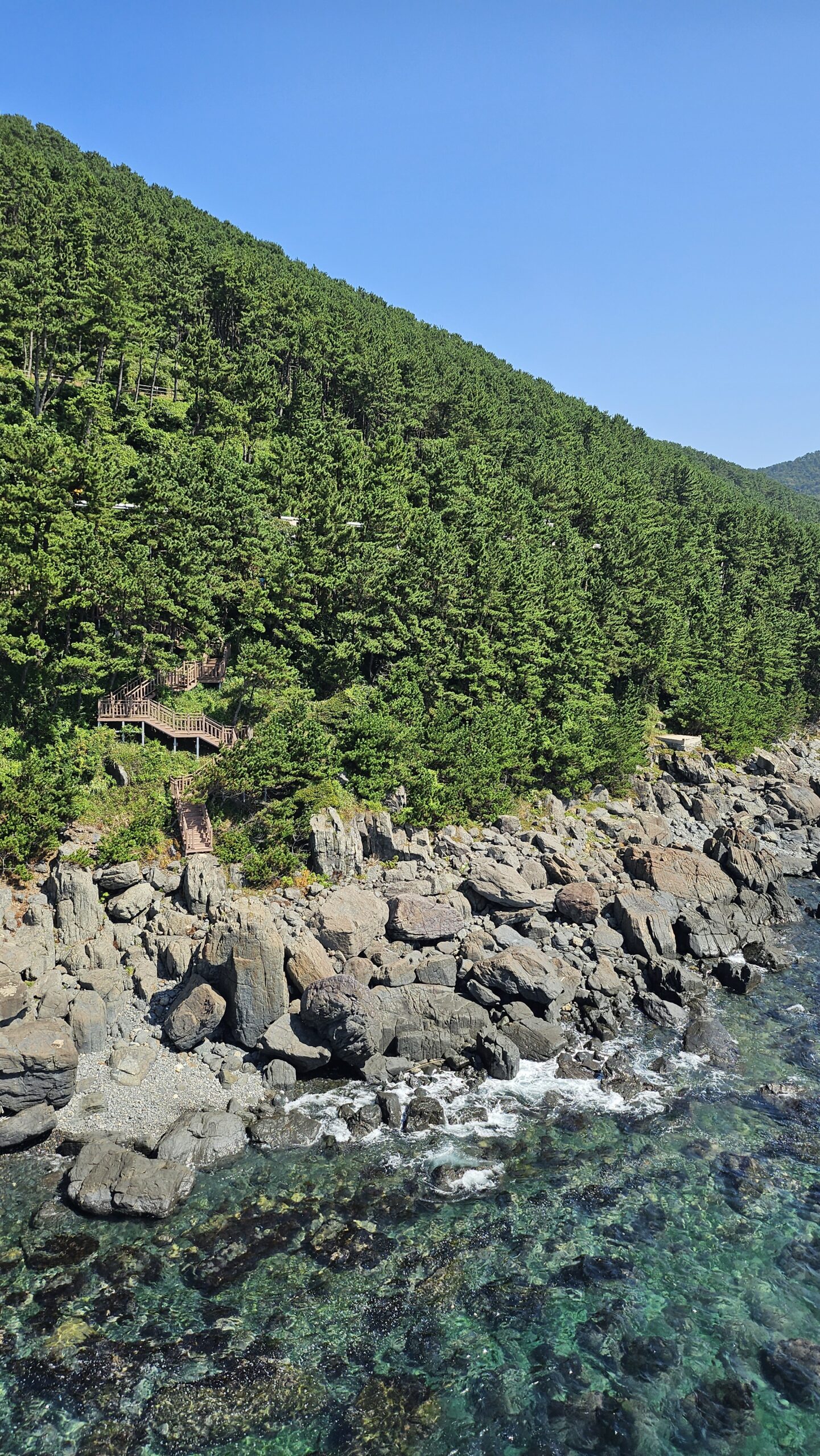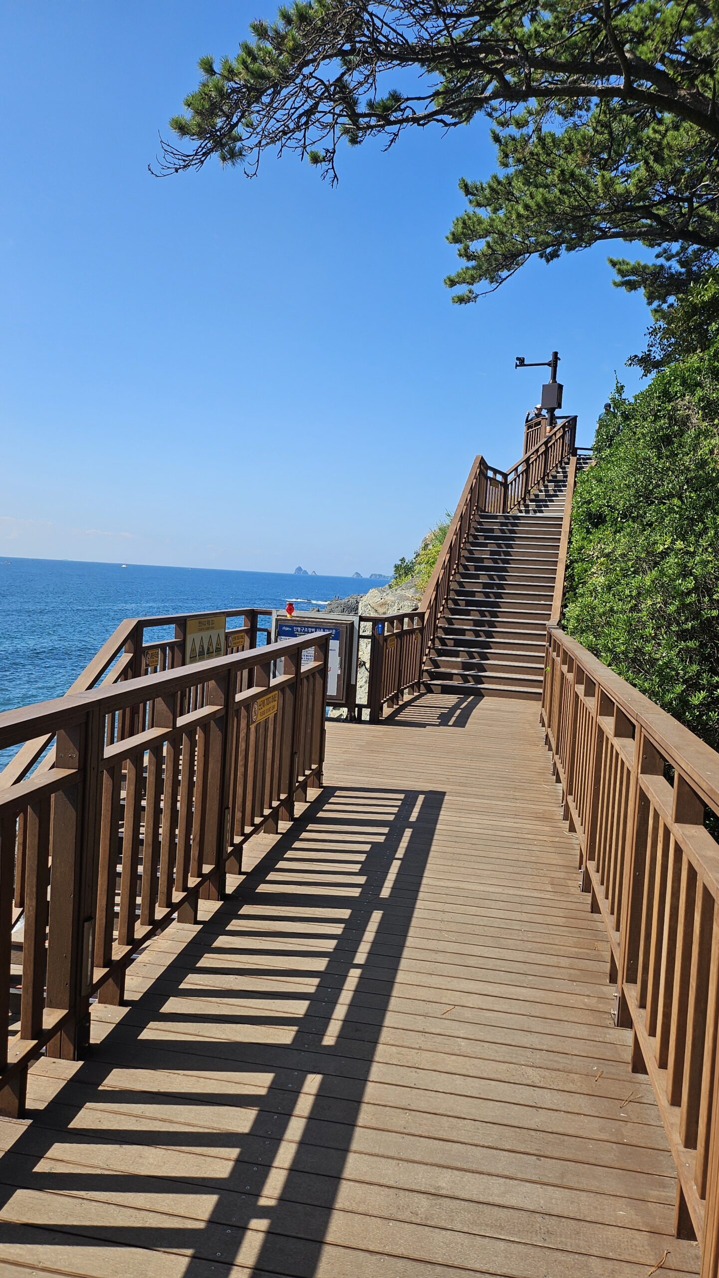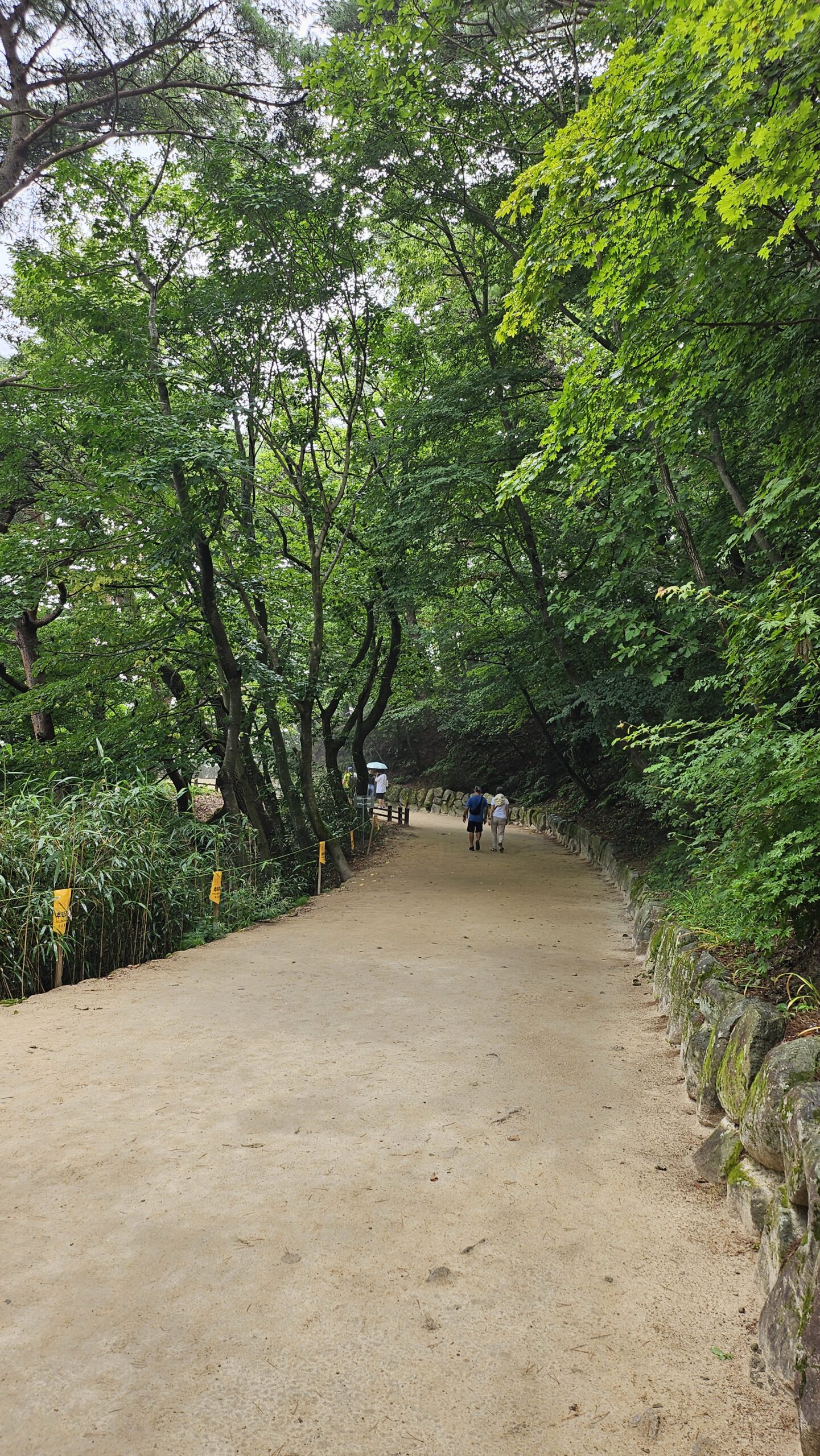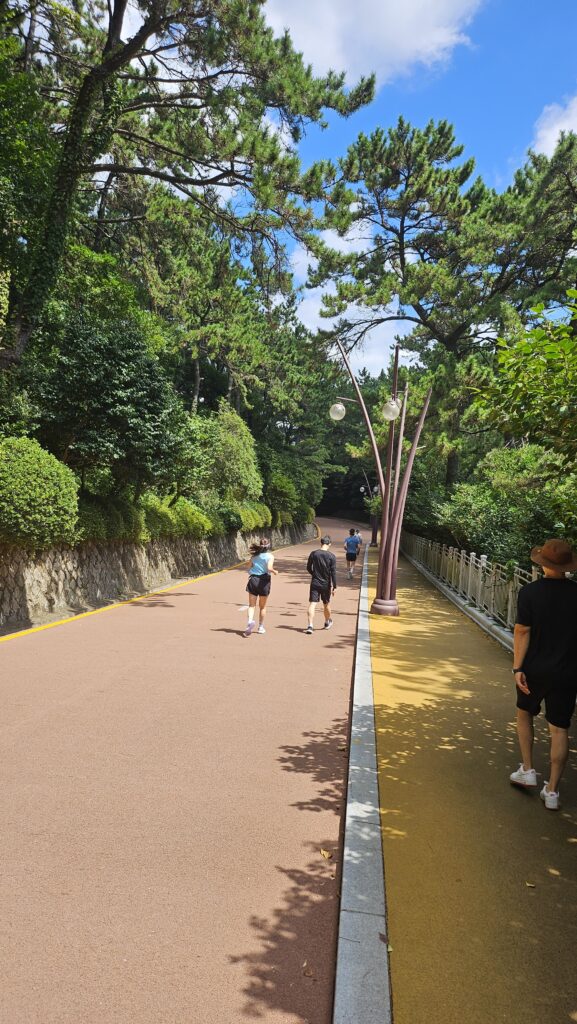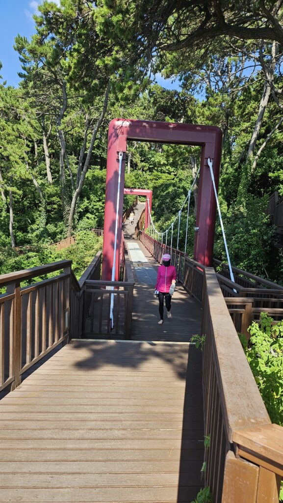 Nous parcourons les 1,1 km qui nous séparent de la station CHEONGSAPO, à pied, sur un chemin aménagé spécialement. La ballade est agréable, à l’ombre des pins. Les points de vues sont splendides.