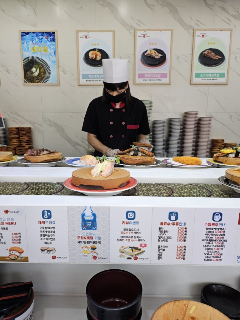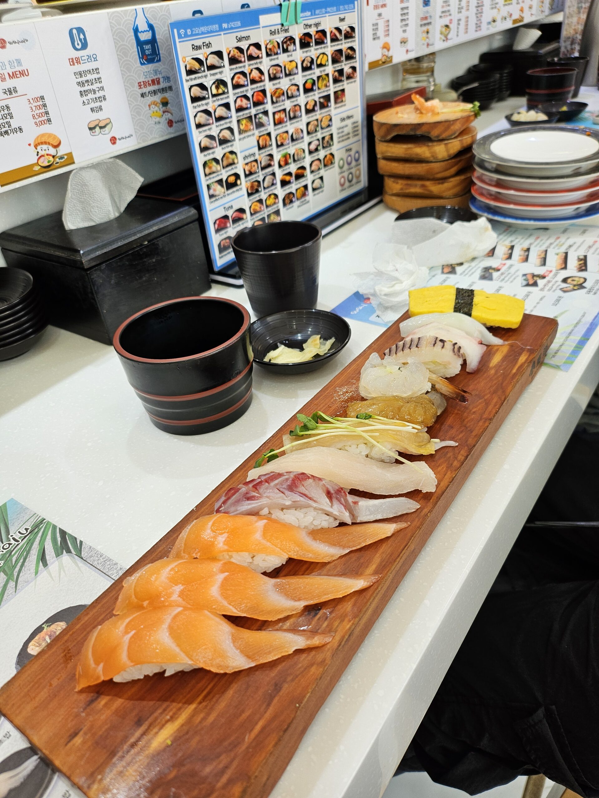 On opte pour un barbecue dans un restaurant que nous avions remarqué et bien noté sur Google, mais il y a 50 personnes devant nous ! Beaucoup trop long ! On se replie sur un restaurant de sushis sur rail. Malgré les avis pas très favorables, on s’y risque. Les sushis sont petits, pas fameux et chers ! Mathias et moi prenons alors un plateau de sushis saumon/poisson blanc … bof !