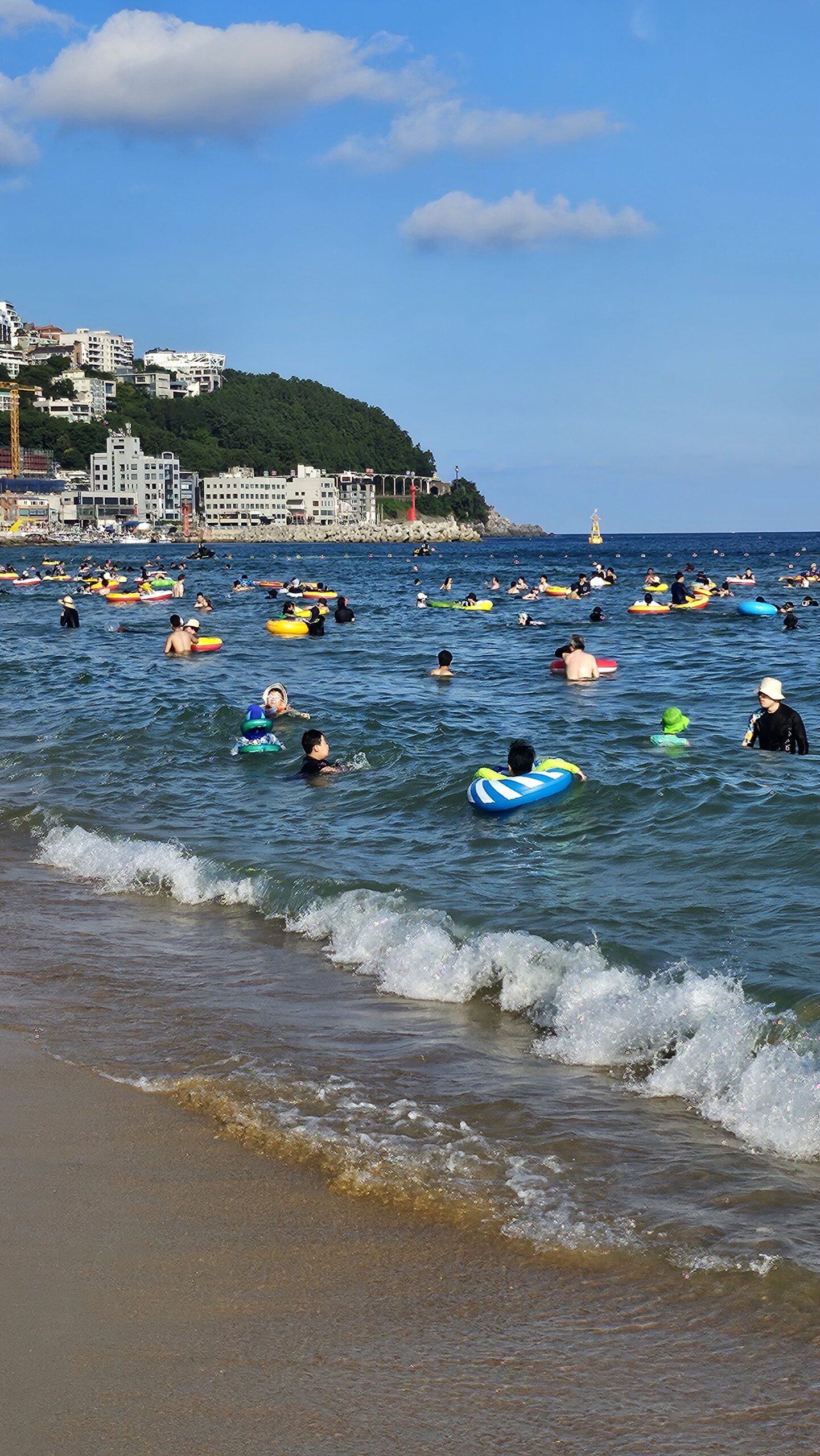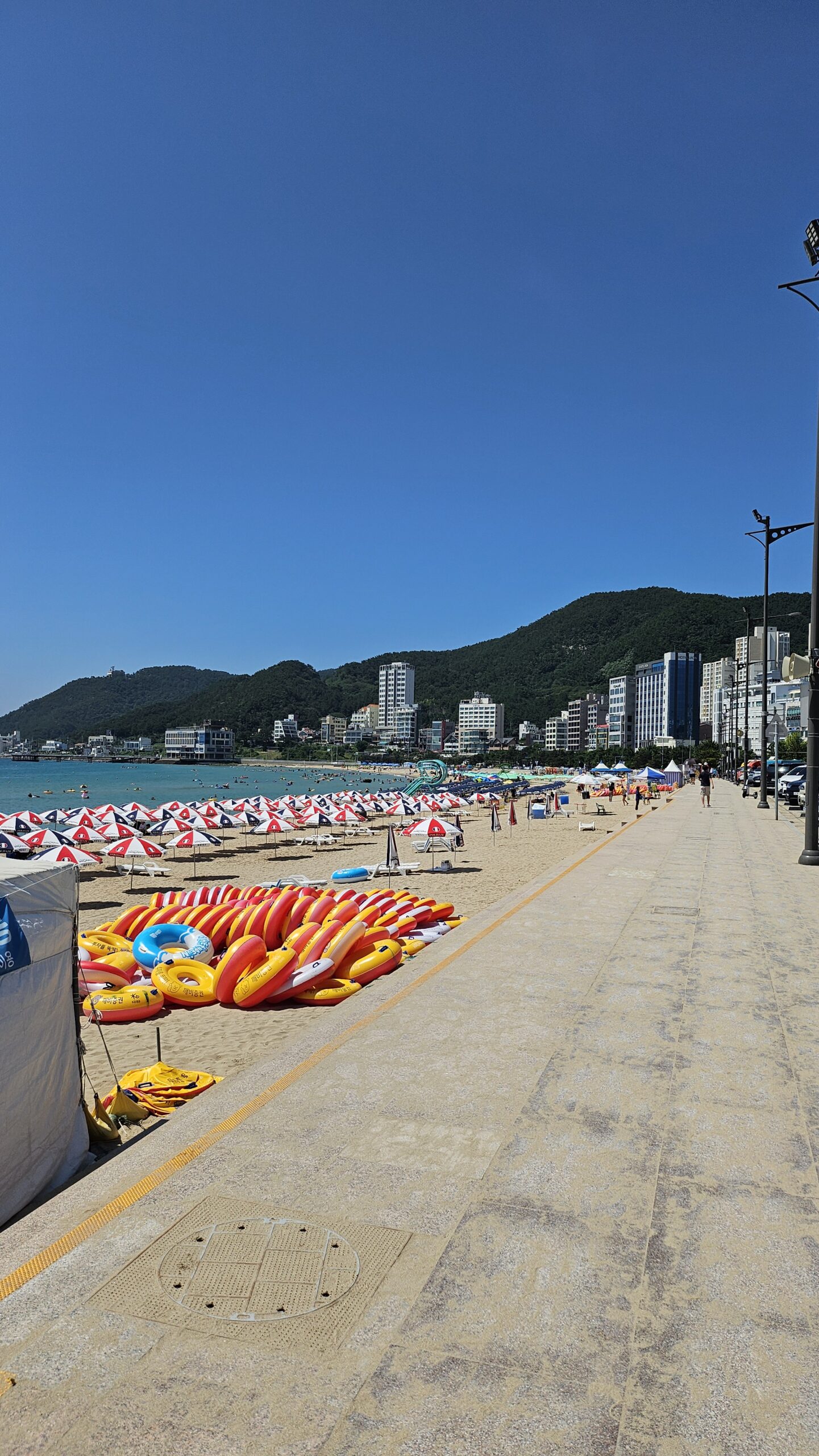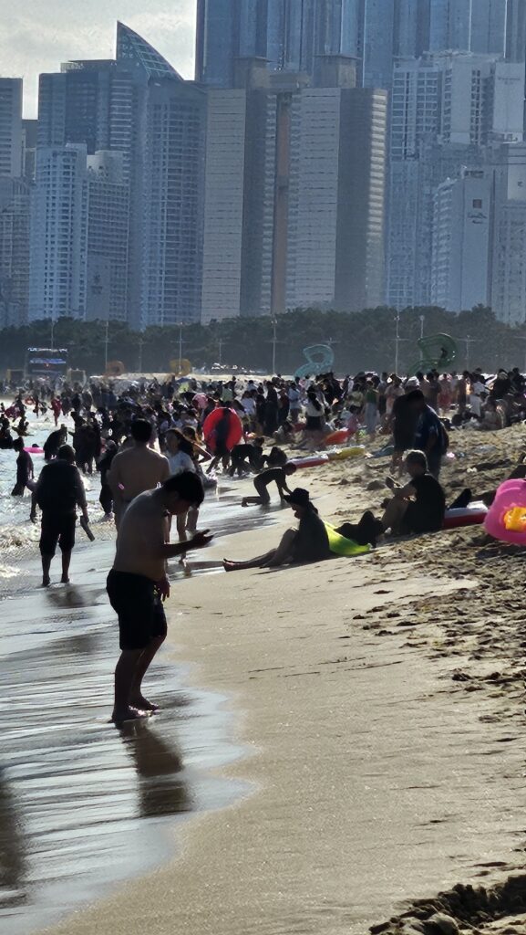 Pour 10 000 won je loue un transat et pour 10 000 de plus un parasol. Les Coréens ont si peur du soleil qu’ils se baignent tout habillé ! Et malheur à celui qui n’a pas sa bouée ! Ils sont fous ces Coréens !