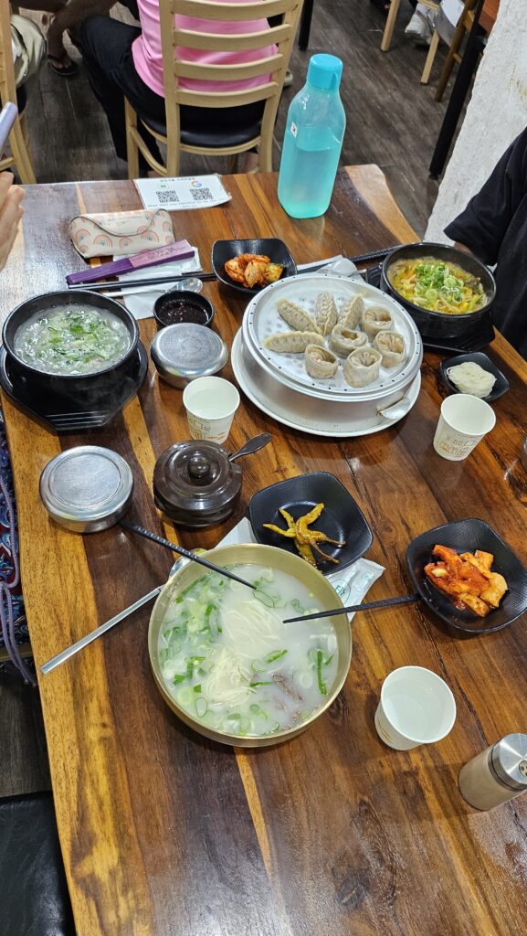 Les serveurs ne parlent pas du tout l’anglais ! La communication est compliquée ! Heureusement Google traduction nous aide bien ! On voulait manger du boeuf mais on se rend compte qu’ils ne font que du porc. On se régale quand même. Je dirai même que c’est le meilleur repas que j’ai fait depuis notre arrivée. Les accompagnements étaient excellents notamment les nouilles froides au Kimchi, un délice.