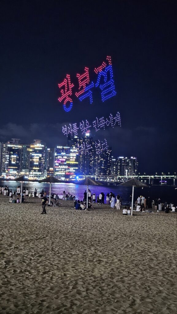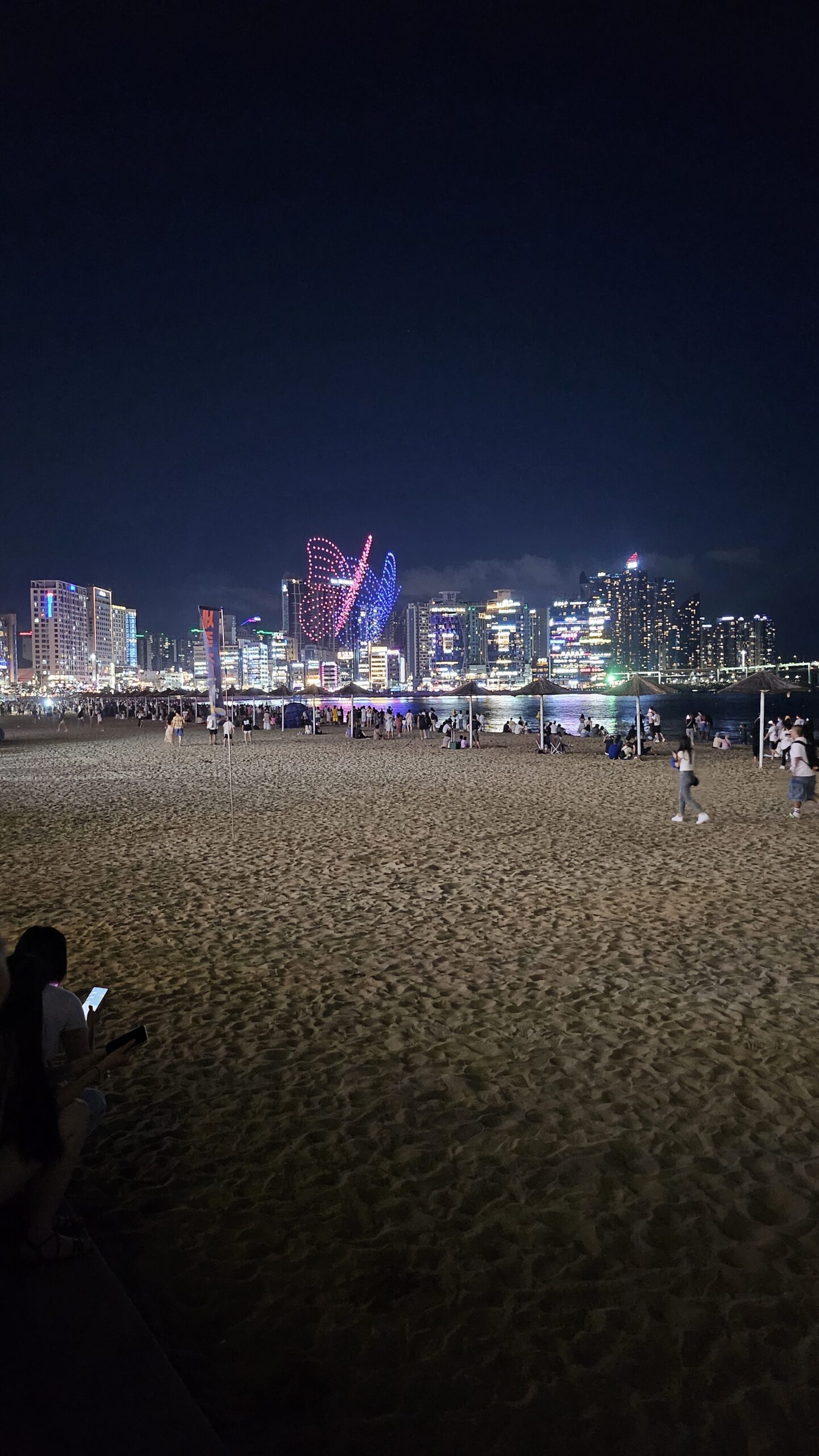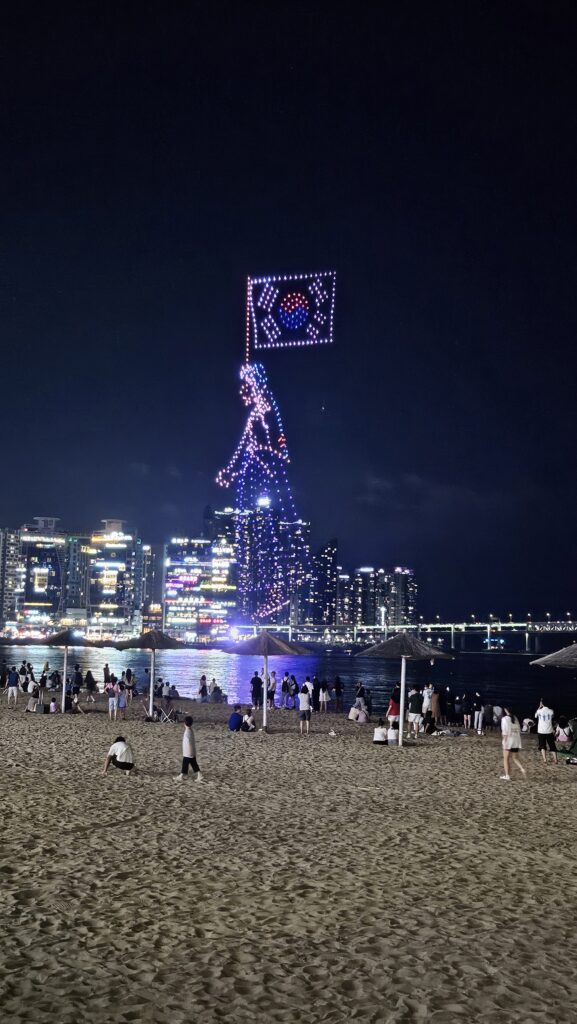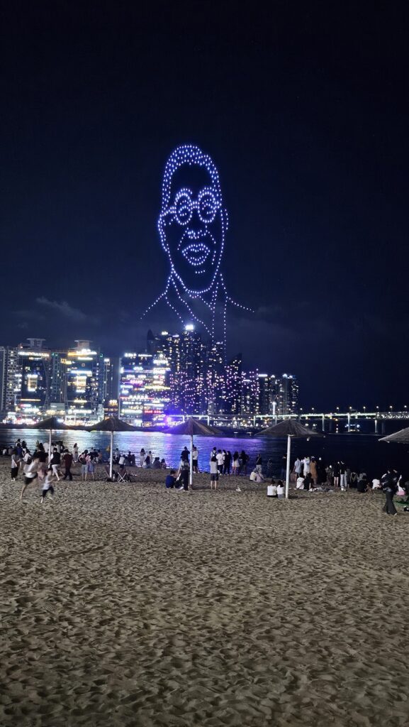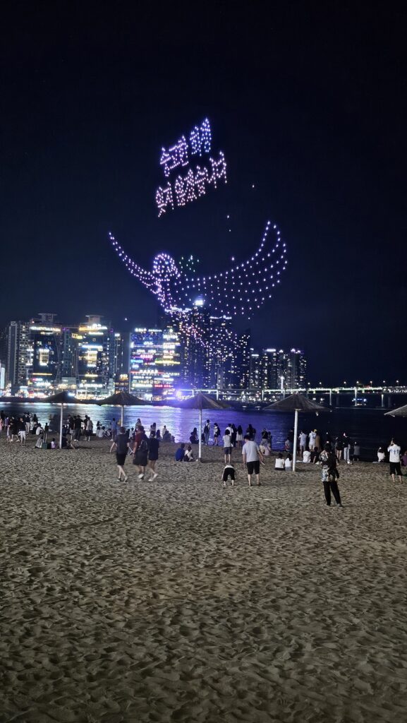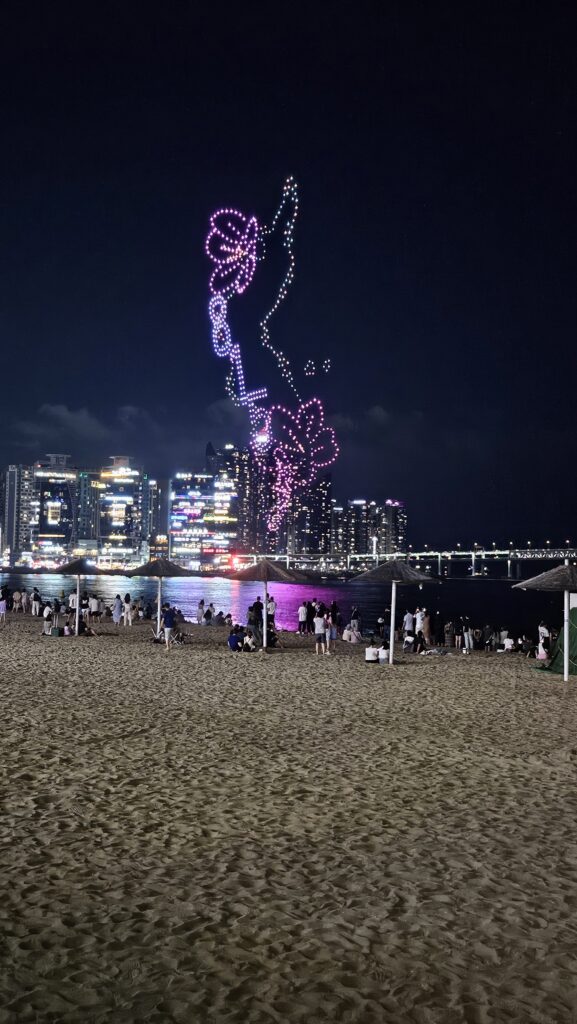 On s’installe sur le front de mer et on ouvre grand les yeux … une merveille ! Plus de 600 drônes, positionnés au millimètre, dessinent et animent sous nos yeux des figures dans le ciel. C’est magique. L’animation des drônes associé à l’illumination du pont offre un spectacle à ne pas manquer si vous venez à Busan.