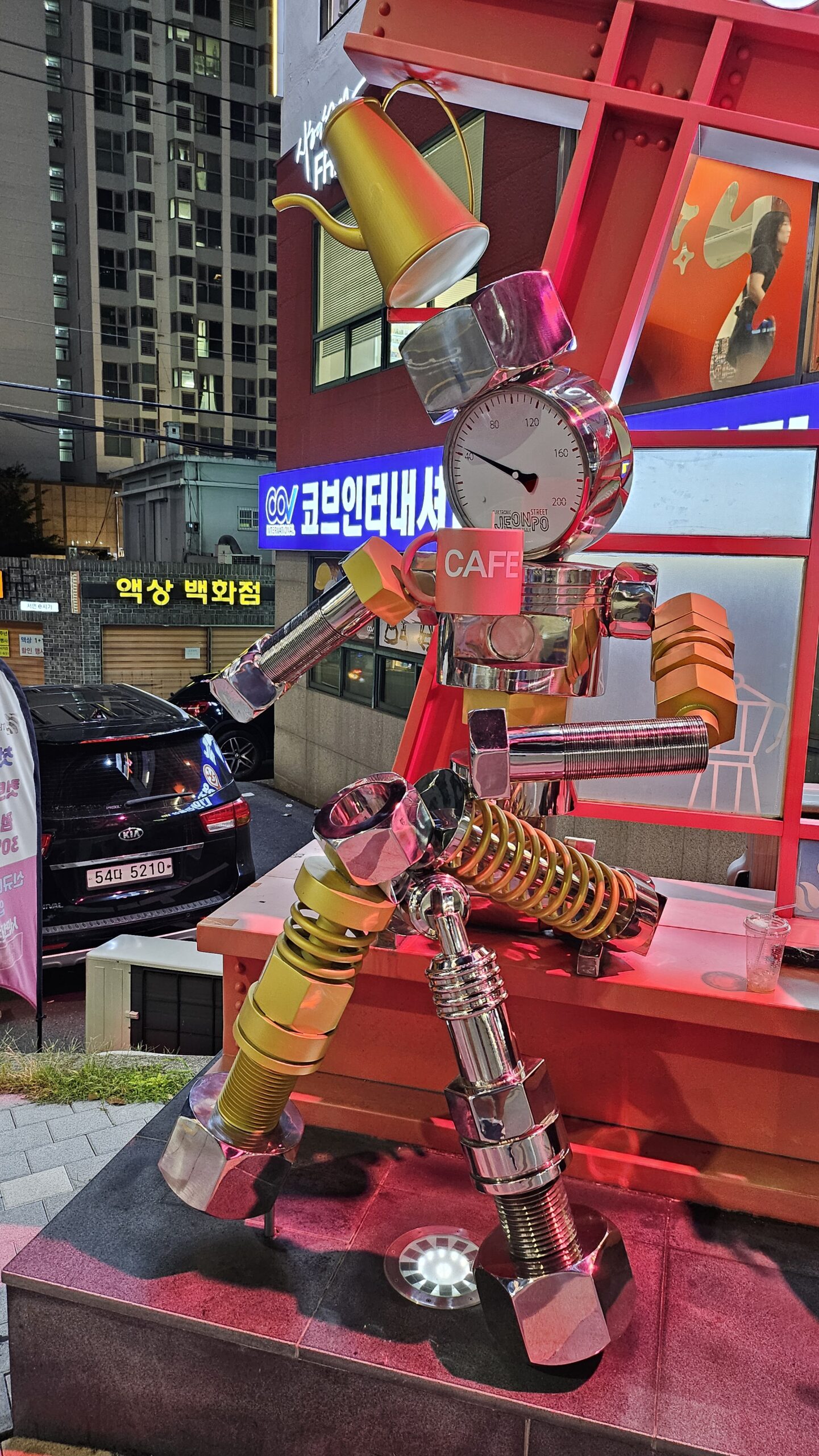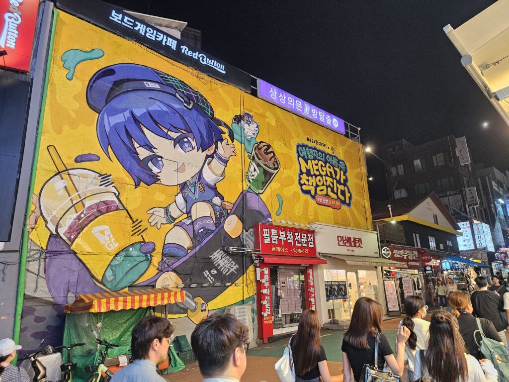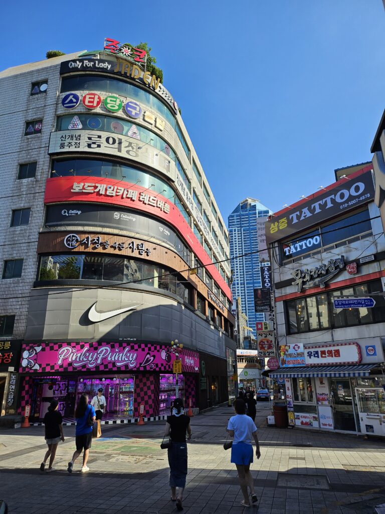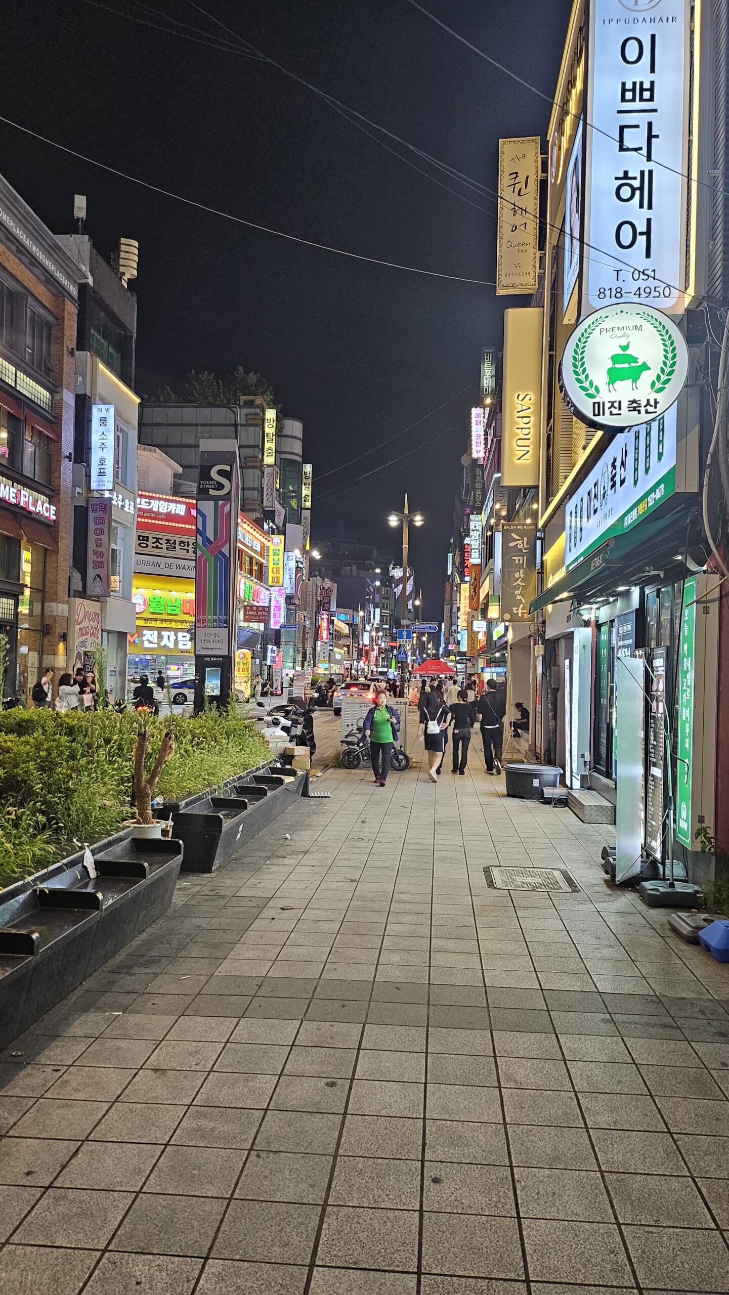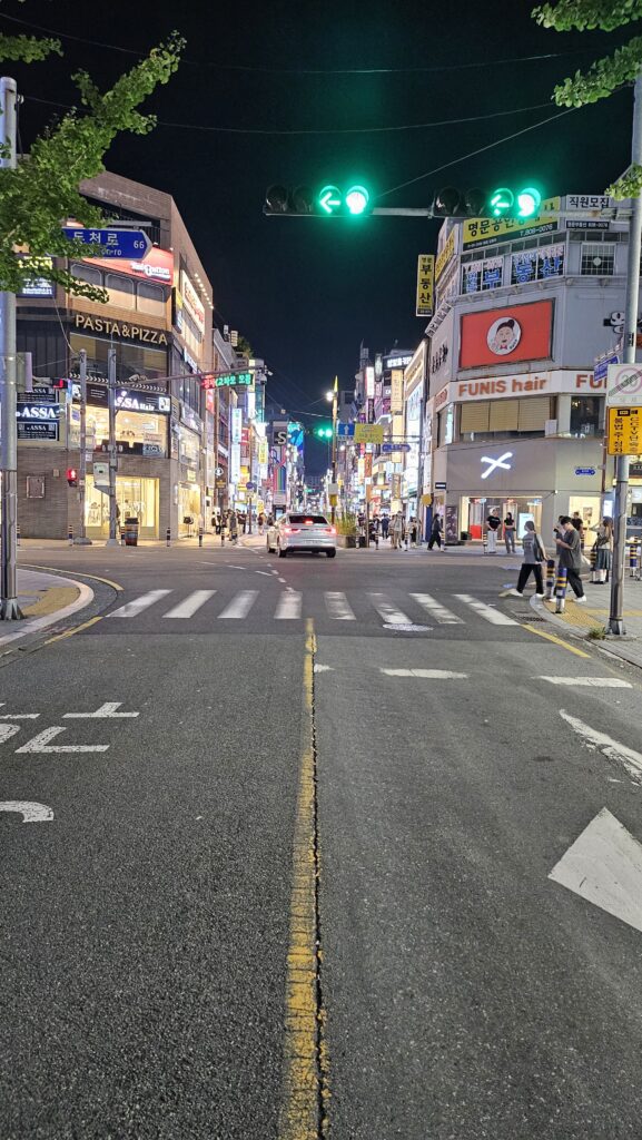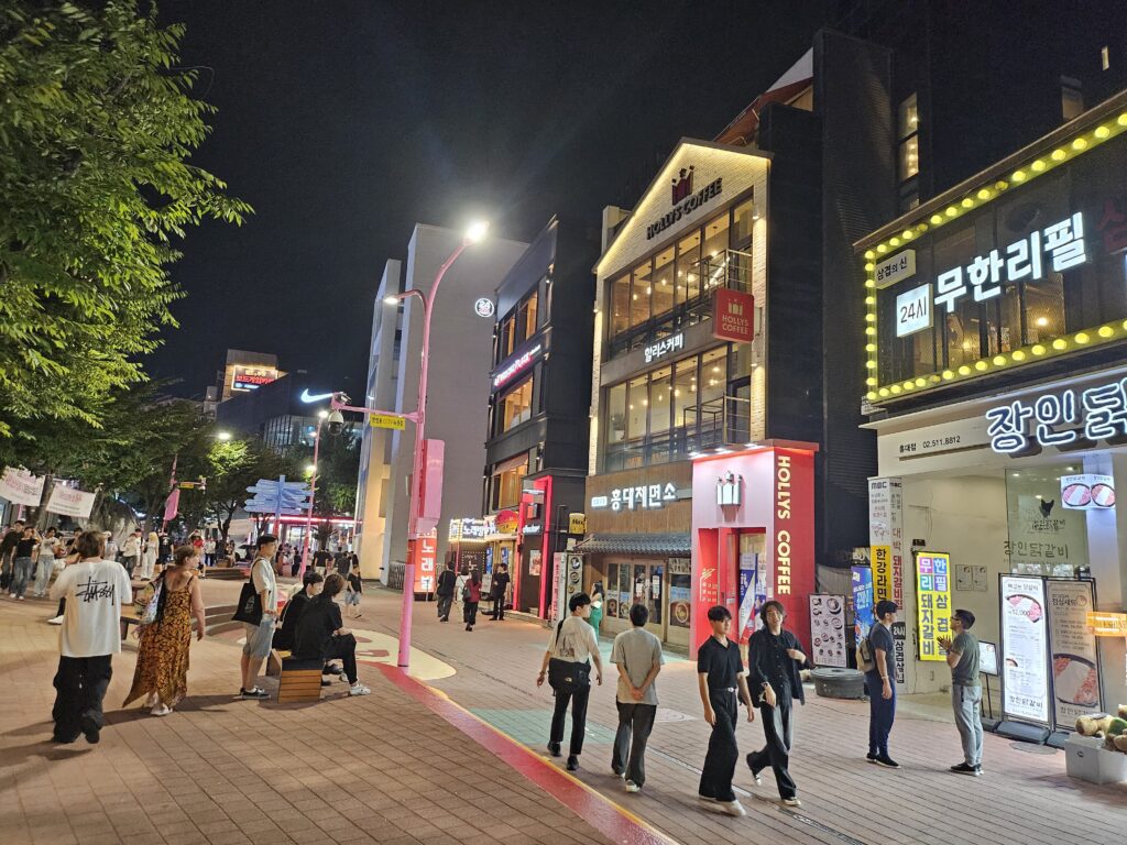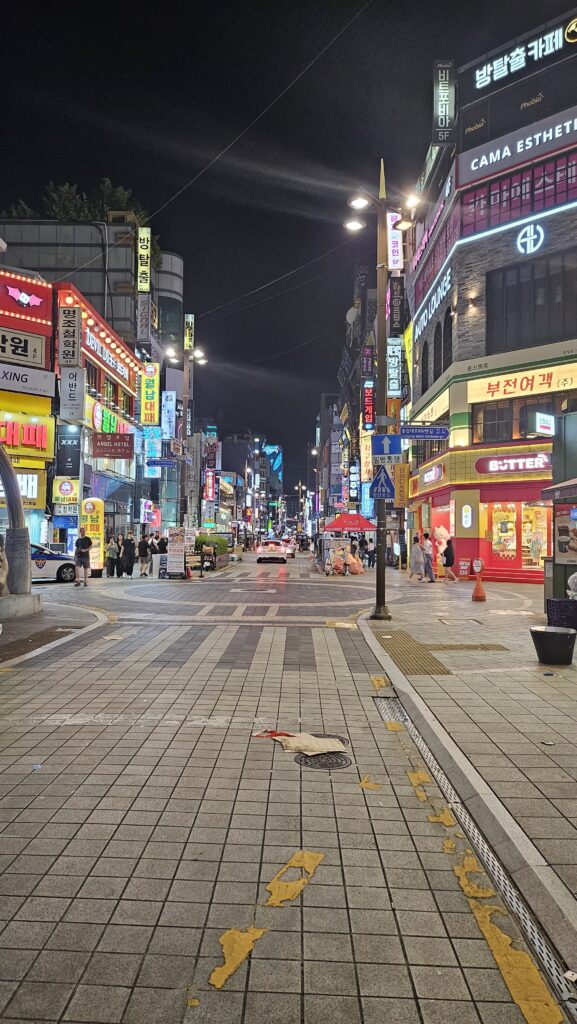 La ville est illuminée. Le quartier est vivant. Il y a beaucoup de jeunes dans les rues. L’air est doux. L’ambiance est agréable. Cependant, je trouve le quartier sale. C’est étonnant. Jusqu’à ce soir, on constatait au contraire que Séoul comme Busan étaient des villes particulièrement propres.