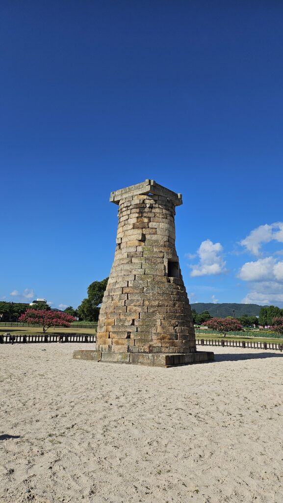 Cette structure en pierre est supposée avoir été construite sous le règne de la reine Seondeok (r. 632-647), le 27e souverain du royaume de Silla (57 av. J.-C.-935 apr. J.-C.). Son nom Cheomseongdae signifie « Plate-forme de regard sur les étoiles », et il est largement reconnu comme le plus ancien observatoire astronomique survivant en Asie. La structure se compose d’une base carrée, d’une section principale et d’un sommet. La section principale est faite de pierres taillées en carrés empilées en 27 niveaux qui forment une colonne cylindrique courbe.