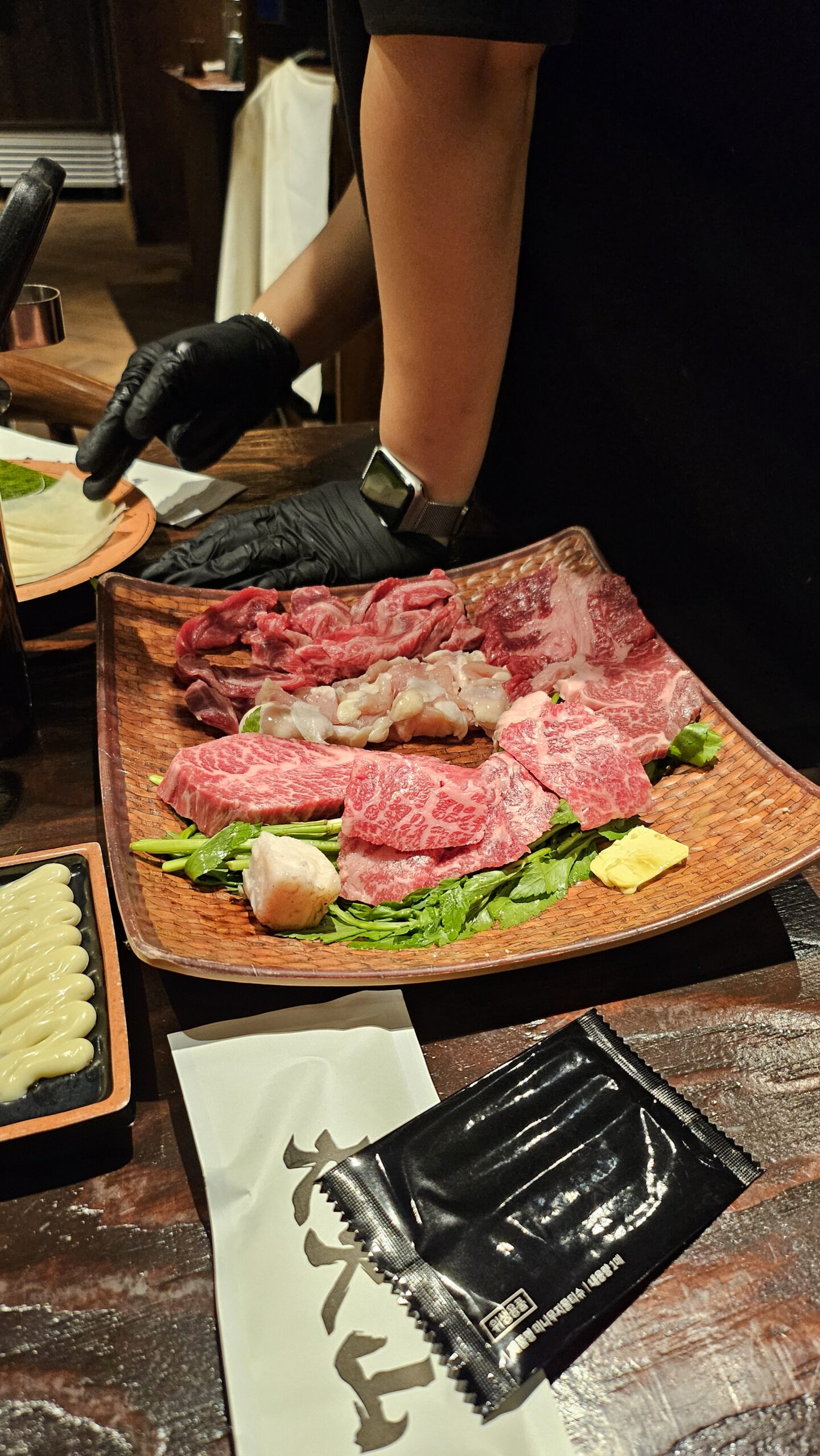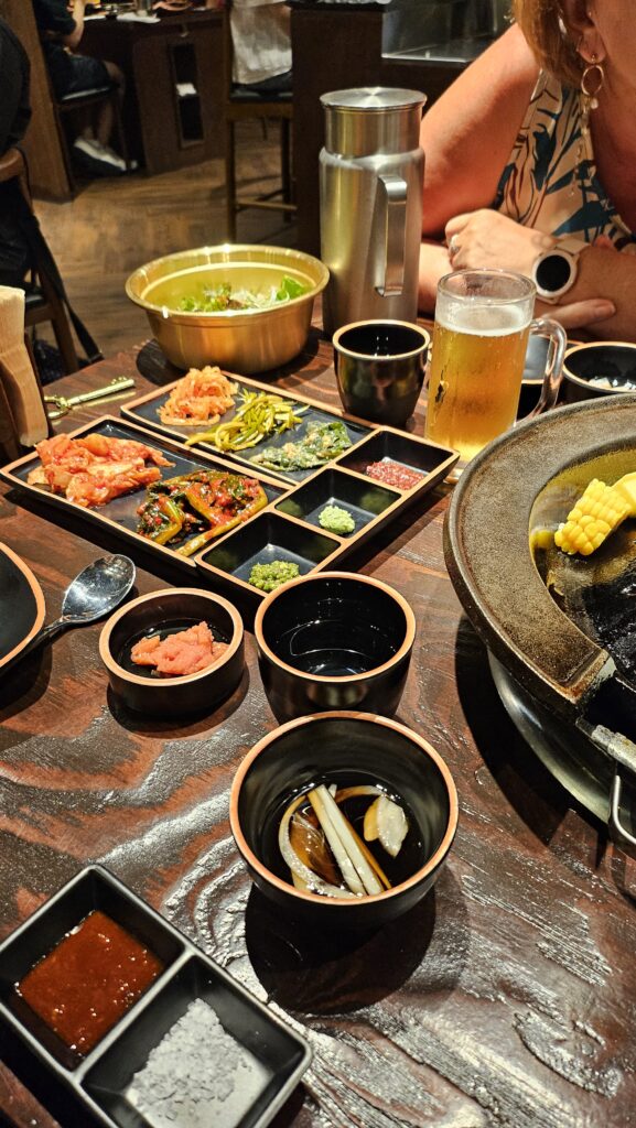 Le serveur nous propose une formule pour 3 à 74 000 won comprenant principalement du bœuf wagyu du Japon. La viande est servie, comme d’habitude avec plusieurs accompagnements et sauces.