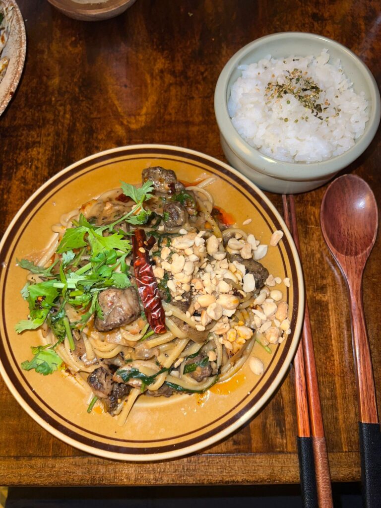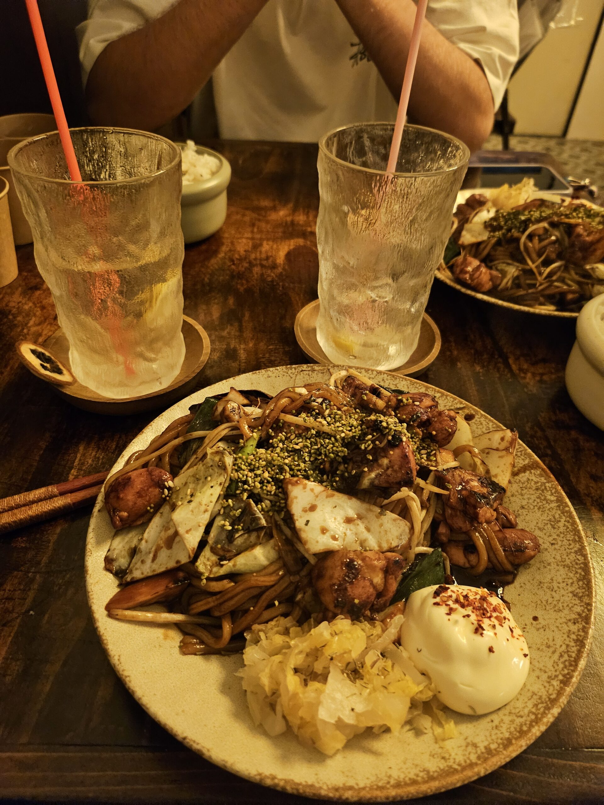 Le restaurant est tenu par un couple sympathique. Il ne dispose que de 4 tables ! On a du attendre environ 3/4 d’heure qu’une table se libère avant de pouvoir nous installer. Les plats proposés sont atypiques. Nous choisissons du poulet sauce soja et Udon pour nous et pour Mathias, de l’agneau à la sauce épicée. On se régale.