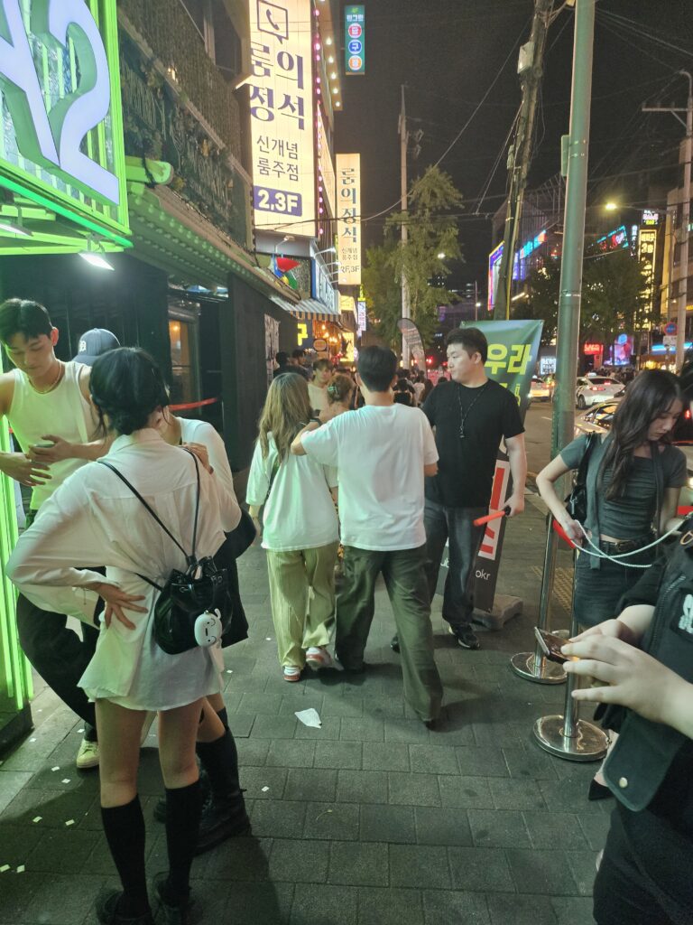 Après cet excellent dîner, on s’attarde dans les rues très animées de Hongdae pour profiter une dernière fois de cette vie nocturne. Il y a de la musique dans la rue. La jeunesse Coréenne attend de pouvoir entrer dans les boîtes de nuit. De longues files d’attente se forment.