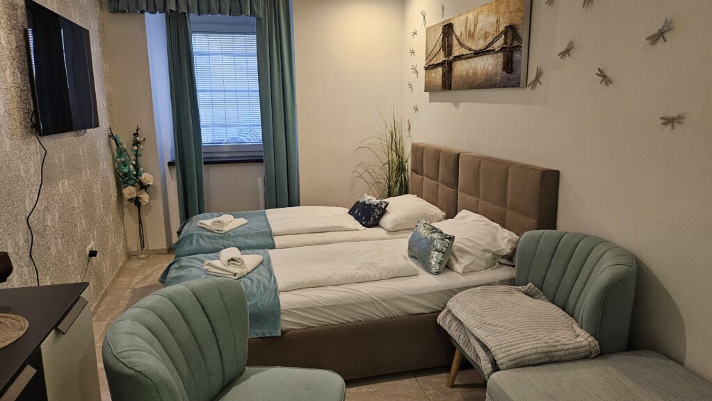 Nous atterrissons à 10h35 comme prévu. Pour 3€30 par personne un bus nous amène à Tivoli dans le centre de LJUBLJANA. Notre logement est à 1,6 km de Tivoli, au 4 de la rue Soteska. Il nous faut environ 25 mn à pied pour arriver au pied de la porte. Nous récupérons la clef dans la boîte codée. Nous ouvrons et nous entrons.