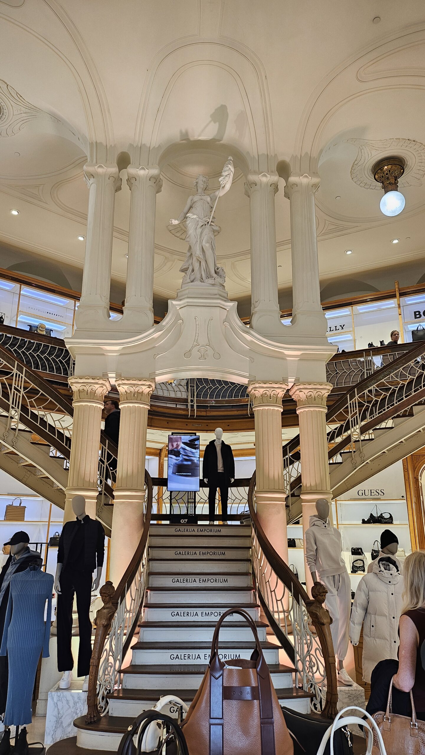 On accède à la partie couverte dans le magnifique bâtiment architectural signé Plecnik par une petite porte (sous l’inscription « Pokrita » en lettres noires). Nous pénétrons alors dans une halle de bouchers, de charcutiers et de crémiers. Un petit escalier en colimaçon caché, nous amène à l’étage, aux étales des poissonniers.