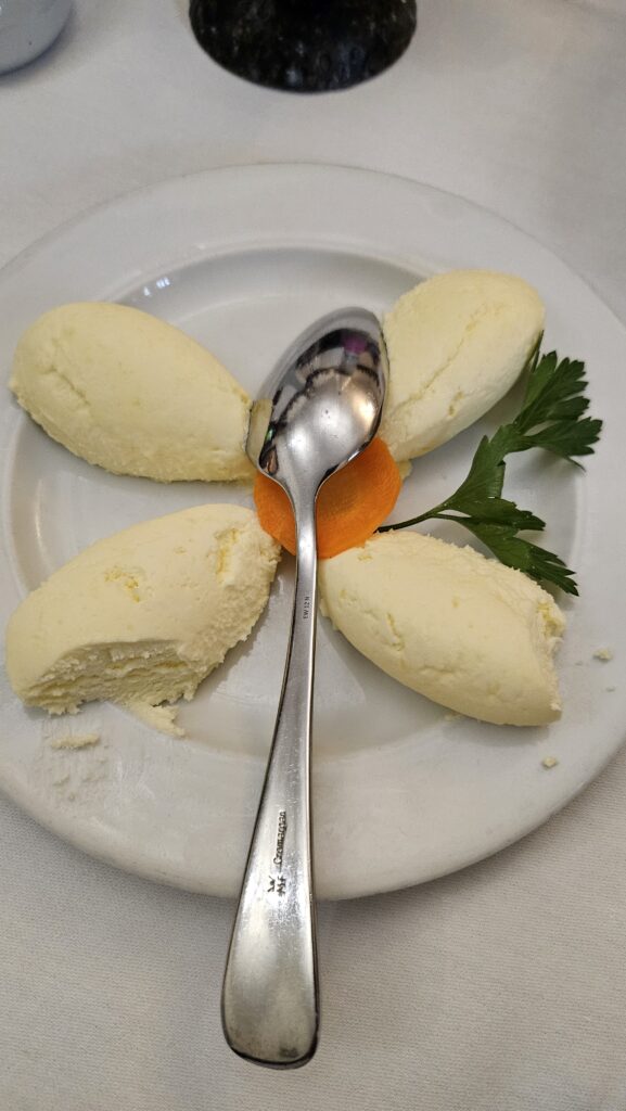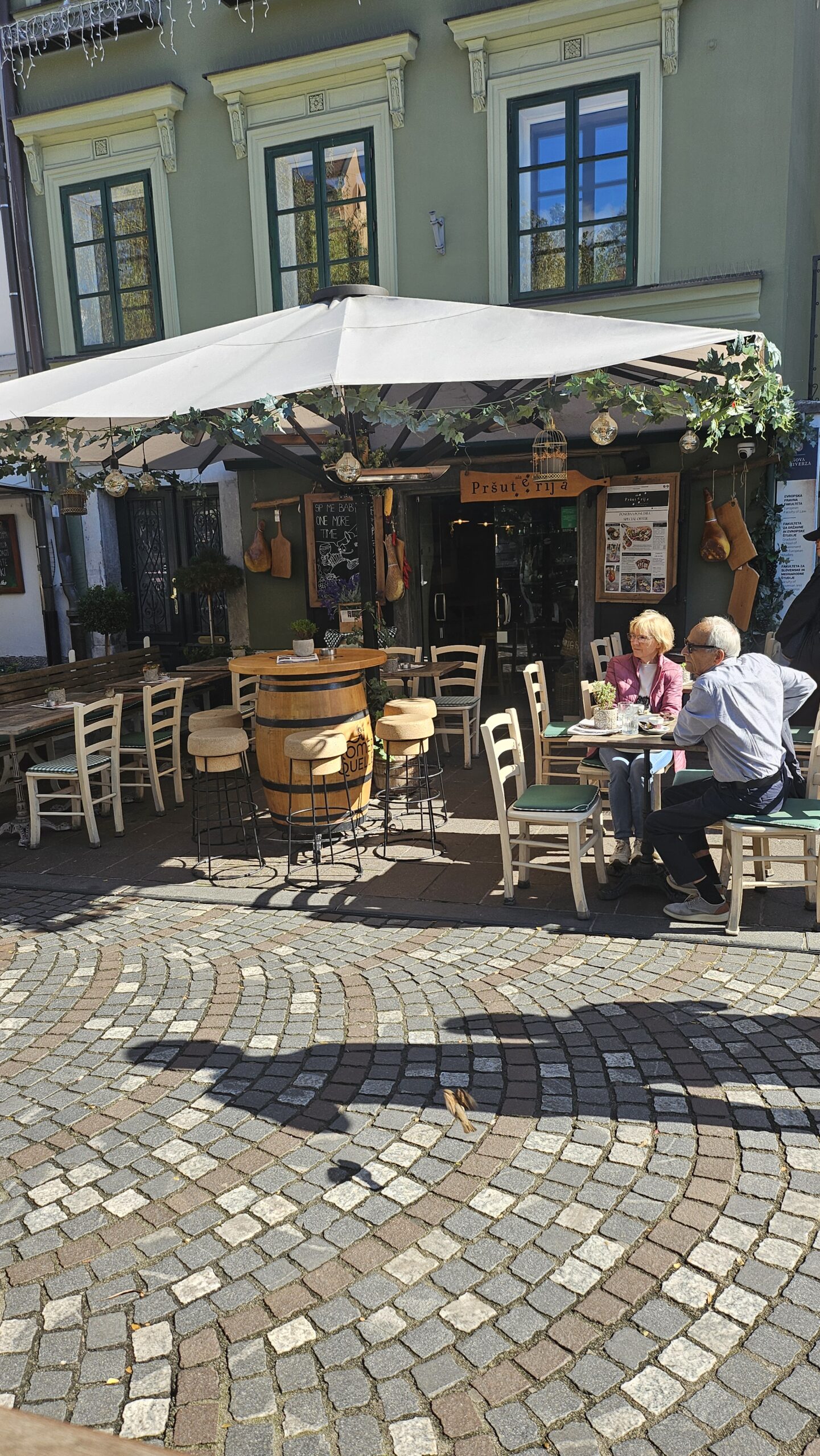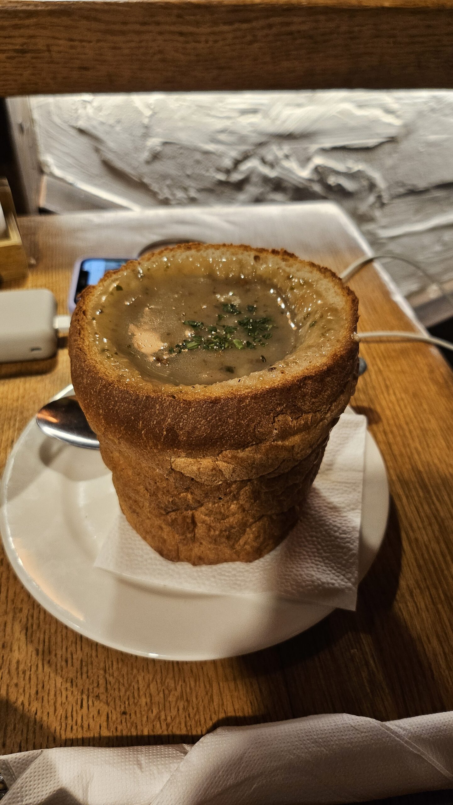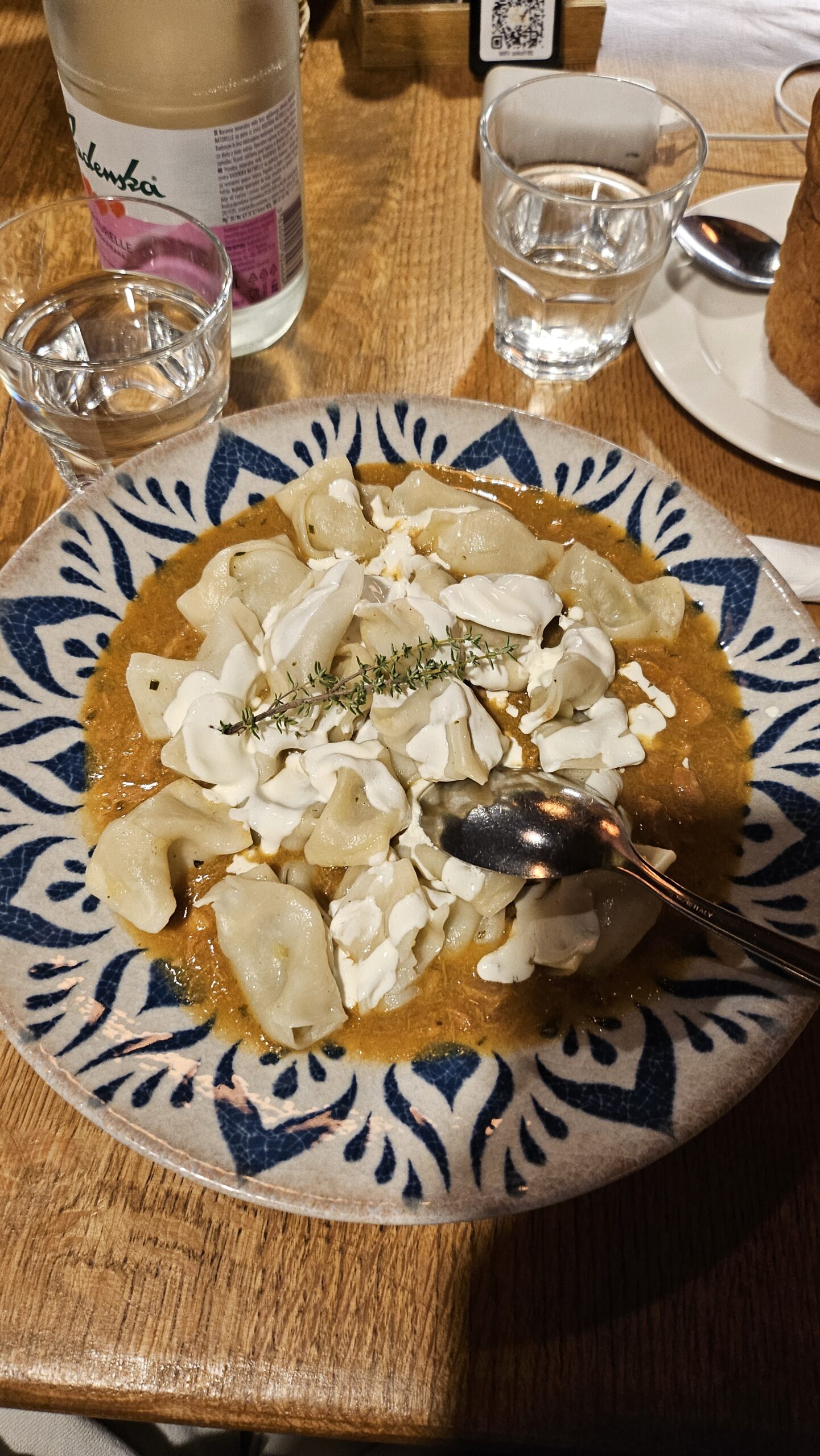 On se laisse tenter par 2 spécialités qu’on partage : Une soupe de champignon servie dans un pain fabriqué spécialement et des Zlikrofi, sorte de « raviolis » au cottage cheese avec une sauce tomate et du veau effiloché. Les plats sont bons, copieux et … très nourrissants ! Ce n’est pas ici qu’on fera le régime !