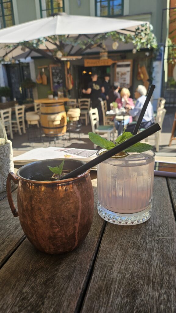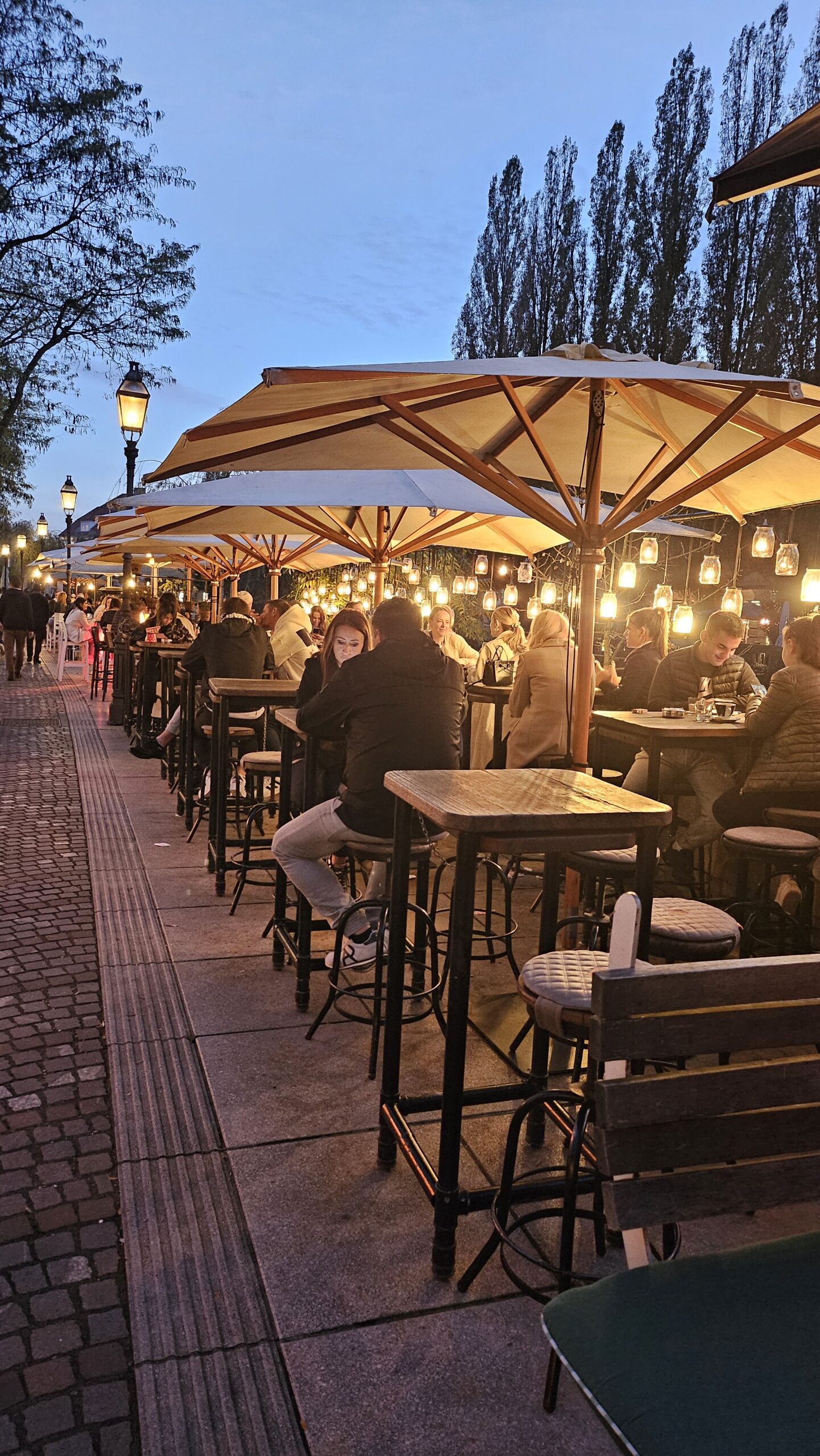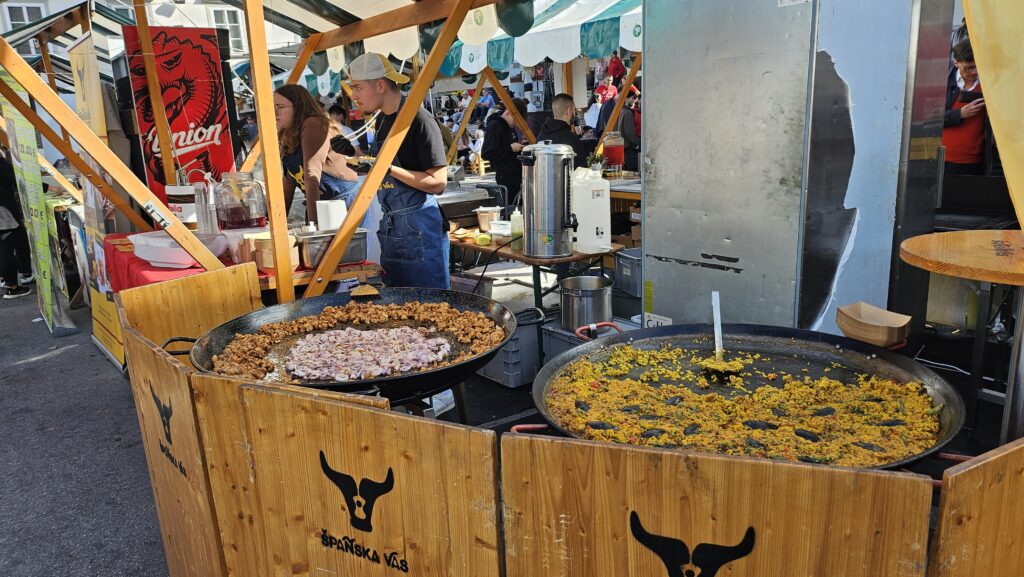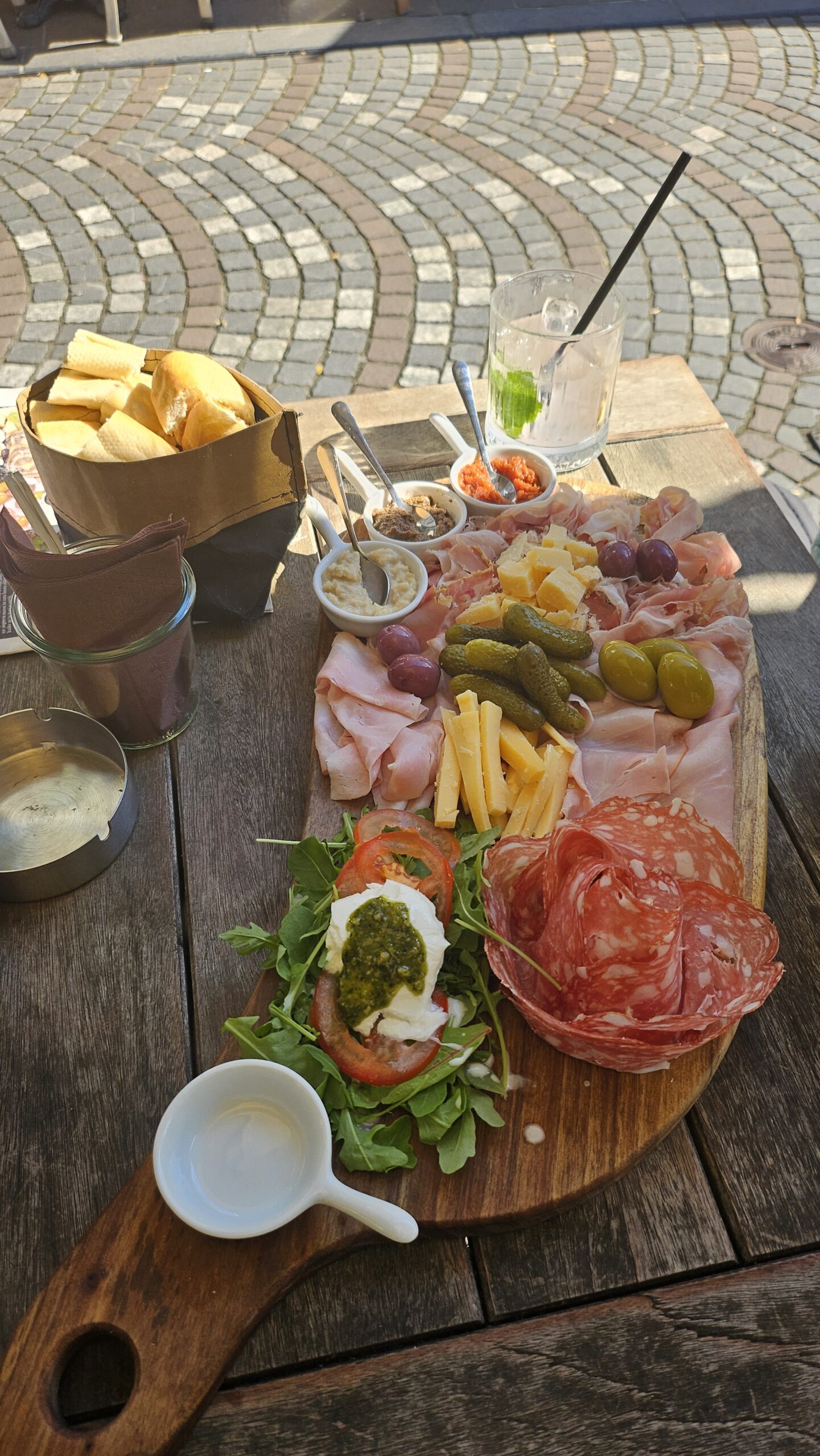Nous profitons du beau temps pour déjeuner au bord de la rivière Ljubljanica, sur la terrasse d’un bar à tapas, le Ala Pršuterija. En plus des cocktails, ce bar propose des planches de charcuteries et fromages locaux, excellentes. 3 tailles possibles: Small, Medium et Large. La planche sur la photo est une médium, largement suffisante pour 2 personnes. L’endroit est chaleureux. Le service est parfait. Je recommande !