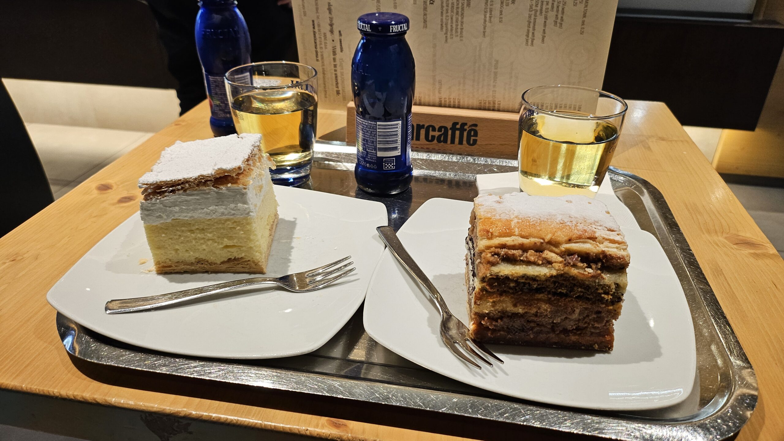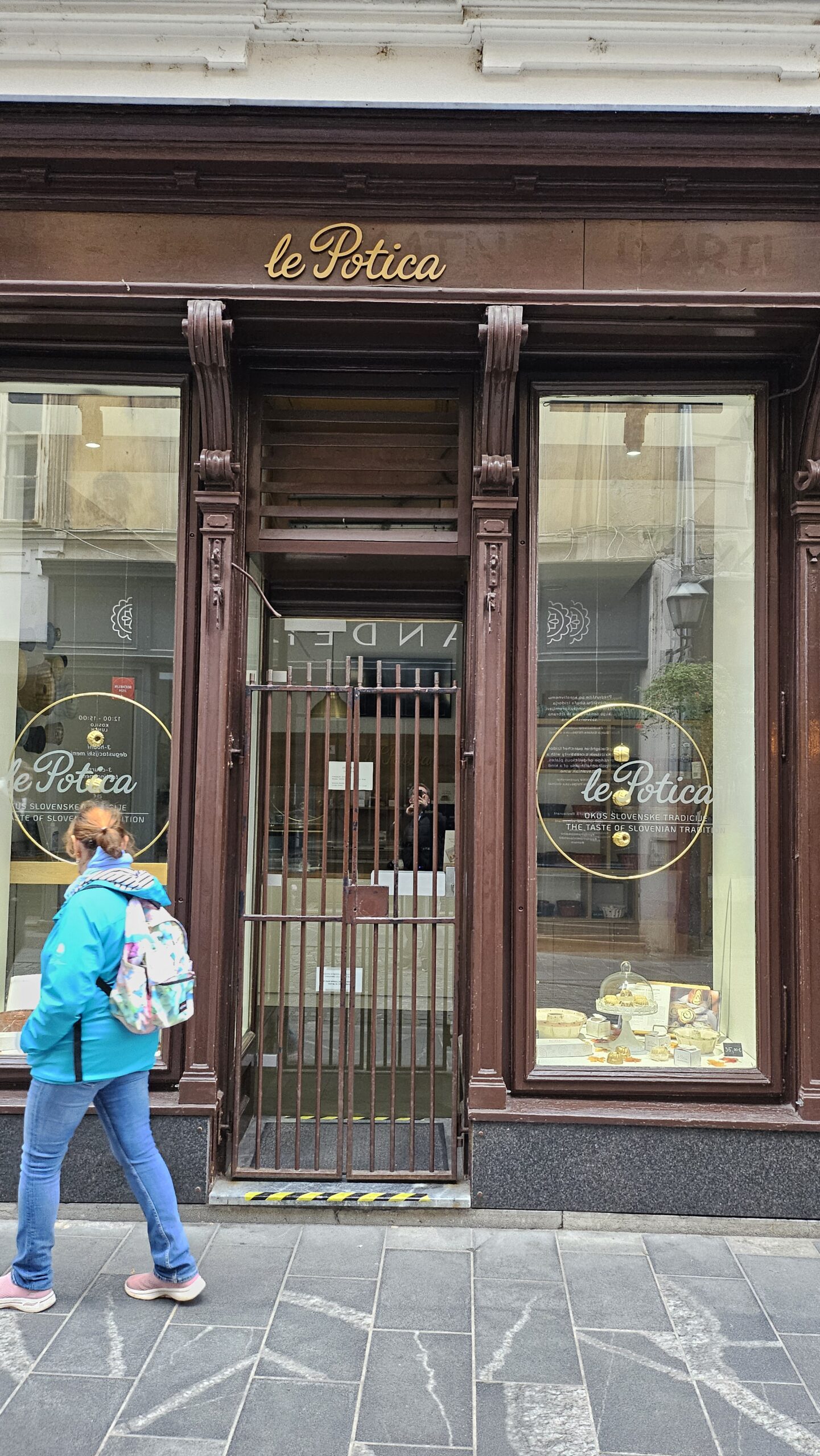 Pour compléter notre petit déjeuner pris à l’appartement et continuer la découverte des spécialités slovènes on achète des Potica dans la boutique du même nom (Butik le Potica). C’est un gâteau roulé farci. Il est proposé en bouchée individuelle en différentes saveurs : Noix, Chocolat, noisettes, prunes. Le Potica me fait penser un peu au Muffin. Bonne découverte.
