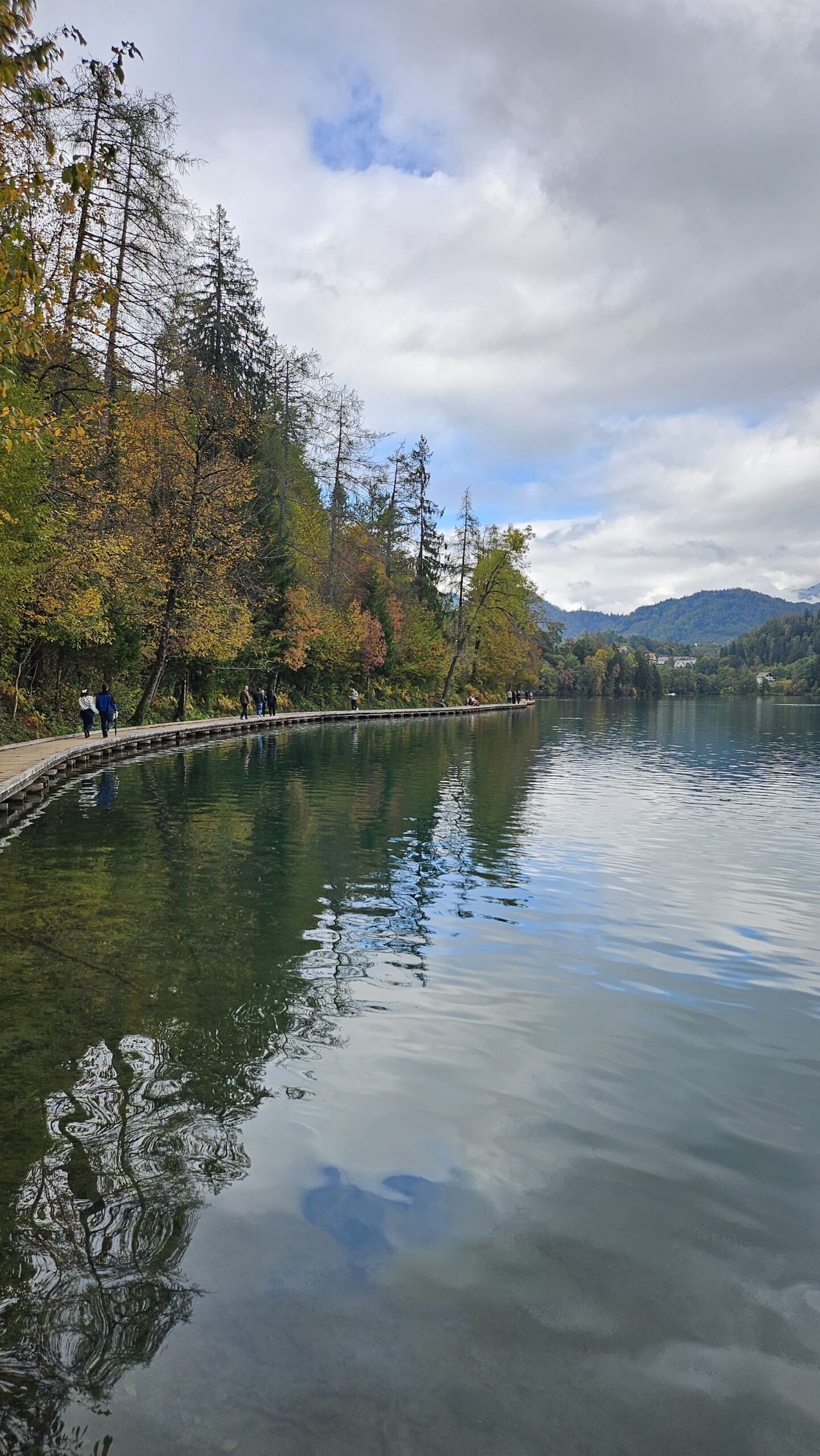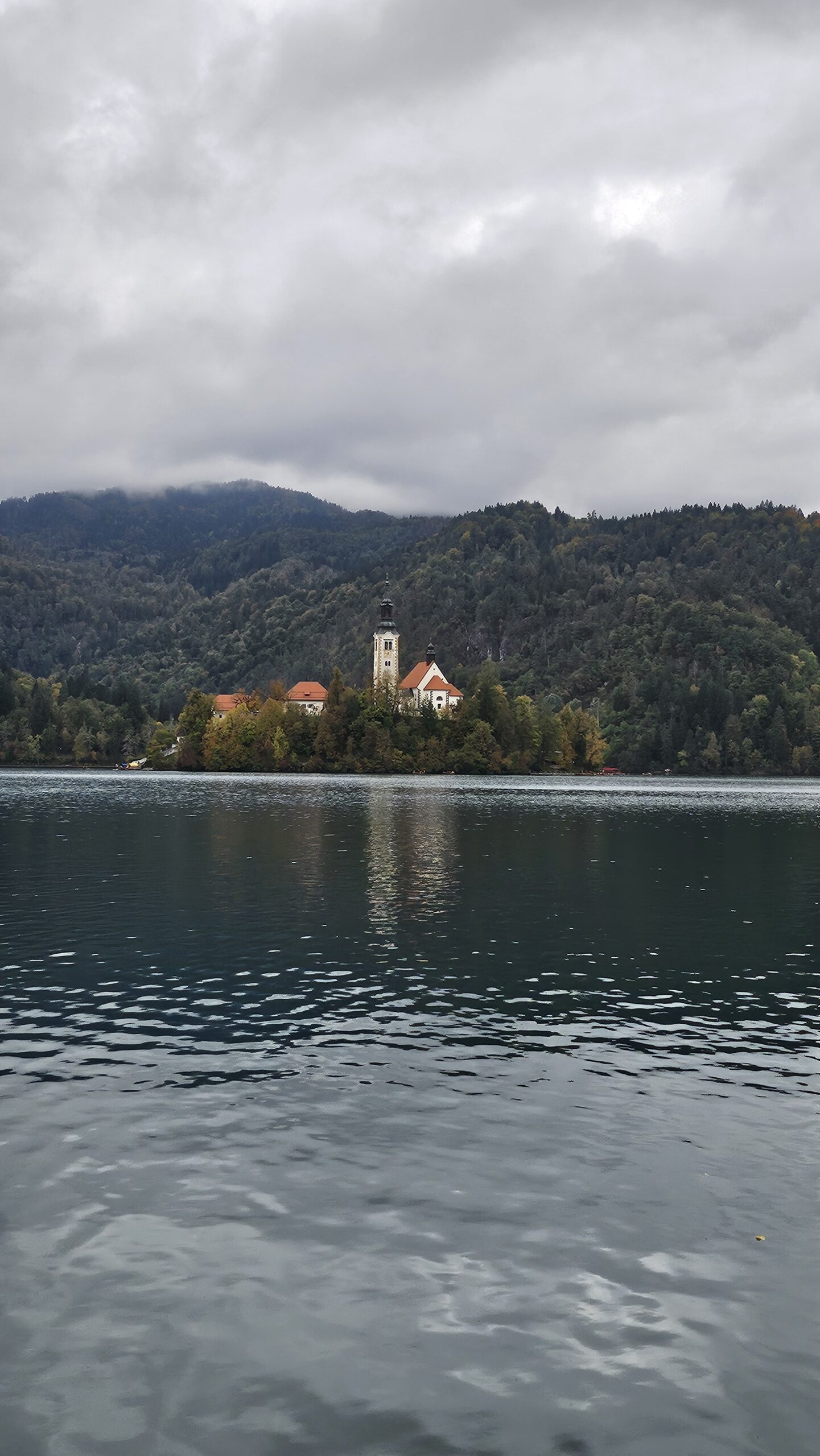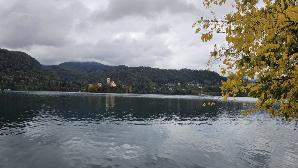 Ce tour du lac à pied permet de passer un moment paisible et agréable. En marchant, on admire la petite île et l’église sous toutes les coutures. L’angle de vue change en permanence. Les couleurs automnales sont superbes. Il manque juste un peu de soleil pour sublimer les paysages.
