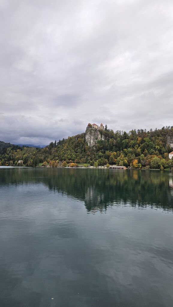 Nous arrivons à BLED vers 11h45. Avant de demarrer notre tour du lac à pied, nous dégustons une kremšnita le gâteau traditionnel de Bled.