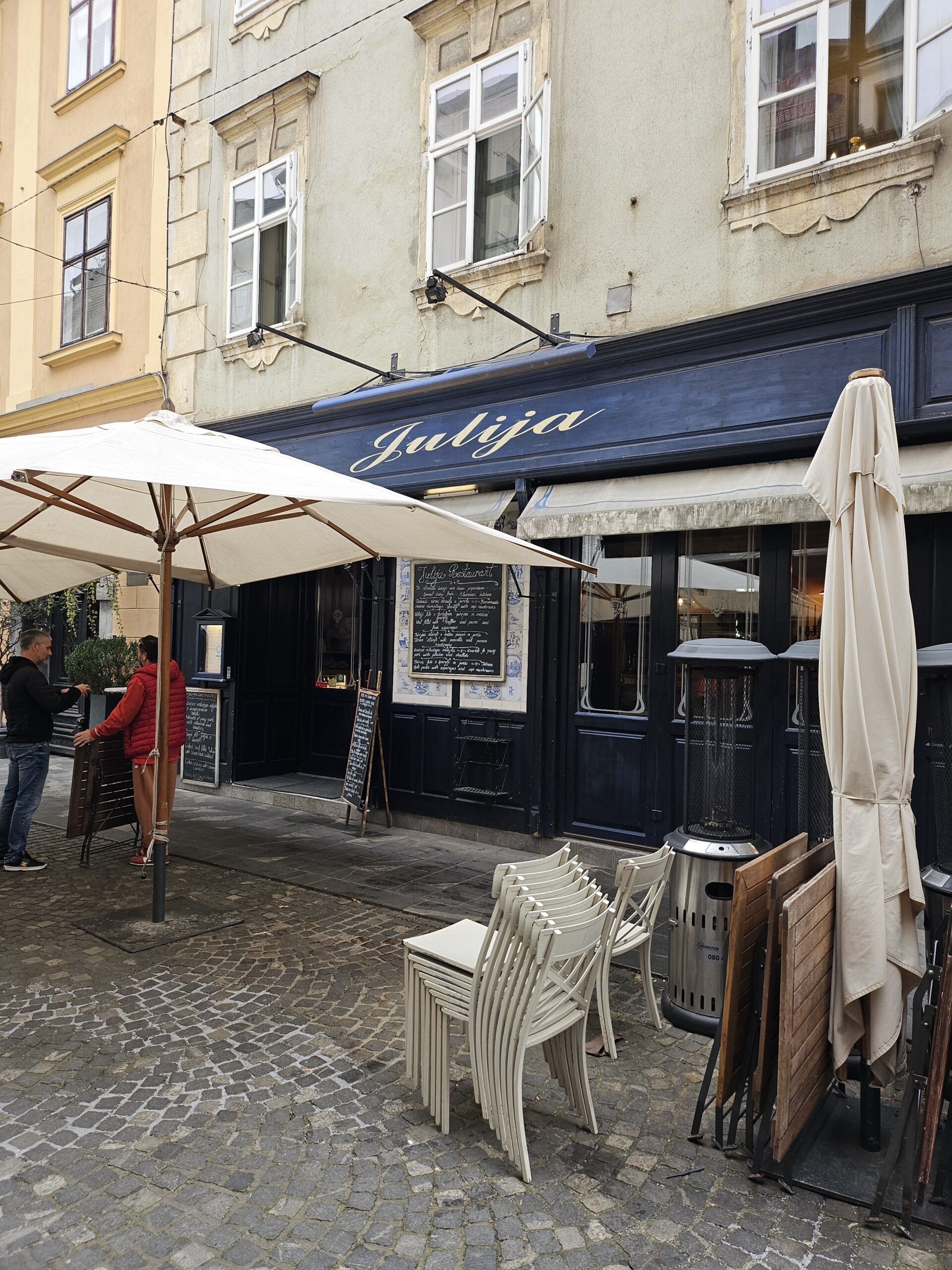 Pour notre premier déjeuner à Ljubljana, nous suivons les conseils de Google et nous nous installons à une table du restaurant Julija, au cœur de la vieille ville, à 10mn à pied de notre logement.