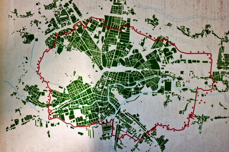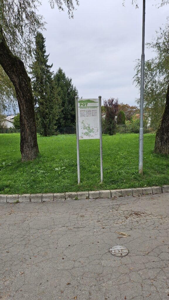 Du 23 février 1942 au 9 mai 1945, Ljubljana était la seule capitale de la Seconde Guerre mondiale à être entièrement entourée d’un système de fortifications composé de barrières grillagées, de passages fortifiés et de bunkers. Le POT (sentier en slovène) est le chemin commémoratif de cet encerclement. Nous le suivons à vélo sur plusieurs kilomètres. Il est indiqué par des panneaux vert et blanc