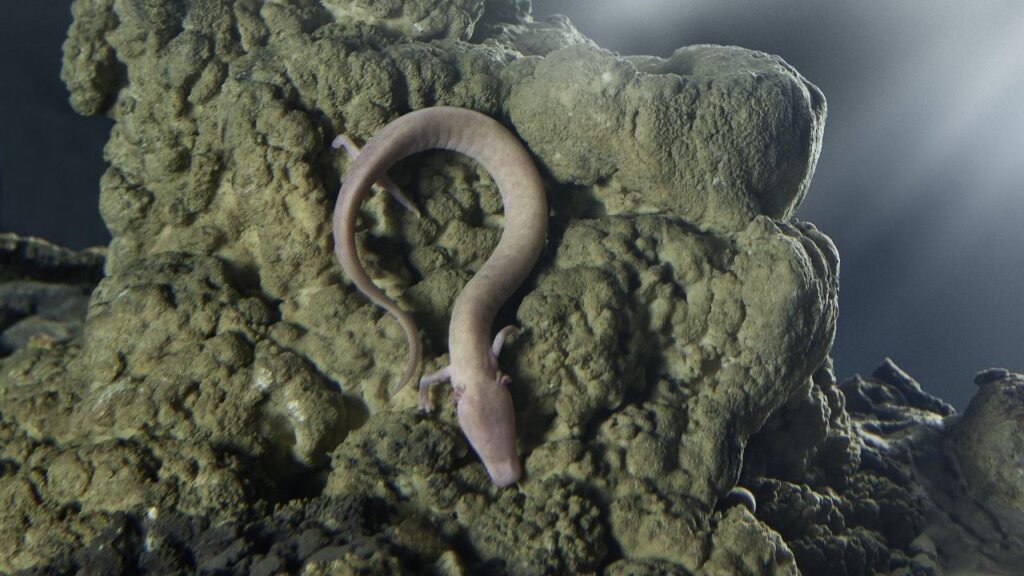 Ces « bébés dragons » ont un corps allongé comme un serpent, avec une longueur de 25 à 30 centimètres. Ils font partie des plus grands prédateurs des cavernes. Leur peau est pâle avec une teinte rosâtre et elle semble presque transparente. Ils ont de petites et courtes pattes avec trois doigts sur celles de devant et deux sur celles de derrière. Ils se déplacent dans l’eau à la façon d’un serpent, les pattes les aidant simplement à bouger. Bien que les animaux adultes n’aient pas d’yeux, ils peuvent tout « voir » malgré tout, grâce à des récepteurs dans la peau et ils sentent très bien leurs proies. Leur peau est extrêmement sensible à la lumière. Ils peuvent survivre sans nourriture jusqu’à 12 ans et vivre jusqu’à 100 ans.