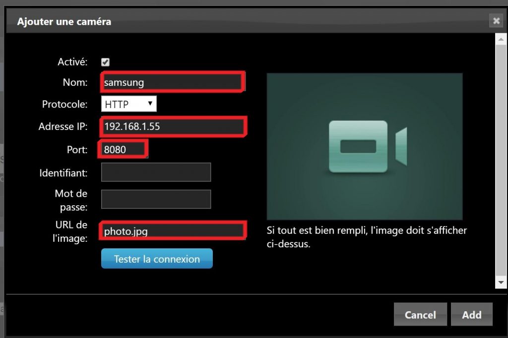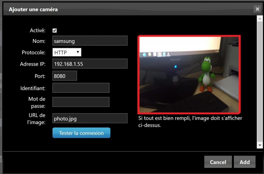 Cliquer sur Tester la connexion. Une image du flux vidéo doit apparaître dans le cadre (encadré rouge dans l’image ci dessous).