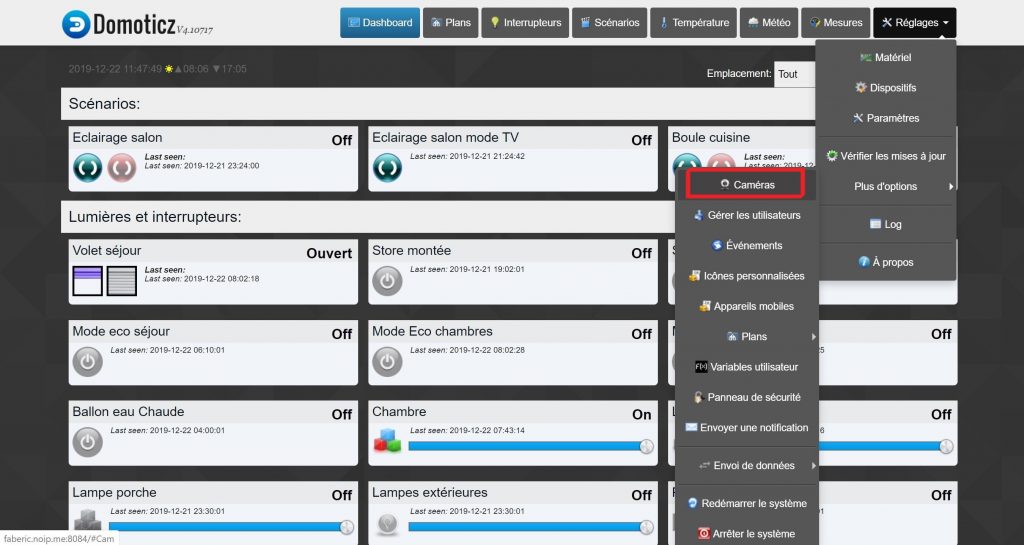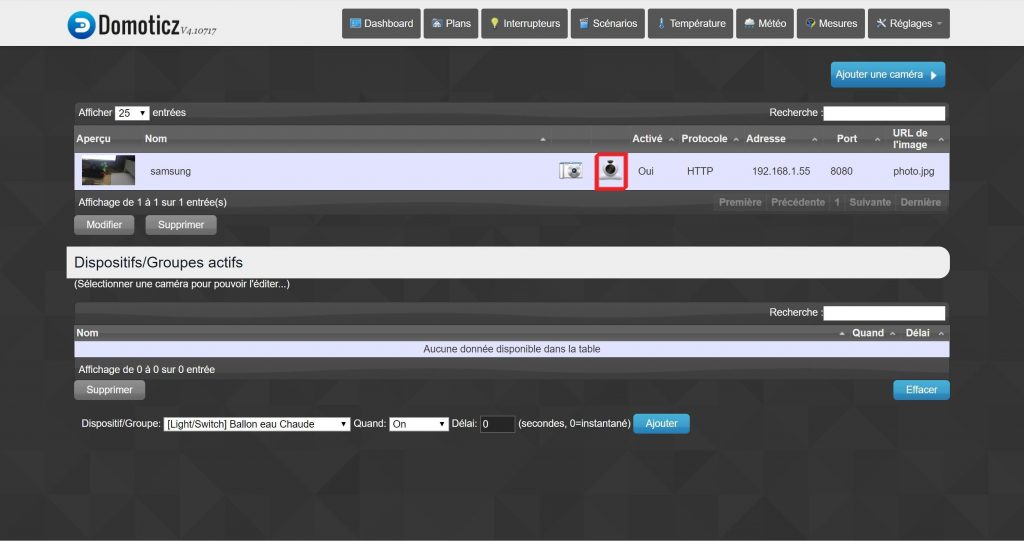 Vous pouvez maintenant visualiser le flux vidéo du smartphone à partir de l’interface de DOMOTICZ en cliquant sur l’icone de la caméra (encadré en rouge dans l’image de la page ci dessous)