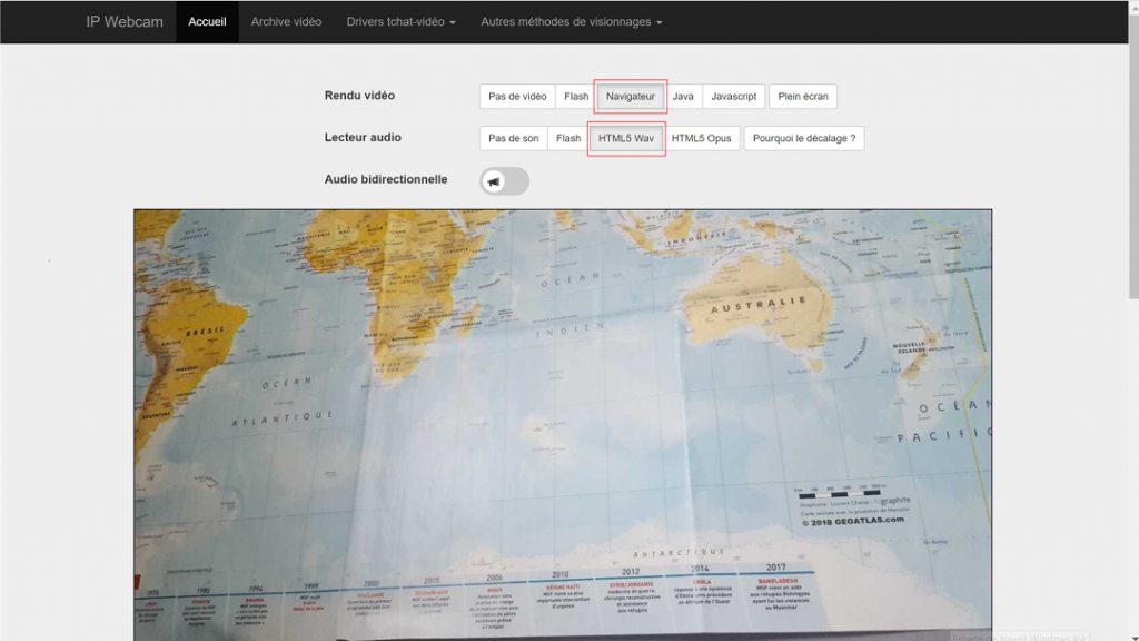 Cliquer sur les onglets Navigateur et HTML 5 Wav pour restituer sur l’écran de l’ordinateur, l’image et le son, transmis par le smartphone.